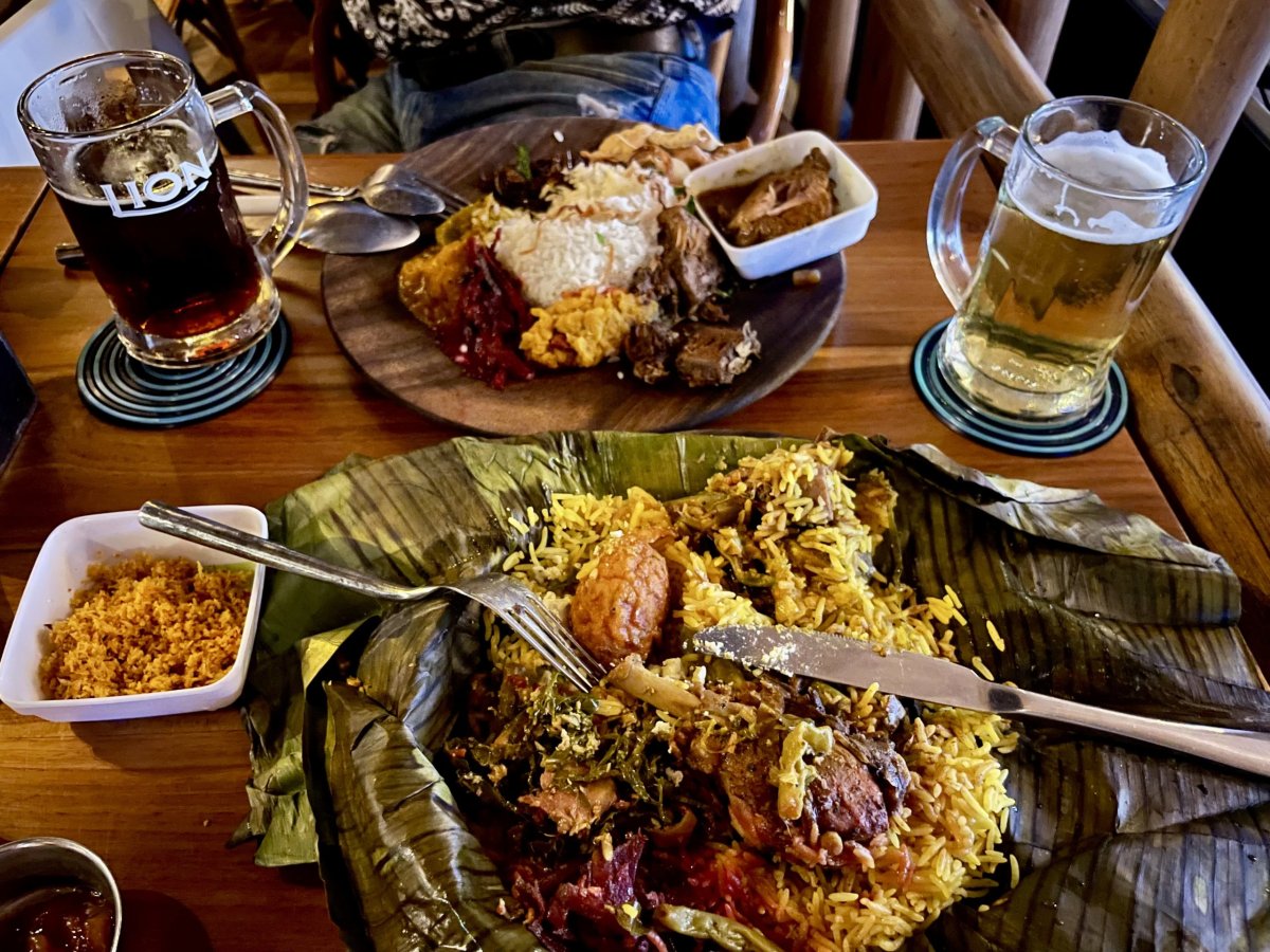 Před polednem už sedáme do auta směrem na vlakovou stanici Nanu Oya. Kolem čtvrt nás Malith ujišťuje, že ten šálek čaje uprostřed plantáží Edinburgh stihneme, páč jsme už jen kousíček. No necháváme ho nedopitý a na platformu to musíme doběhnout, aby nám vlak 12.40 neujel. Peron úplně narvaný většinou turisty, tak pasy nikdo nekontroluje a vyjíždíme docela na čas. Em slupne oběd a usíná a my vychutnáváme klidnou jízdu zelenou krajinou spolu s Masala čajem podávaným pěkně horký přímo z várnice ve voze spolu s nějakými oříšky, kukuřici a smaženým něco. Výhodu zavřených dveří první třídy ale nepociťujeme, protože průvodčí sám pobízí pasažéry k fotce v záklonu z jedoucího vagonu. A že už tam pár smrťáků bylo. Nechám se ukecat, ale záklon fakt nedám. Ruce svírající madla jako život mi trnou stejně jako celé tělo. Ještě že mám dnes oblečené hnědé kalhoty. Za asi tři hoďky jsme v cíli. Příjemná změna, ale zase taková pecka to není. Koleje téměř po celé délce lemuje silnice, takže když se při nákupu jízdenek nezadaří, auto to jistí. Malith nás už čeká na zastávce v Ella, cesta autem je tedy evidentně rychlejší. Projdeme odpolední horské městečko a zakotvíme na lumprais - rýži, chicken curry a smaženým vařeným vejcem s lilkem, zamotané a uvařené v banánovém listu. Spolu s okurkovým pivem to byla velmi zajímavá kombinace.
