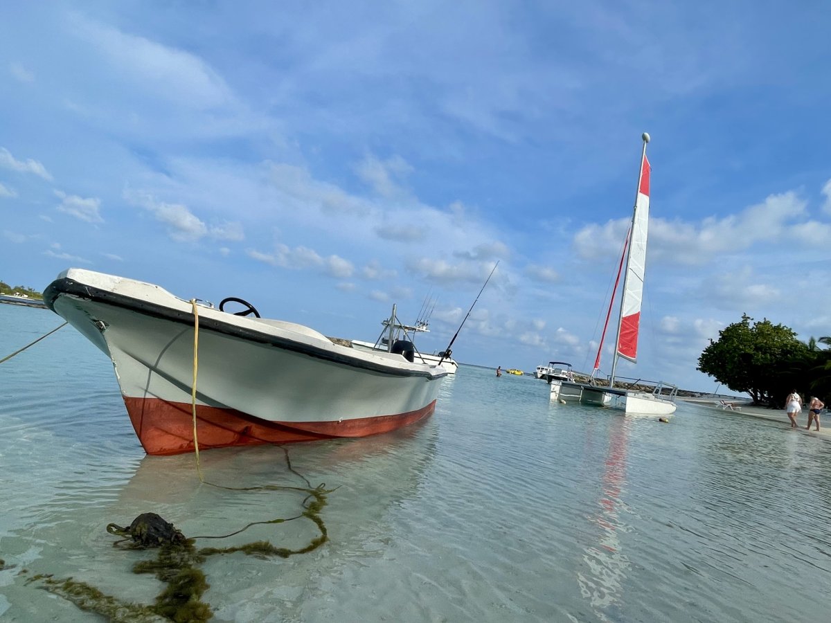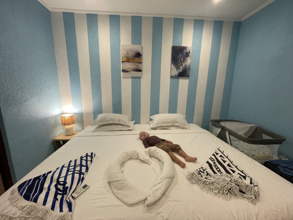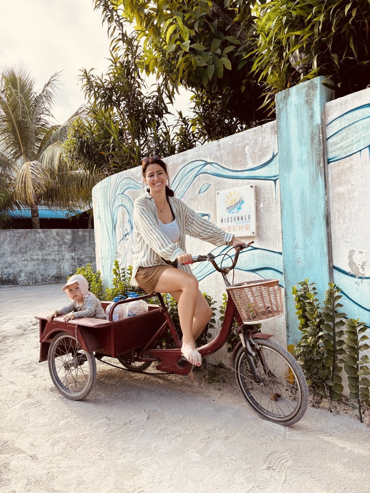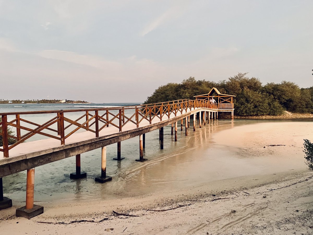 Kolem 17. hodiny sedíme na palubě a asi za hoďku už z výšky žasneme nad ostrůvky jednotlivých atolů roztroušených v tyrkysových vodách. Na ostrovech panuje přísná prohibice, a tak i Alpa v odbaveném kufru je důvodem k celní kontrole. Nakonec ale jen mrknou na naše mimino a pouští nás dál. Vybrat z množství ostrůvků, který navštívit, byl oříšek. Naší rozhodovací paralýzu ale usnadnila vzdálenost a jízdní řád speedboatů, čímž se možnosti dost zúžili a vítězem se stal lokální ostrov Thulusdoo. Speedboat odjíždí o půl deváté, takže máme dvě hodinky. Jsme unavení, tak se nám nikam chodit nechce. Ale Em už je přestimulovaná, což se projeví neustálým lítáním po letišti, a tím pádem peklem pro nás. Sotva ale speedboat přesně na čas zapne motor, Em usne a spí až do rána.