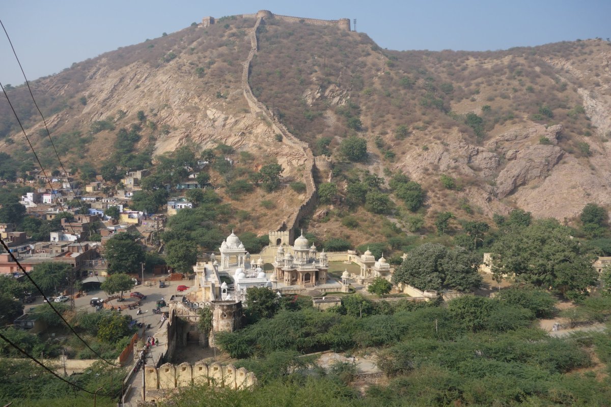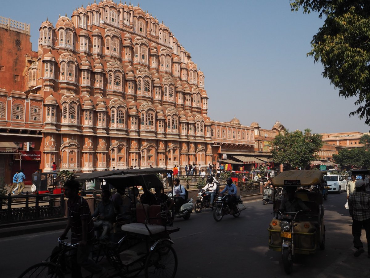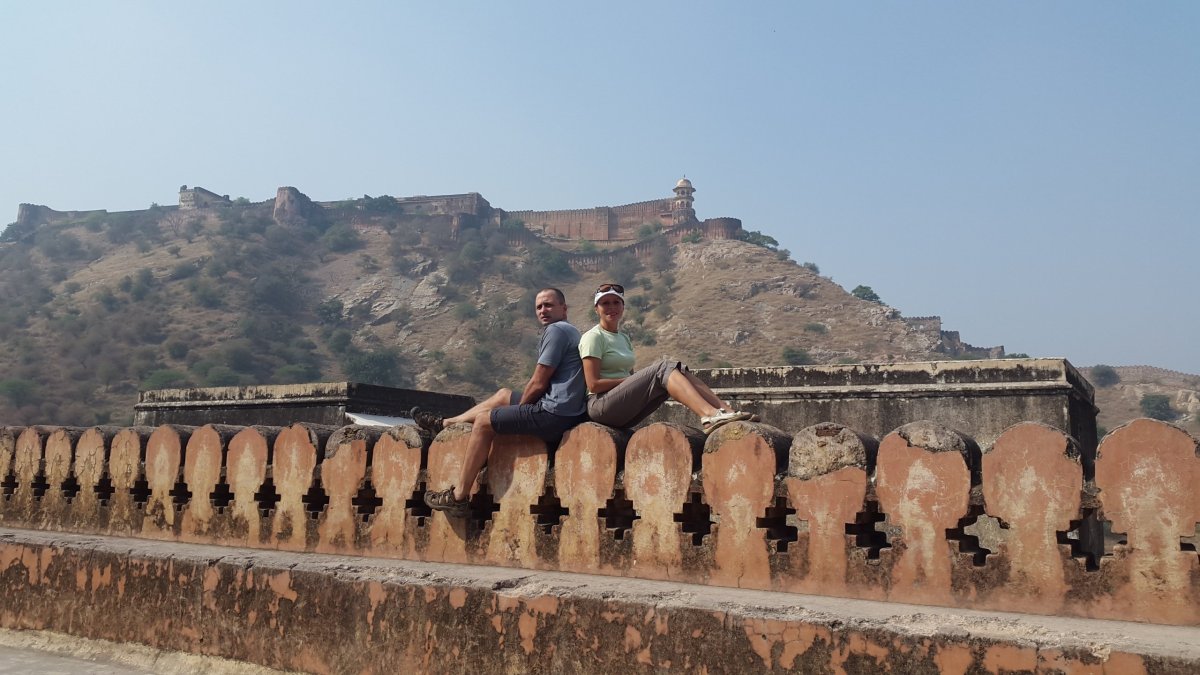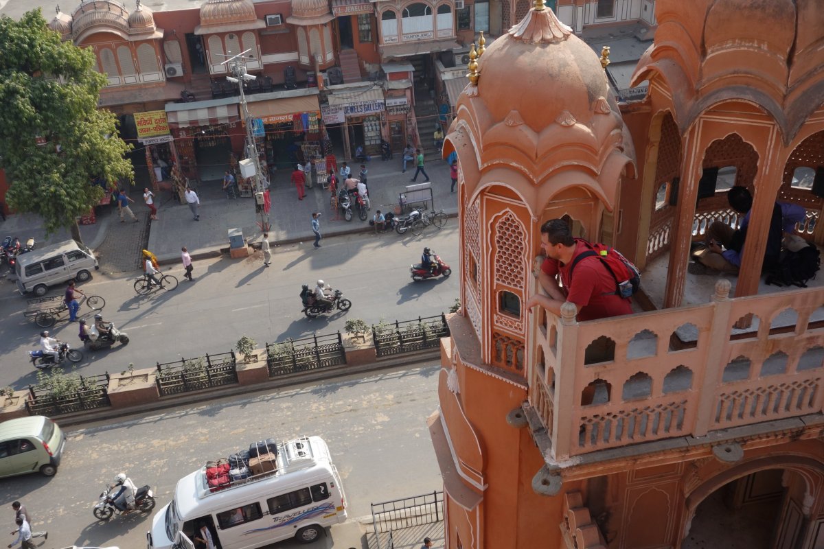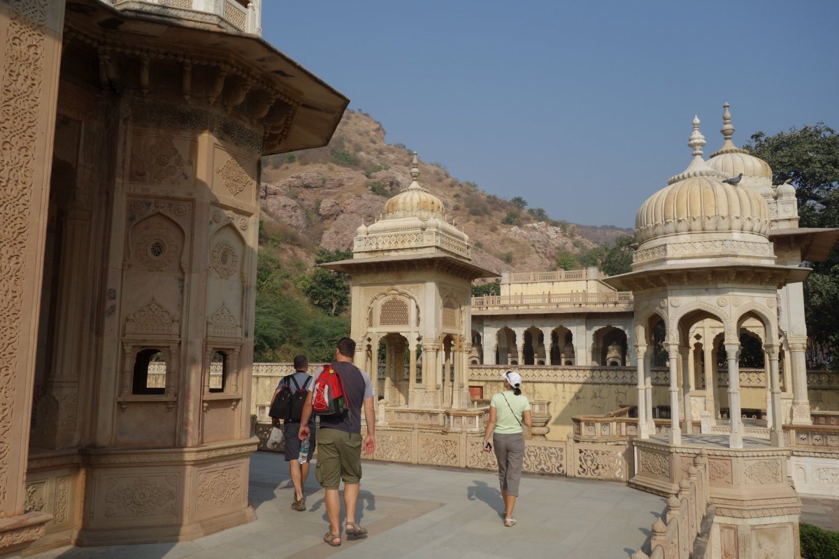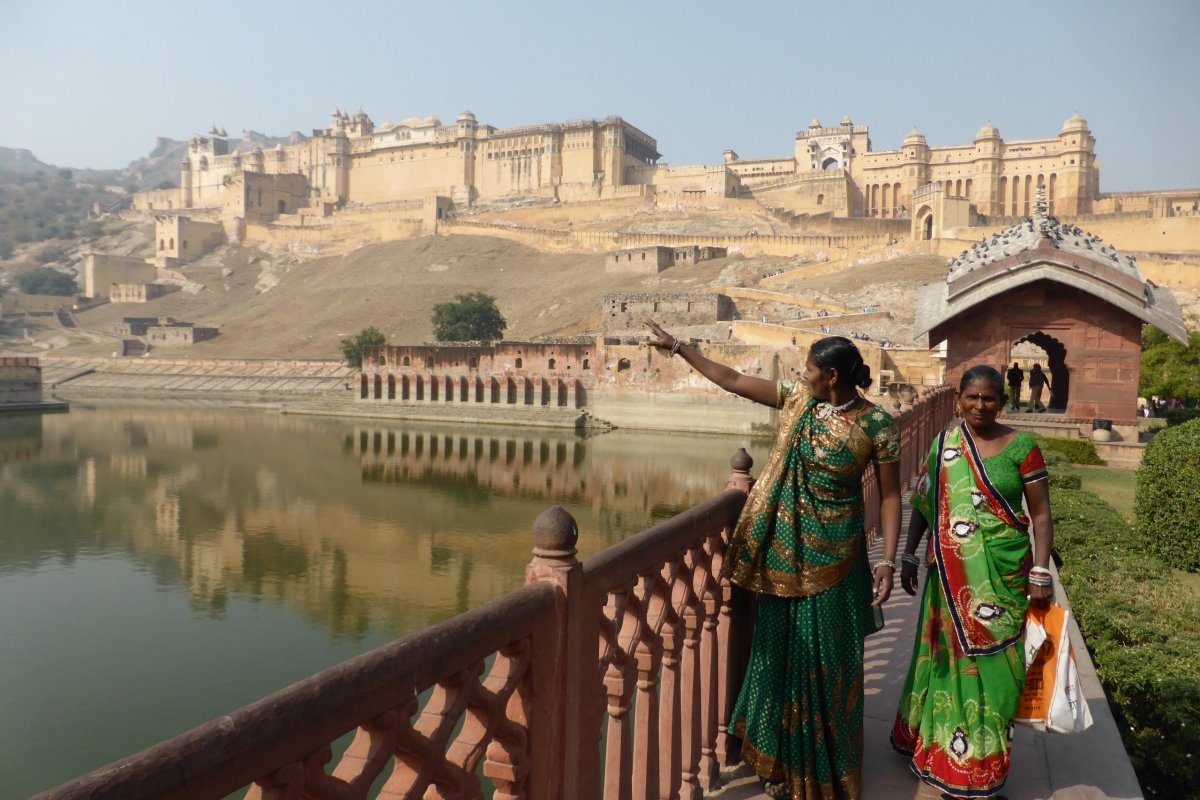 16.11. Indickým vlakem té nejobyčejnější třídy (sleeper class) jedeme do Jaipuru, kterému se také říká „růžové město“. Jaipur byl založen roku 1727 a žije zde více než 5 milionů obyvatel. Navštěvujeme palác Hawa Mahal postavený z červeného a růžového pískovce. Byl vybudován proto, aby ženy z královské rodiny mohly sledovat pouliční festivaly, aniž by byly vidět. Tvar stavby má připomínat Krišnovu korunu. Pětipodlažní palác má 953 malých oken zdobených složitými mřížemi. Přejíždíme tuktukem do Gaitore Ki Chhatriyan. Je to shluk královských hrobek, klidné a krásné místo kousek od centra Jaipuru. Popojíždíme k pevnosti Ambér (též Žlutá pevnost) ležící u břehů umělého jezera Maoto. Je z červeného a bílého pískovce a z mramoru.