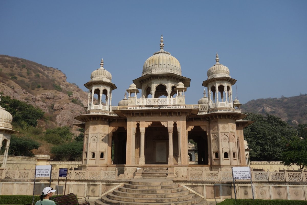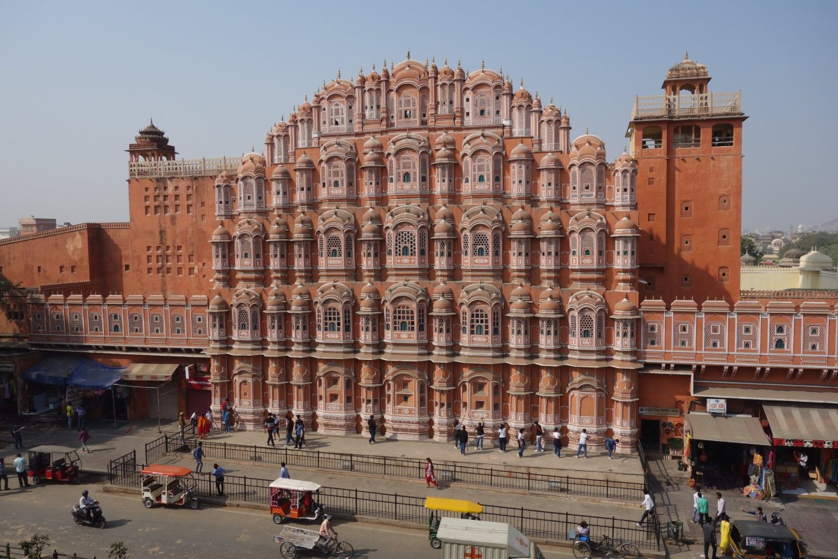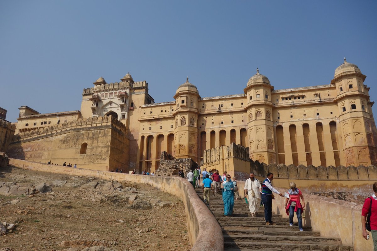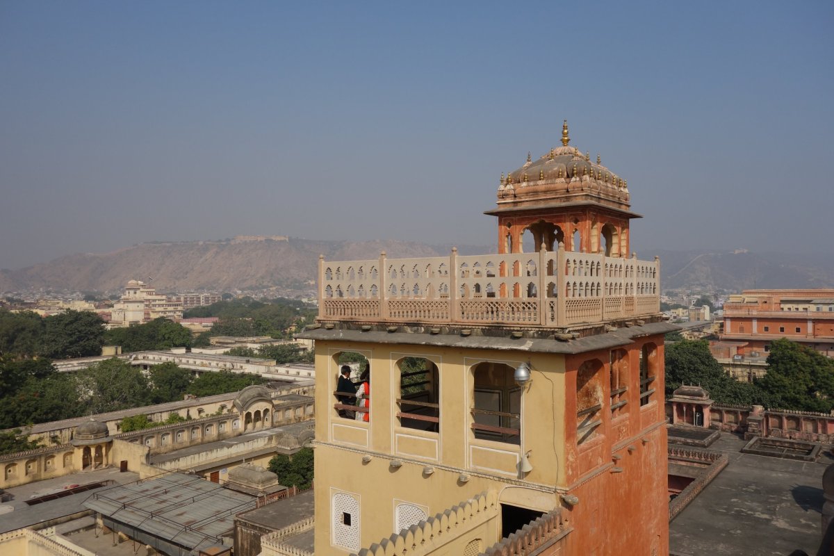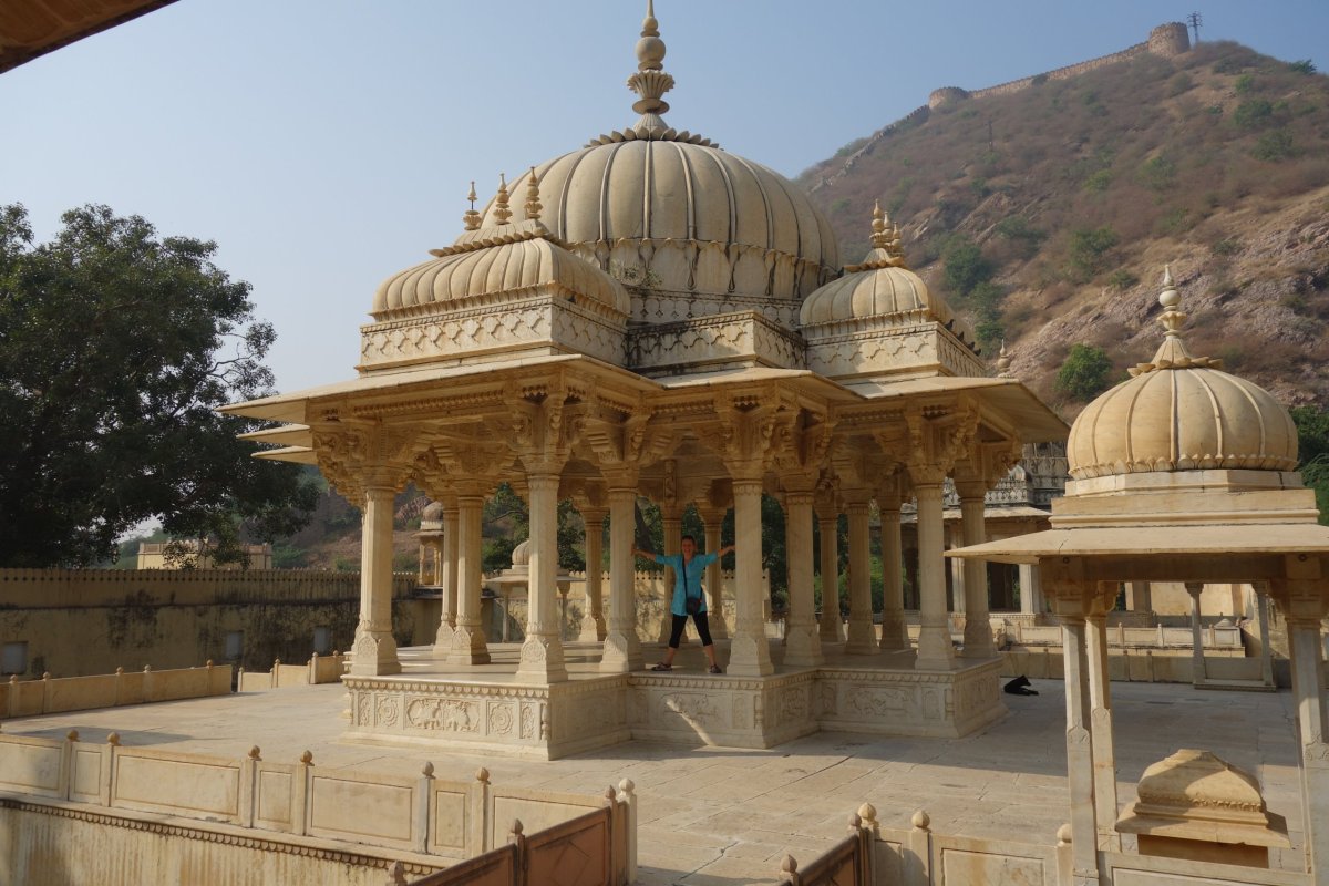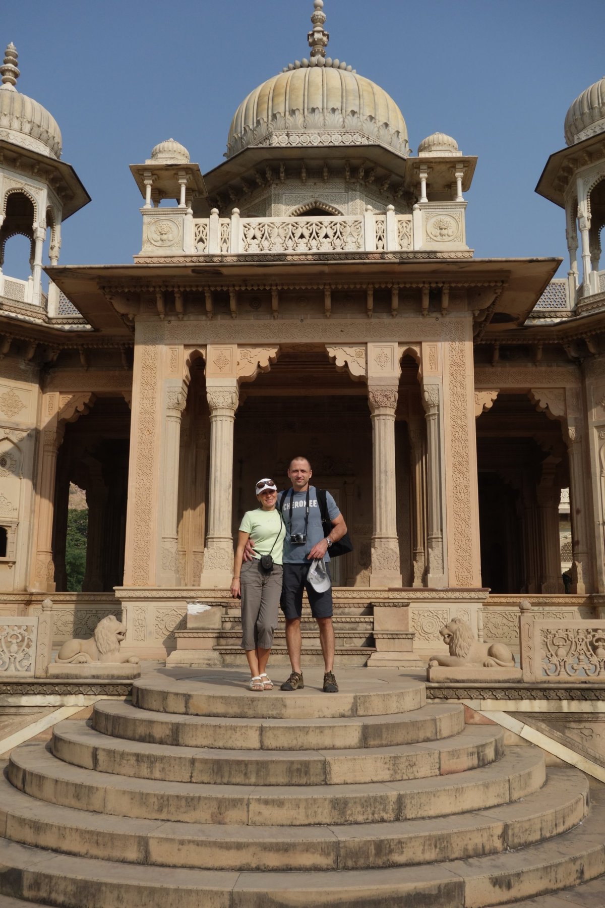16.11. Indickým vlakem té nejobyčejnější třídy (sleeper class) jedeme do Jaipuru, kterému se také říká „růžové město“. Jaipur byl založen roku 1727 a žije zde více než 5 milionů obyvatel. Navštěvujeme palác Hawa Mahal postavený z červeného a růžového pískovce. Byl vybudován proto, aby ženy z královské rodiny mohly sledovat pouliční festivaly, aniž by byly vidět. Tvar stavby má připomínat Krišnovu korunu. Pětipodlažní palác má 953 malých oken zdobených složitými mřížemi. Přejíždíme tuktukem do Gaitore Ki Chhatriyan. Je to shluk královských hrobek, klidné a krásné místo kousek od centra Jaipuru. Popojíždíme k pevnosti Ambér (též Žlutá pevnost) ležící u břehů umělého jezera Maoto. Je z červeného a bílého pískovce a z mramoru.
