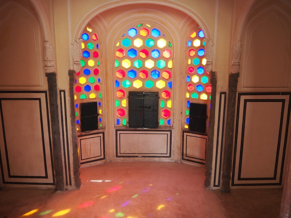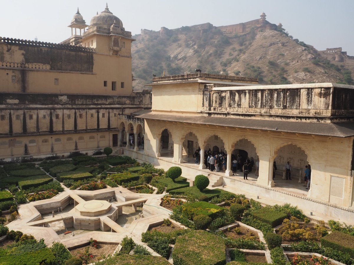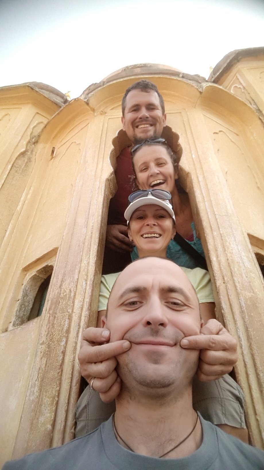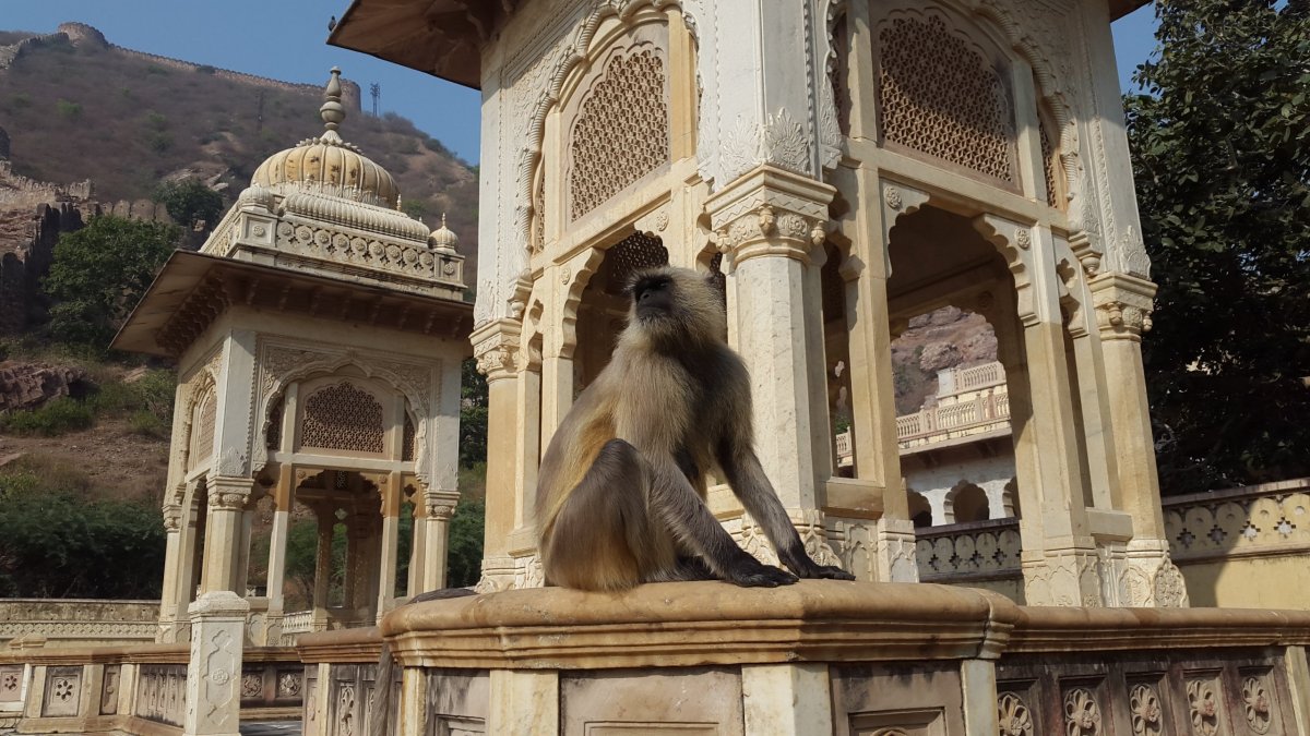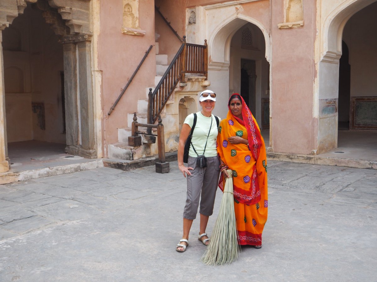 16.11. Indickým vlakem té nejobyčejnější třídy (sleeper class) jedeme do Jaipuru, kterému se také říká „růžové město“. Jaipur byl založen roku 1727 a žije zde více než 5 milionů obyvatel. Navštěvujeme palác Hawa Mahal postavený z červeného a růžového pískovce. Byl vybudován proto, aby ženy z královské rodiny mohly sledovat pouliční festivaly, aniž by byly vidět. Tvar stavby má připomínat Krišnovu korunu. Pětipodlažní palác má 953 malých oken zdobených složitými mřížemi. Přejíždíme tuktukem do Gaitore Ki Chhatriyan. Je to shluk královských hrobek, klidné a krásné místo kousek od centra Jaipuru. Popojíždíme k pevnosti Ambér (též Žlutá pevnost) ležící u břehů umělého jezera Maoto. Je z červeného a bílého pískovce a z mramoru.