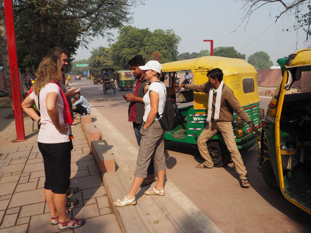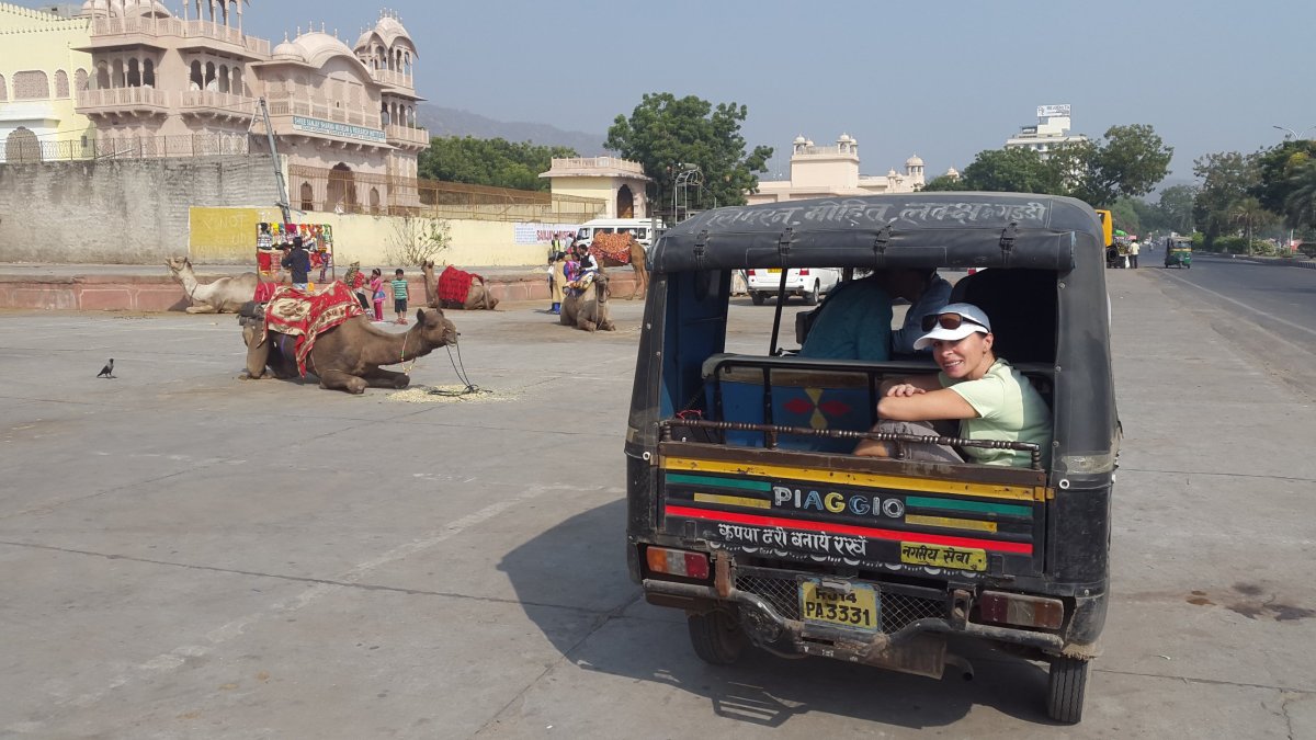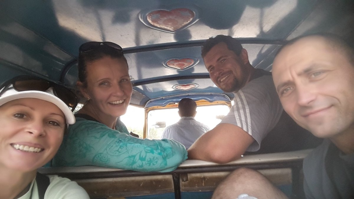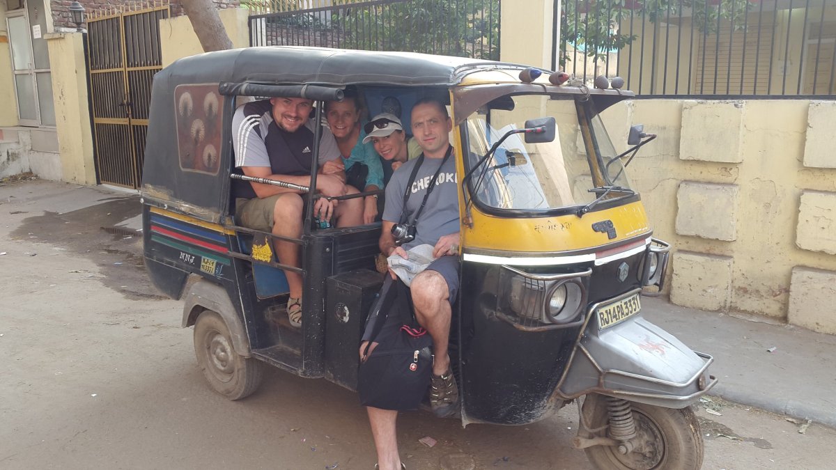 Jezdíme ve čtyřech jen jedním tuktukem. Tuktukáři by radši dvěma, tak nám tvrdí, že se to nesmí, my "jako" odcházíme a nakonec nás vezmou. Sedím buď vedle řidiče (to má radši řidič) nebo vzadu "v kufru" (to mám radši já). Tuktukářům už rovnou říkáme naši cenu. Domluva je pak rychlejší, ušetříme za druhý tuktuk, sice máme menší pohodlí, ale je to větší sranda. Jednou jsem tuktuk mohla i řídit (mimo město a rychle!). Za to si mladý Ind dovolil mi několikrát sáhnout na koleno :)