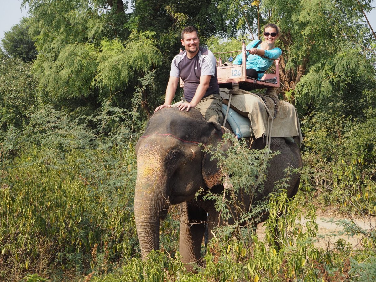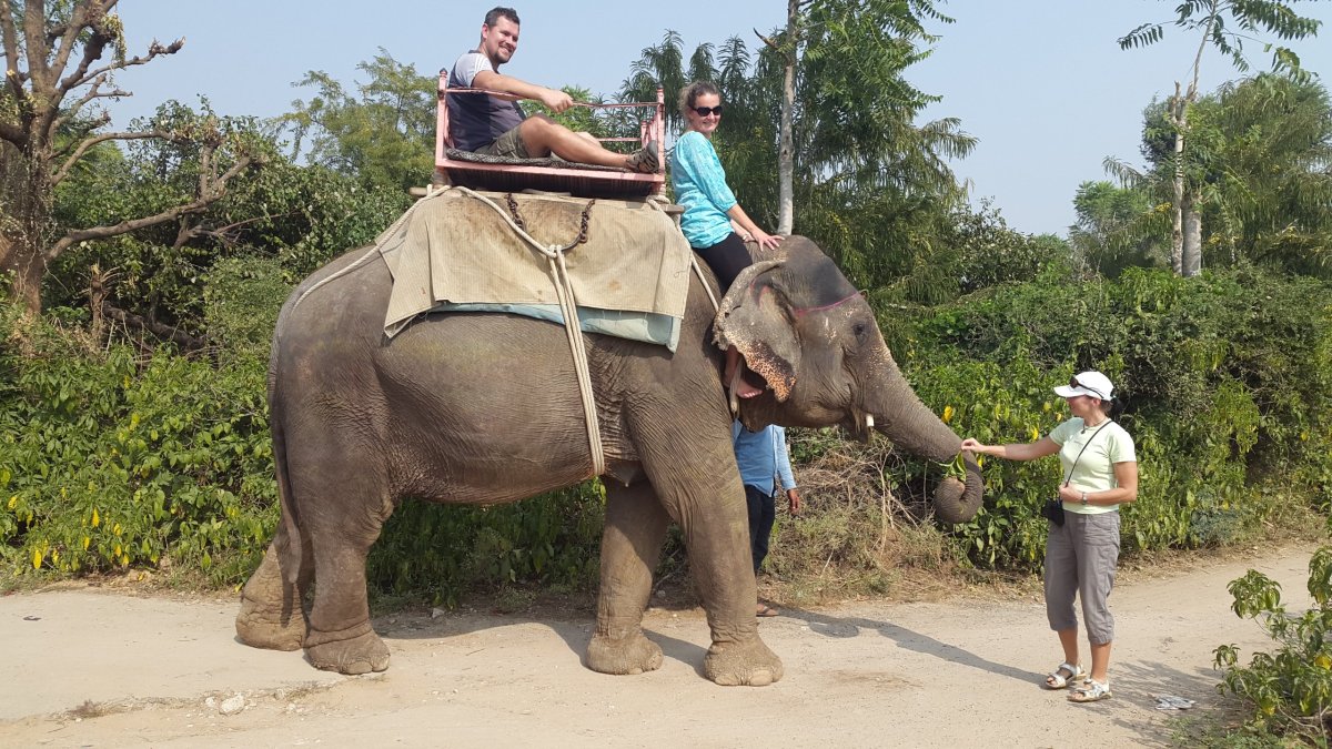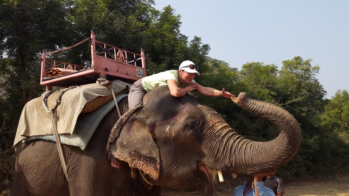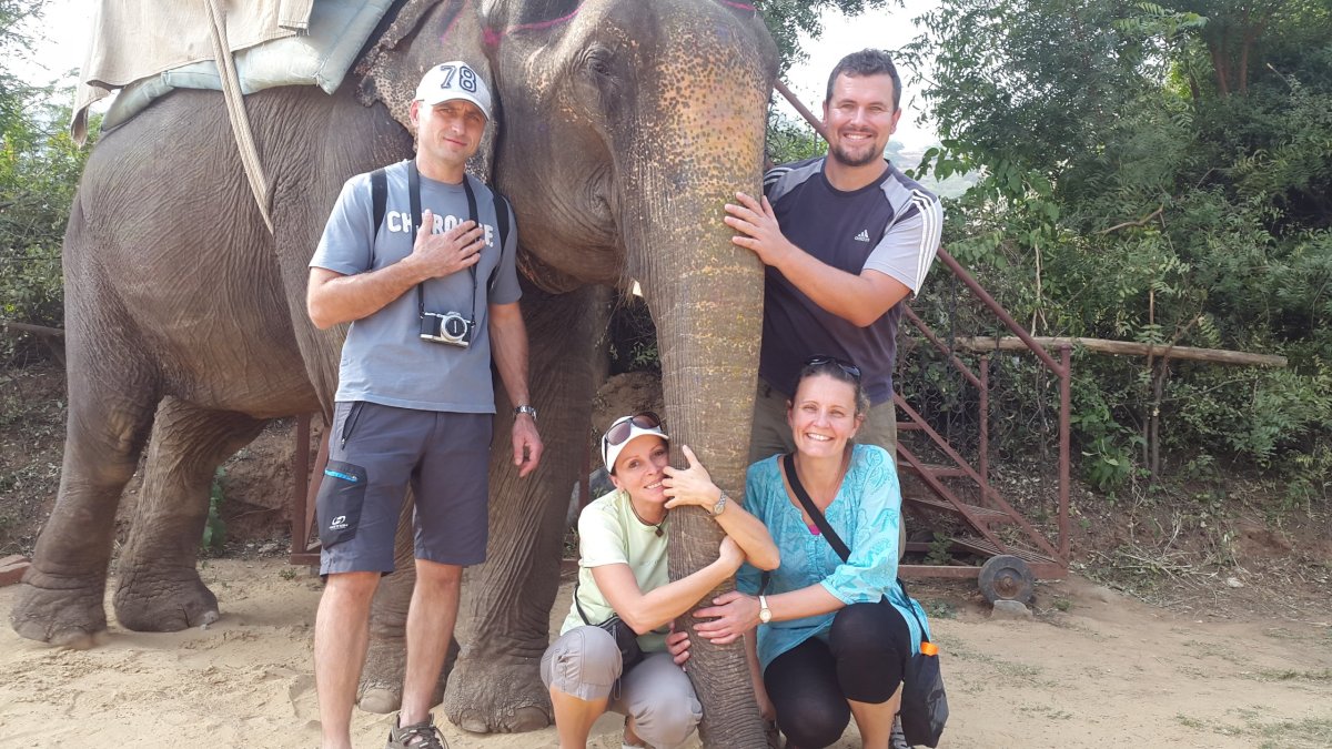 Prý je poblíž Jaipuru záchranná stanice slonů.. Takže.. Slony tu "zachránili" celkem DVA. Dříve "zachránce", dnes "manažer", nás usazuje ke stolečku a čekáme na čaj. Tak to bude na dlouho.. A je to tu: "Vítejte v Indii... odkud jste... a co byste chtěli dělat se slonem?" "Jak jako?" "No, jestli chcete krmit slona, fotit se se slonem, malovat na slona nebo na něm jezdit?" My: "No... asi... všechno?" Načež vzal tužku a papír a začal rozepisovat jednotlivé aktivity se slonem a ceny. Mytí slona. Malování na slona. Vylézt na slona po chobotu. Krmení slona. Fotit se se slonem. Jezdit na slonovi. To poslední je nejdražší. Nenapadlo by nás, co všechno lze s tím nebohým zvířetem provádět. No a když to všechno sečetl, vyšlo to na pěkných 5000 Kč na osobu :)) Skoro jako zpáteční letenka z Vídně do Dillí! Každopádně za "přišli a viděli slona" se neplatí nic, tak máme chuť odejít. Jenže Petra mermomocí chce "jezdit na slonovi", Robert "musí" s ní, usmlouváme to na 1000 Kč za osobu. Lukáš nechce se slonem dělat (radši) nic, pomalu se na něj bojí i podívat a já si vybírám jedinou akční (a zároveň nejlevnější) položku "vylézt na slona" - a za 60 Kč vylezu po chobotu na slona. Dvakrát! :) První pokus jsem personálu vysvětlila jako trénink a podruhé už mi to šlo. A pak Petra s Robertem vyjeli na slonovi a já celou dobu šla vedle slona, sahala na slona, krmila slona a fotila všechny se slonem (zdarma) :)
