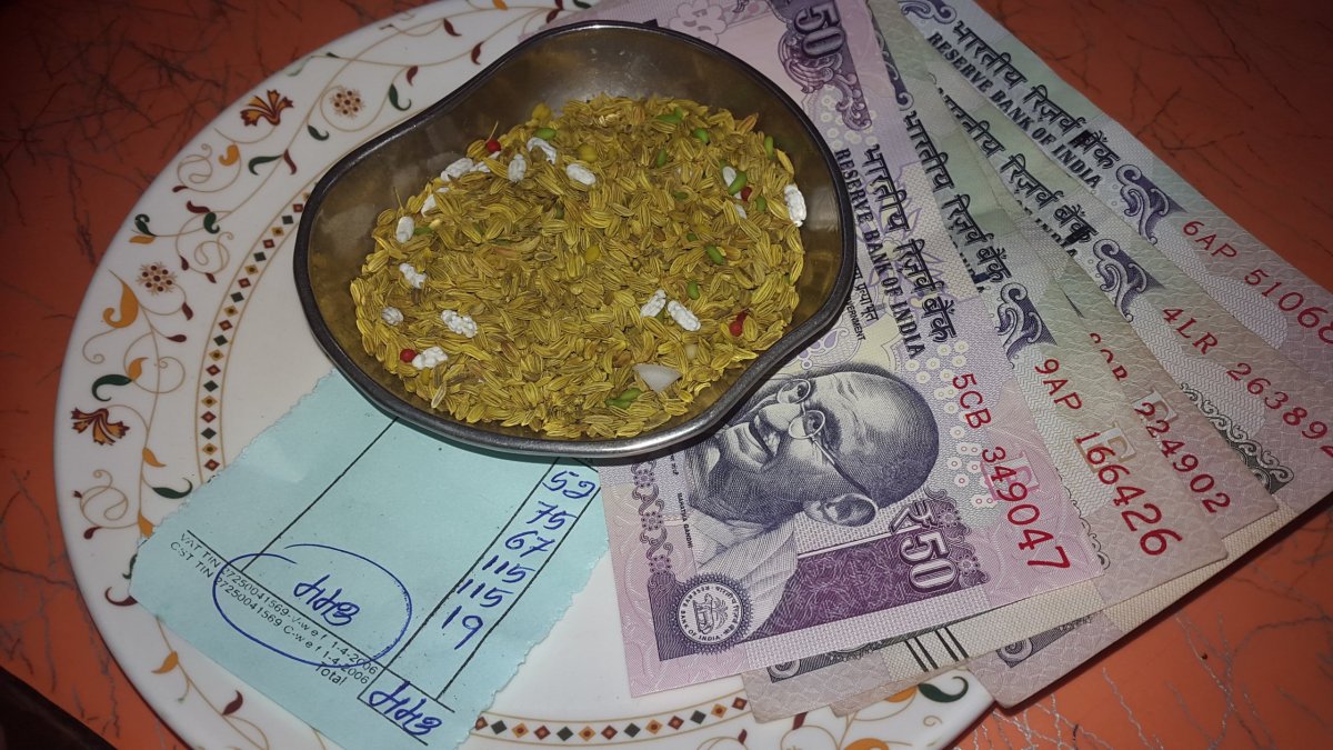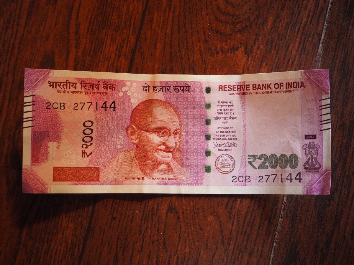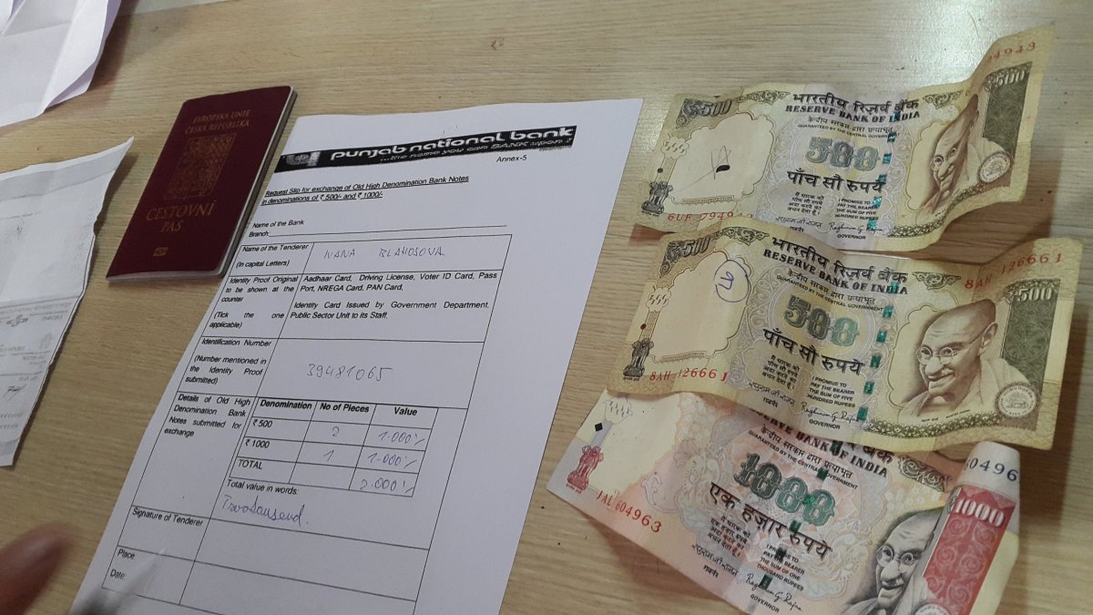 Od 1. dne v Indii máme velké problémy s výměnou peněz. Indická vláda ze dne na den zrušila platnost 2 největších bankovek - 500 (180 Kč) a 1000 rupií (360 Kč) - kvůli korupci. Zůstaly nejvyšší bankovky 100 rupií (40 Kč), které ale rychle došly. Turistům byla udělena výjimka, mohou si vyměnit až 2000 rupií každý den, ale ono není kde a navíc 2000 je málo. Měníme tedy na černém trhu dolary za již neplatné (!!) bankovky 500 a 1000 rupií, které pak jako turisté měníme v bankách za nové bankovky, ale pouze v tom limitu 2000 rupií na osobu a den. Za pár dní se nám dostala do rukou první úplně nová bankovka 2000 rupií! Úleva byla zbytečná. Novou 2000 nikdo nechce, nikdo ji nezná a hlavně nám na ni nikdo nevrátí, protože platné stovky už došly.