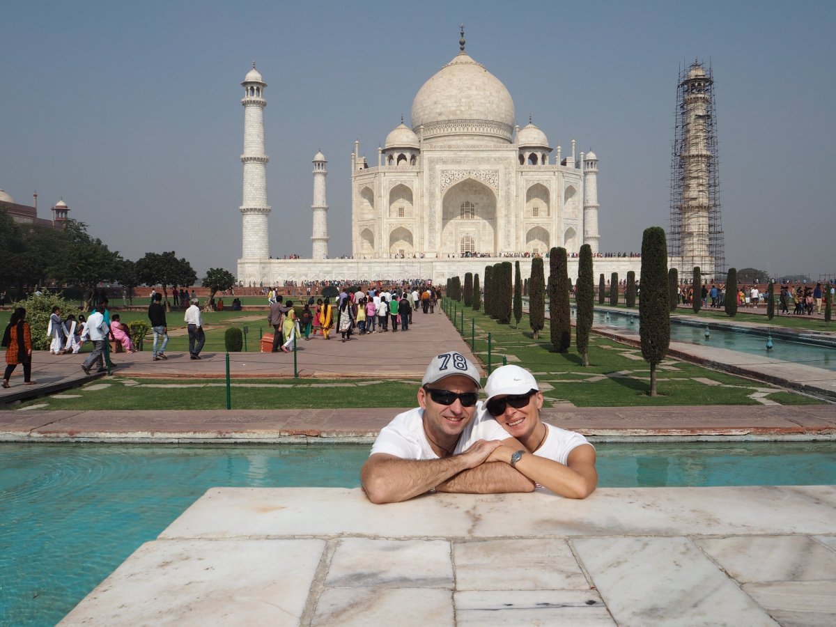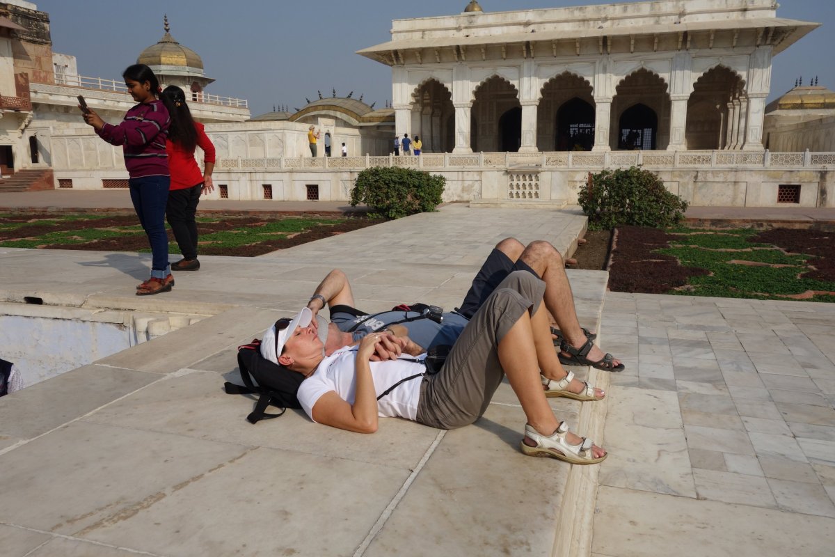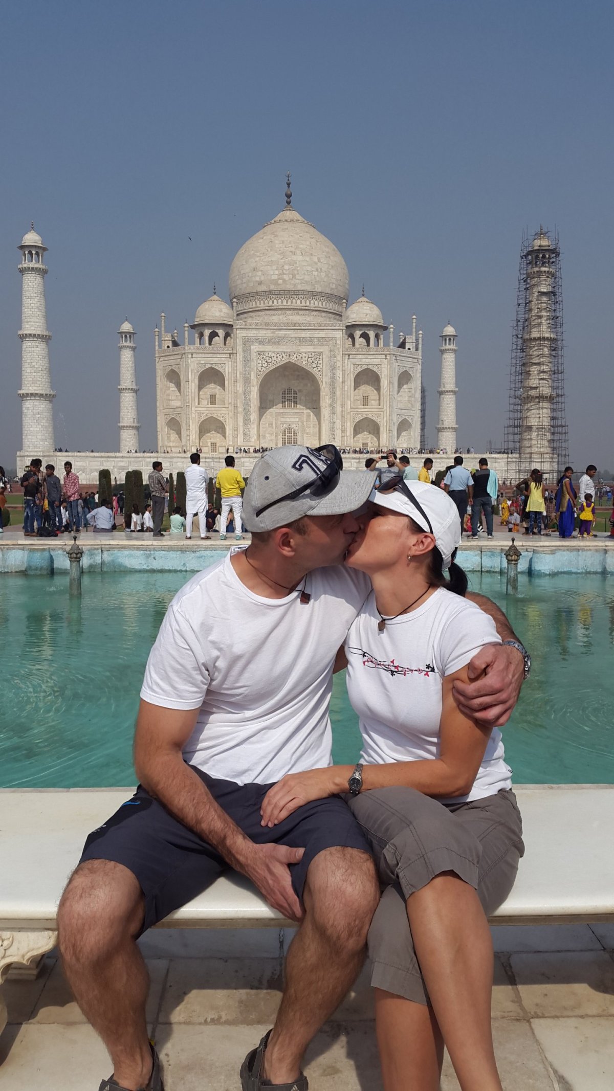 Na focení na lavičce před Taj Mahalem se stojí fronty. Když na nás přišla řada, sedli jsme si a dali si tu jako jediní ze všech pusu. A sklidili za to potlesk! :) Obyčejný polibek, objetí, či pohlazení na veřejnosti (i v rodinném kruhu!), jsou v Indii nepřípustné. Ale už 2. rok probíhají v Indii "líbací protesty" proti tomuto zákazu. Hlavně mladí lidé s takto přehnaným bráněním indické morálky nesouhlasí. A tak tu nevědomky protestujeme pro dobrou věc :)