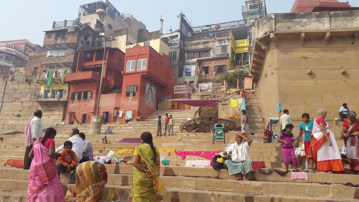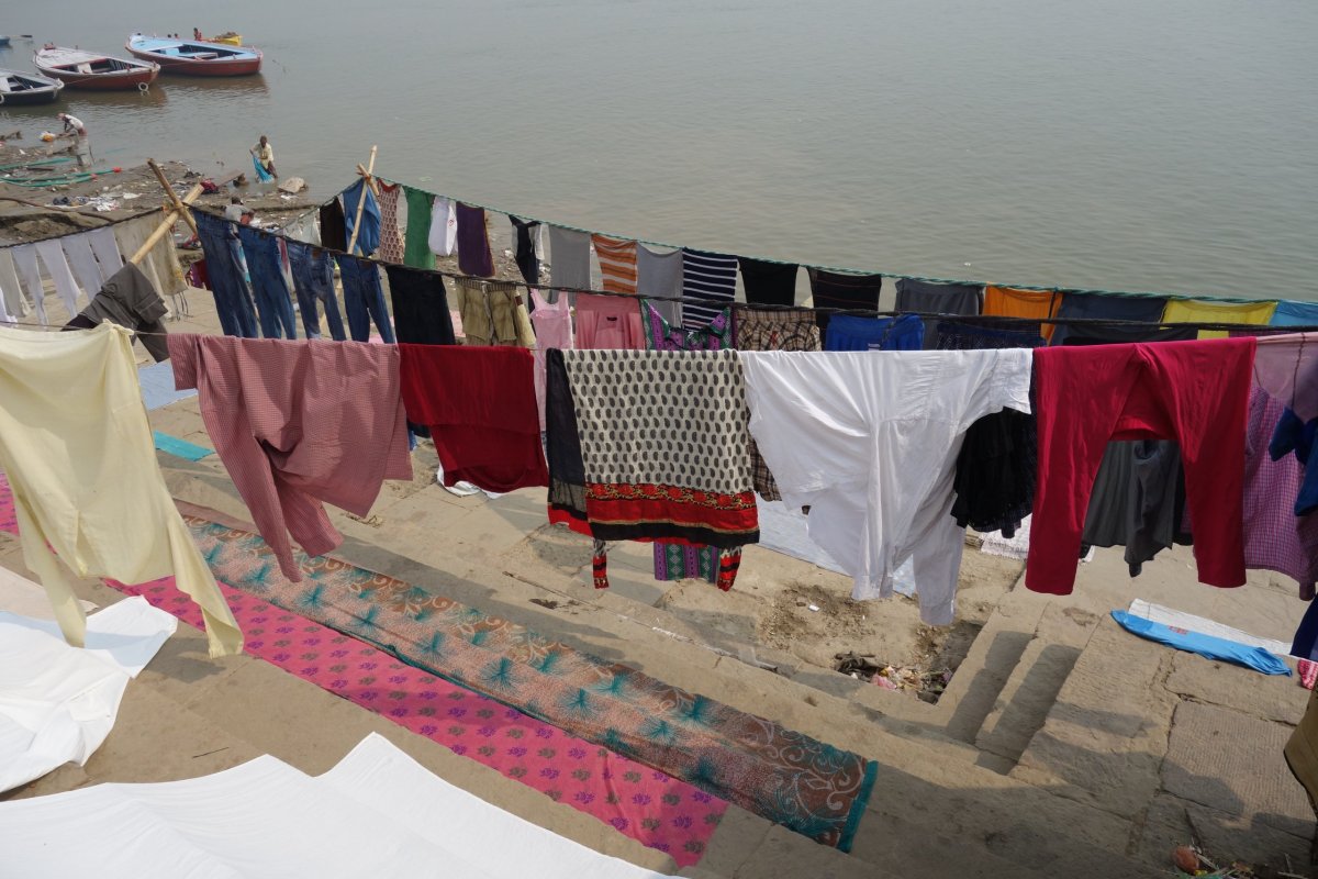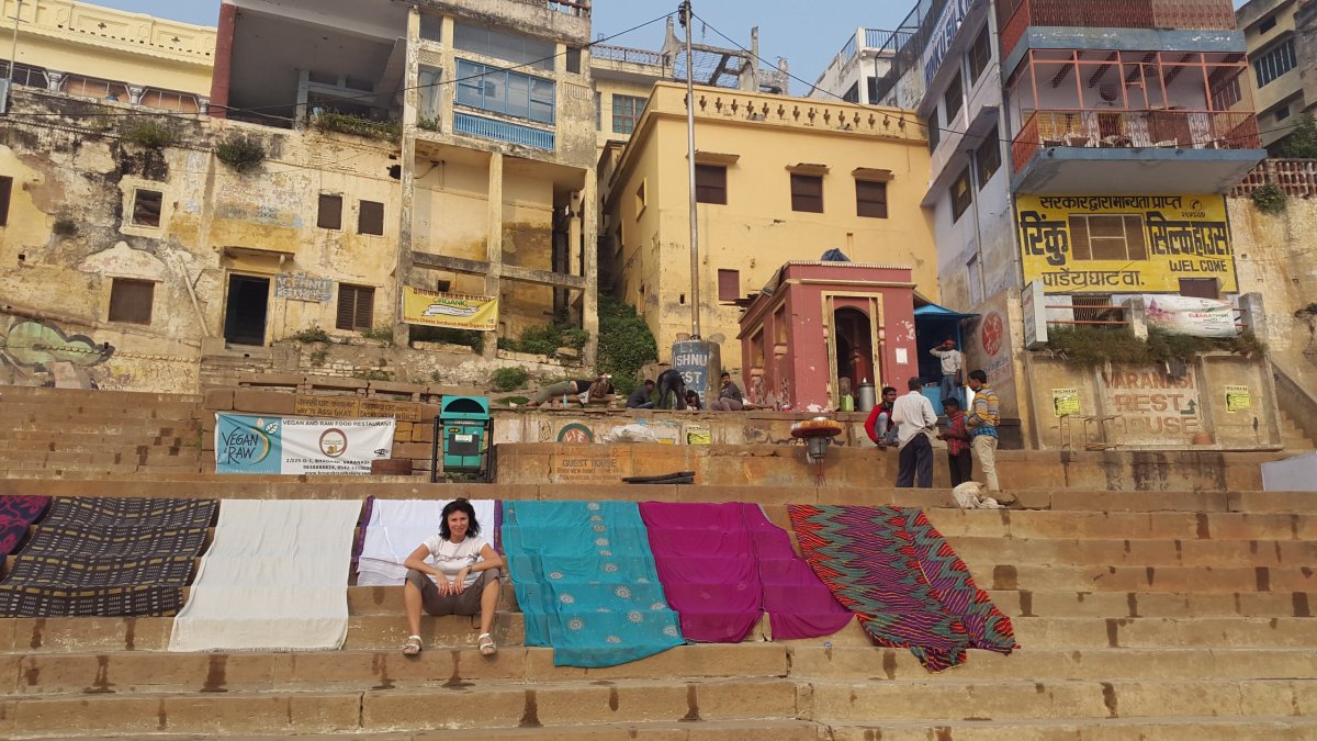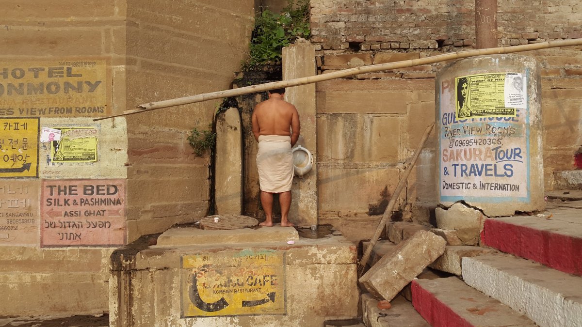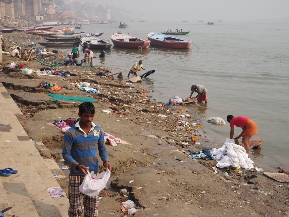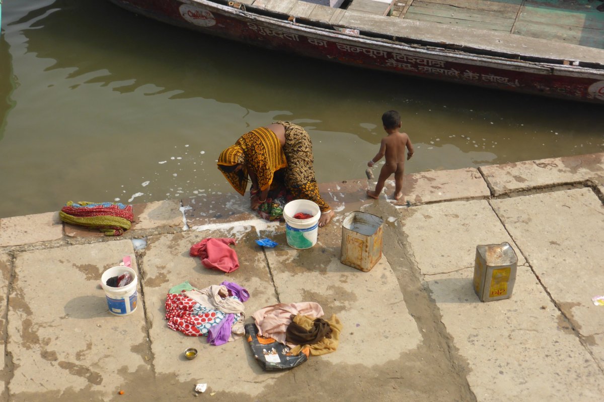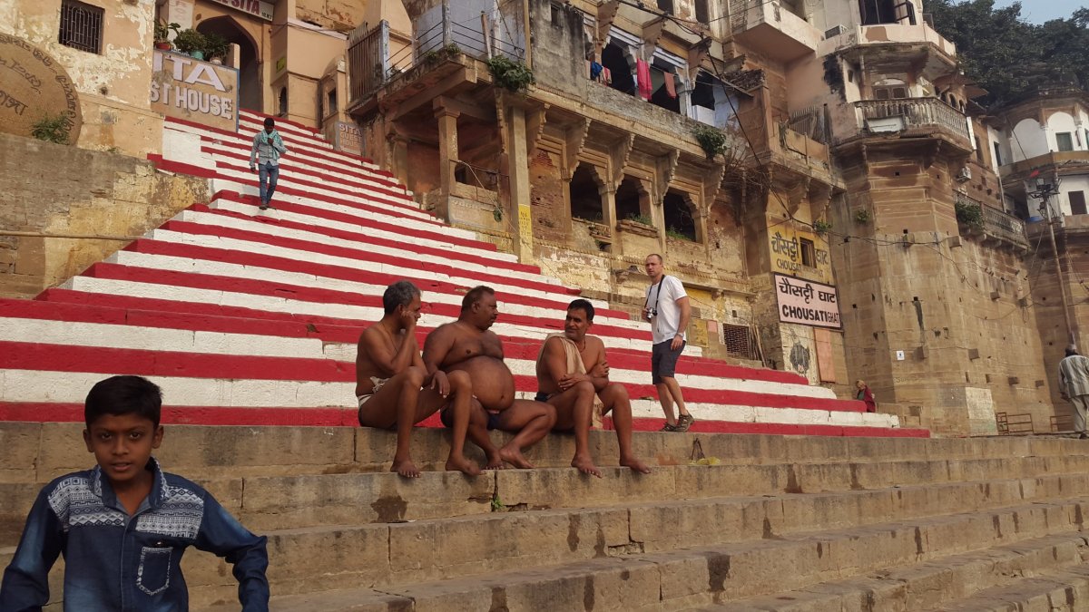 Bydlíme přímo nad schody jednoho (ne spalovacího) ghátu. Pochvalujeme si čisté povlečení, ani nevyndáváme to naše (první chyba). Ráno dostaneme snídani až na pokoj (= na postel), i dobrý čaj, vše sníme a vypijeme (druhá chyba). O deset minut později na procházce po ghátech vidíme, že veškeré povlečení (i uniformy a ubrusy z lepších hotelů!) perou v té své posvátné, špinavé a nemocemi prolezlé Ganze a že z ní používají i vodu na čaj! Indie je matoucí. Co se tu zdá být čisté, čisté není a naopak. Z jídla, co vypadá jako pochoutka, je nám druhý den zle a když si (umírající hlady) dáme něco, co vypadá nechutně (naše noční omeleta z vajec, co byla několik dní na slunci, smažená na špinavé pánvi otřené hadrem ze země), nic nám není.
