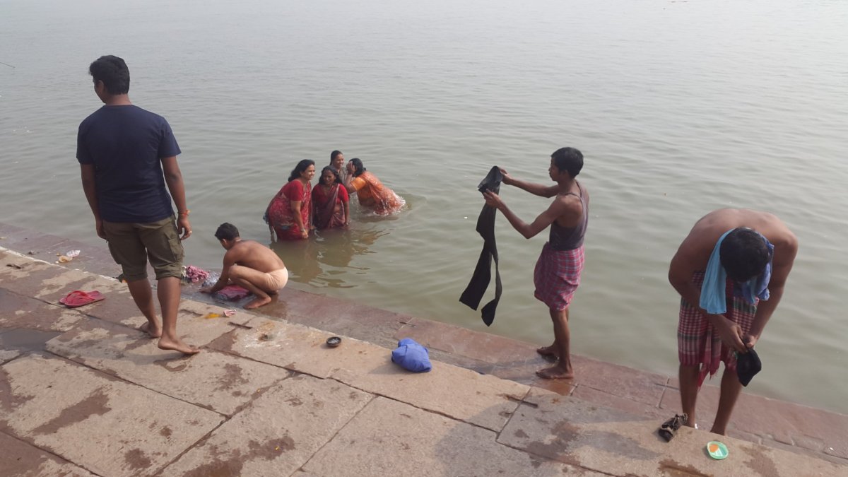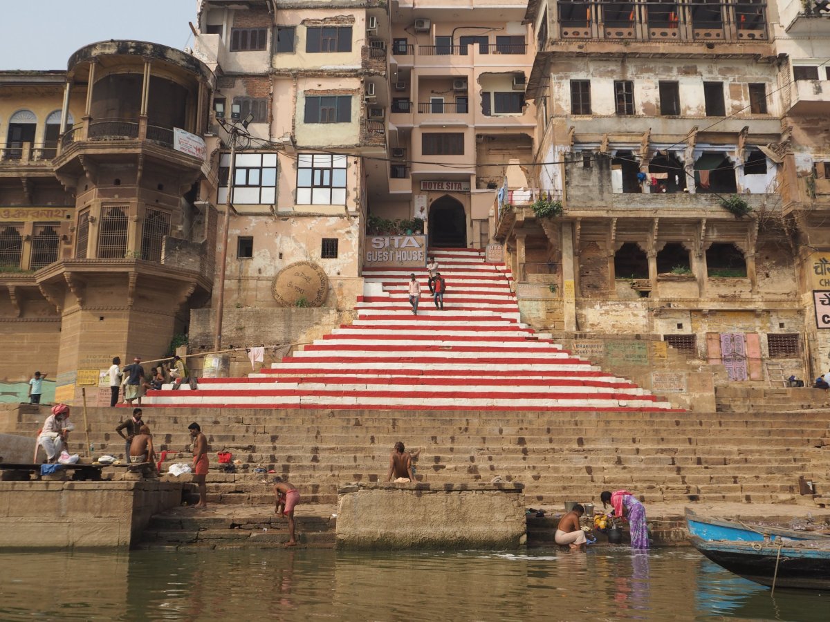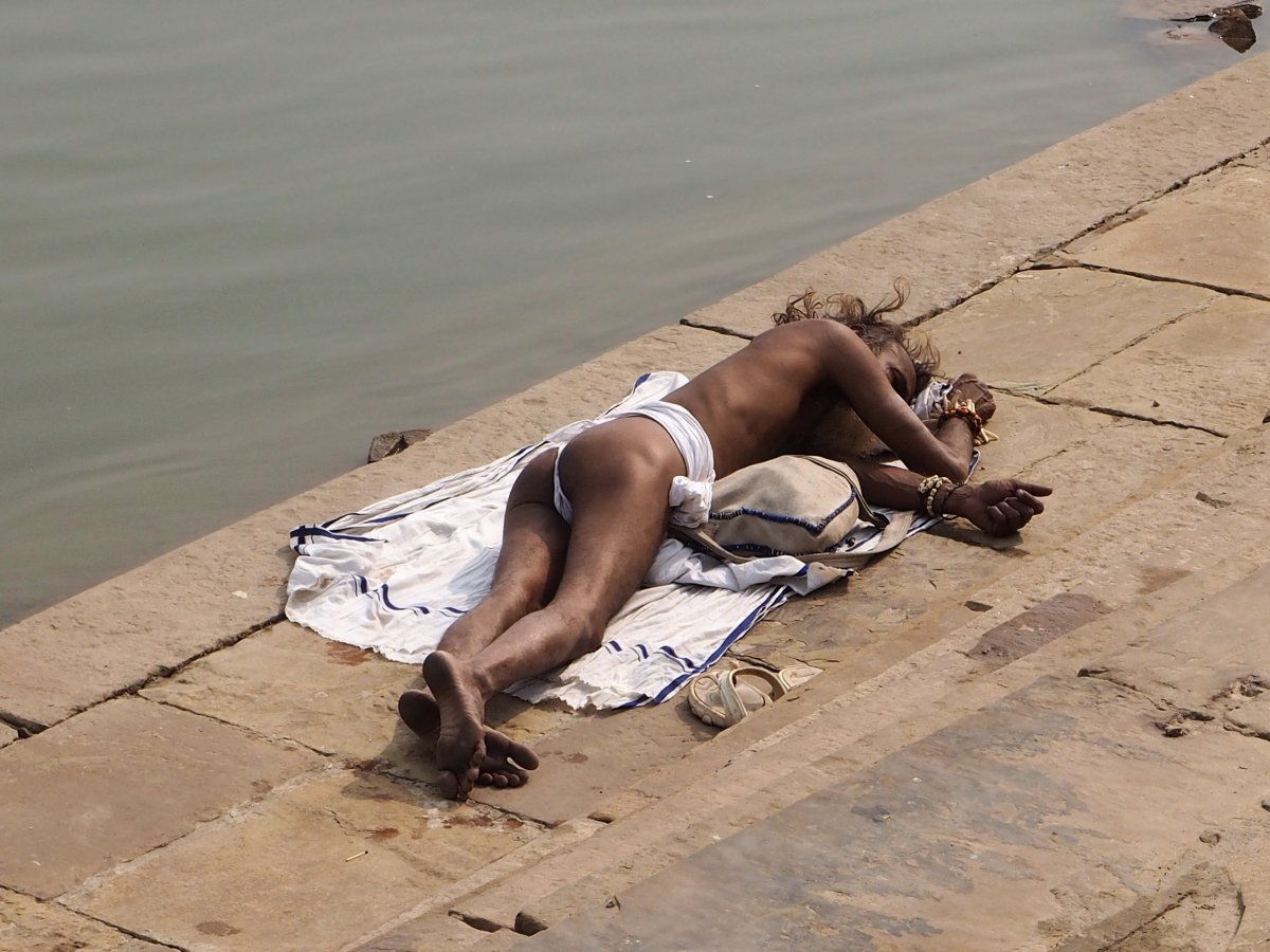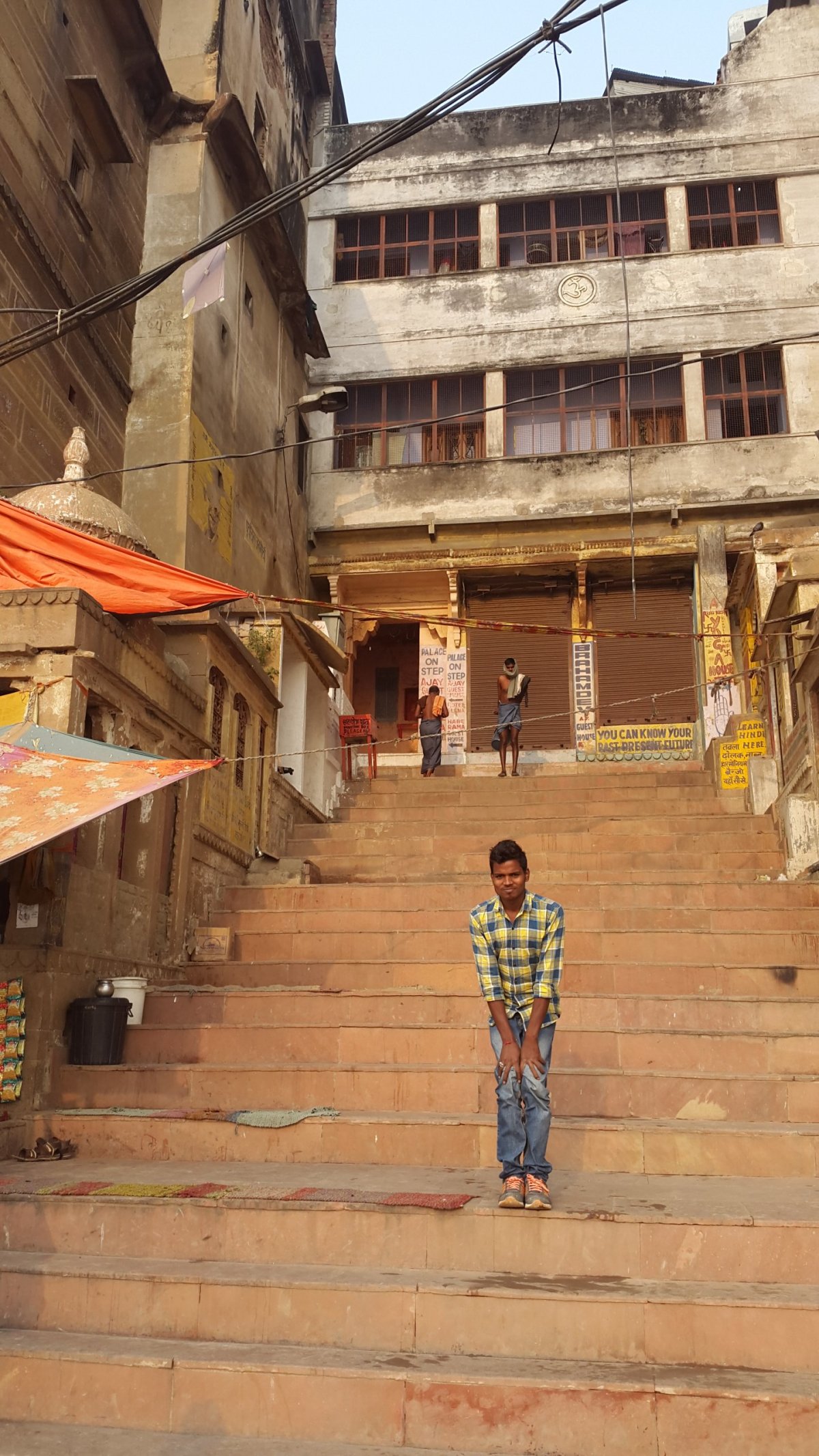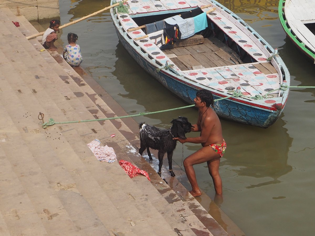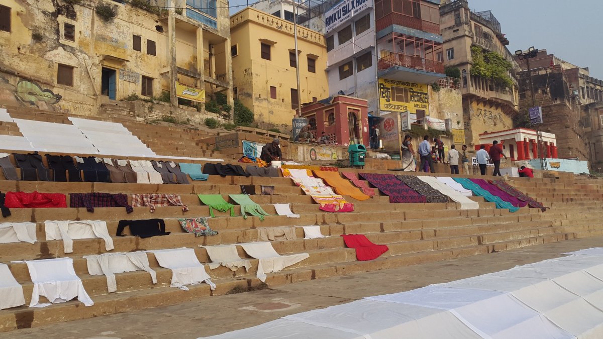 Bydlíme přímo nad schody jednoho (ne spalovacího) ghátu. Pochvalujeme si čisté povlečení, ani nevyndáváme to naše (první chyba). Ráno dostaneme snídani až na pokoj (= na postel), i dobrý čaj, vše sníme a vypijeme (druhá chyba). O deset minut později na procházce po ghátech vidíme, že veškeré povlečení (i uniformy a ubrusy z lepších hotelů!) perou v té své posvátné, špinavé a nemocemi prolezlé Ganze a že z ní používají i vodu na čaj! Indie je matoucí. Co se tu zdá být čisté, čisté není a naopak. Z jídla, co vypadá jako pochoutka, je nám druhý den zle a když si (umírající hlady) dáme něco, co vypadá nechutně (naše noční omeleta z vajec, co byla několik dní na slunci, smažená na špinavé pánvi otřené hadrem ze země), nic nám není.