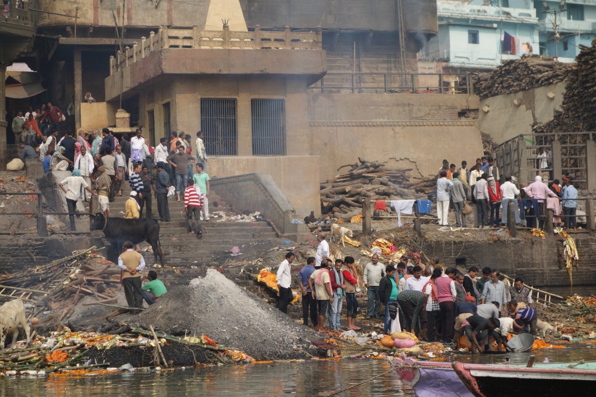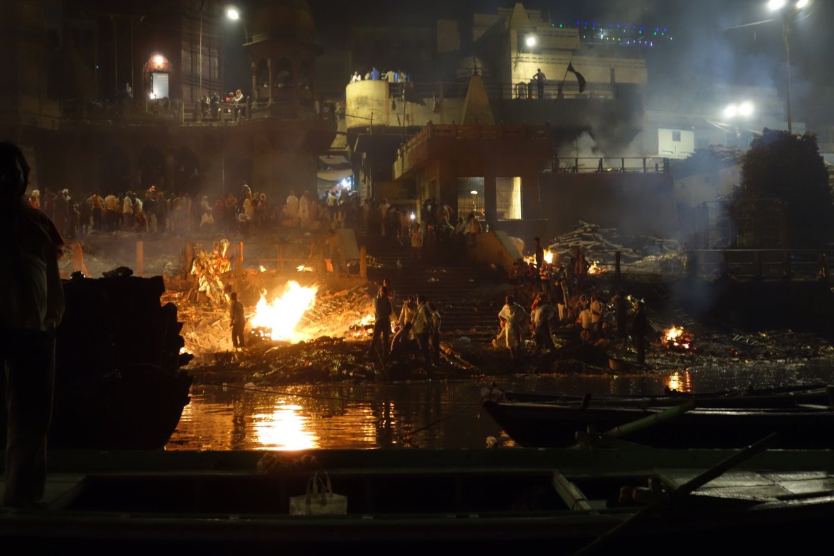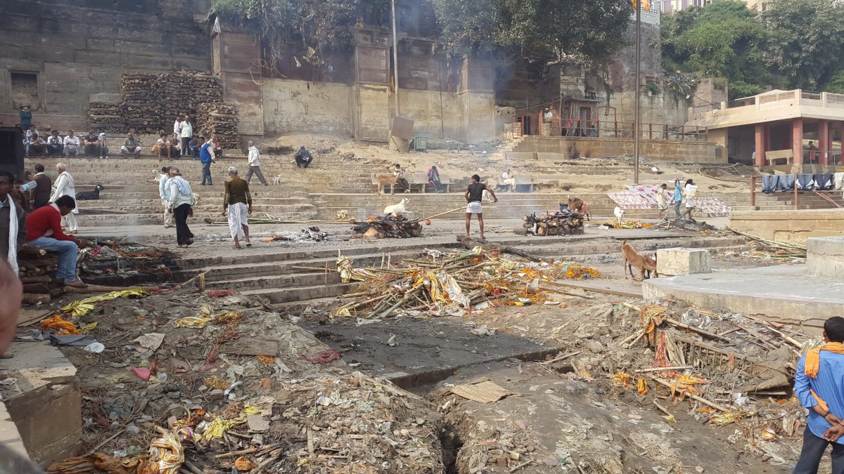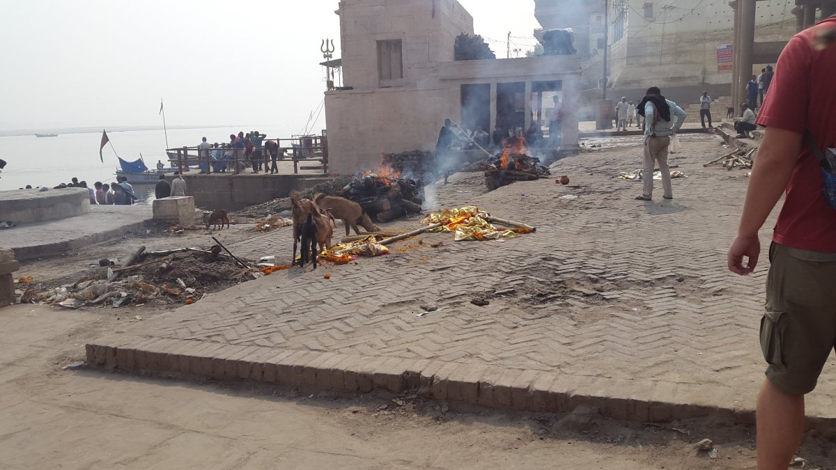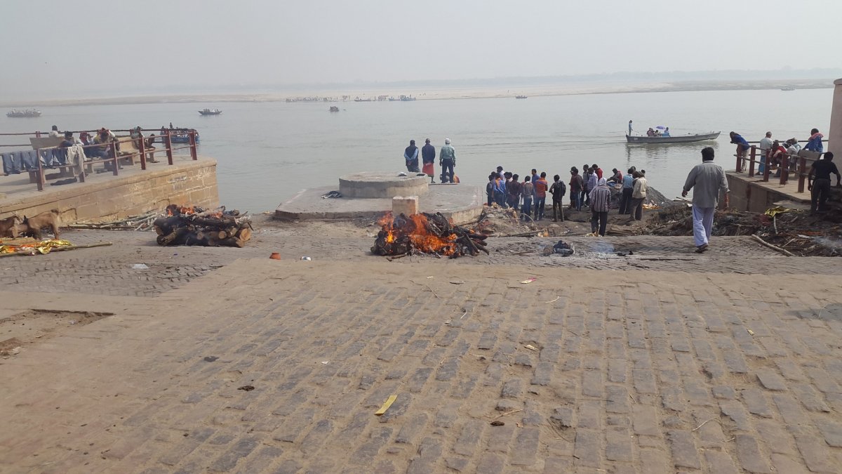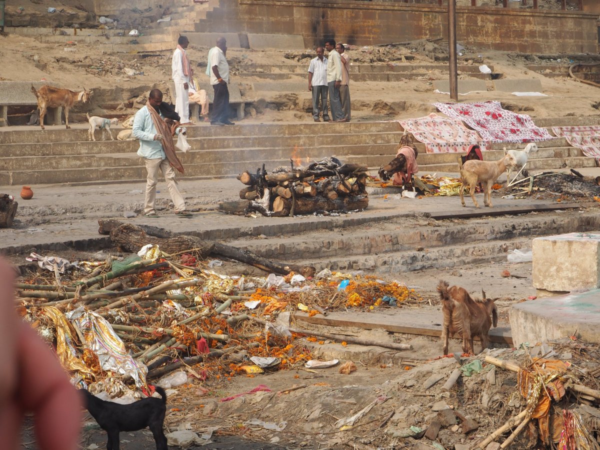 Na lodi míjíme mrtvou krávu a psy ve vodě (malé děti, těhotné ženy a zvířata nesmí být dle hinduistické víry spáleny, po smrti se celá vhazují do Gangy) a pomalu se blížíme ke spalovacímu ghátu Manikarnika. Už zdálky vypadá úplně jinak než v Nepálu. Několik hořících hranic, jedna přechází v druhou, všude kolem zbytky dřeva, kostí, popela, oranžových látek, mezi tím procházejí krávy a psi, s úklidem čehokoliv si tu nikdo hlavu neláme. Na tohle Indové šetří celý život a jen hrstce z nich se splní přání zemřít a být spálen právě zde. Dřevo i hotely pro umírající jsou neskutečně drahé. 1 kg dřeva stojí 900 rupií a ke spálení těla je třeba až 300 kg. Tělo v oranžovém rouchu před spálením omyjí v posvátné Ganze, na hranici už ale tělo nikdo neobchází, modlitby neříká, musí se rychle, na schodech už "čeká" další mrtvý. Popel po spálení těla do Gangy obřadně nesypou, jen ho přihodí na velikou hromadu a čekají na velkou vodu, která ji spláchne do řeky.