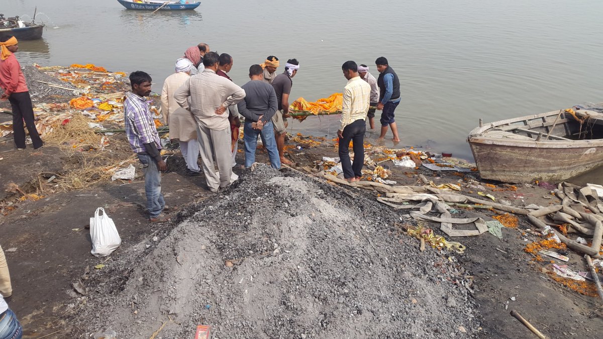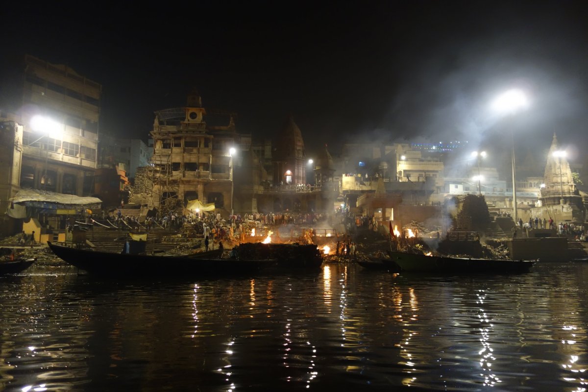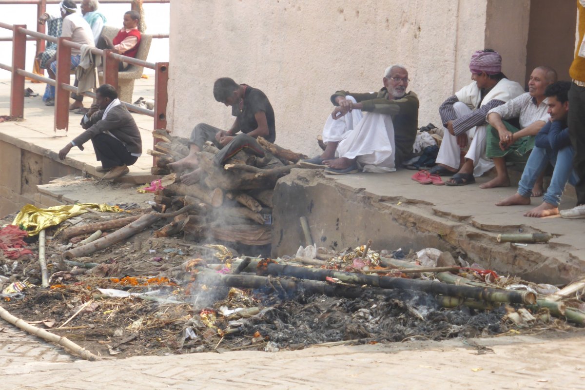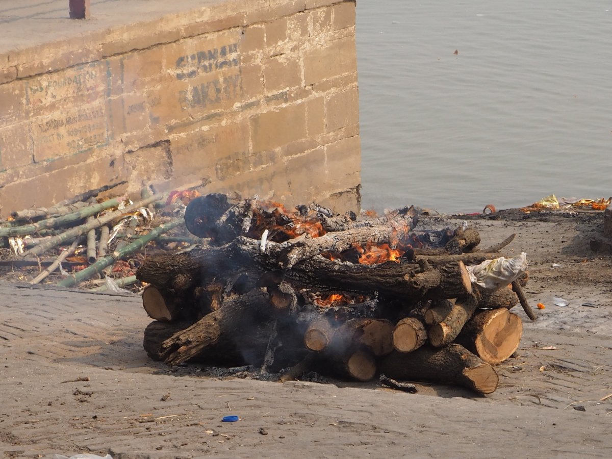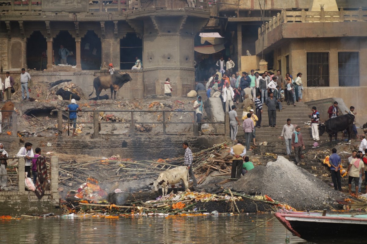 Na lodi míjíme mrtvou krávu a psy ve vodě (malé děti, těhotné ženy a zvířata nesmí být dle hinduistické víry spáleny, po smrti se celá vhazují do Gangy) a pomalu se blížíme ke spalovacímu ghátu Manikarnika. Už zdálky vypadá úplně jinak než v Nepálu. Několik hořících hranic, jedna přechází v druhou, všude kolem zbytky dřeva, kostí, popela, oranžových látek, mezi tím procházejí krávy a psi, s úklidem čehokoliv si tu nikdo hlavu neláme. Na tohle Indové šetří celý život a jen hrstce z nich se splní přání zemřít a být spálen právě zde. Dřevo i hotely pro umírající jsou neskutečně drahé. 1 kg dřeva stojí 900 rupií a ke spálení těla je třeba až 300 kg. Tělo v oranžovém rouchu před spálením omyjí v posvátné Ganze, na hranici už ale tělo nikdo neobchází, modlitby neříká, musí se rychle, na schodech už "čeká" další mrtvý. Popel po spálení těla do Gangy obřadně nesypou, jen ho přihodí na velikou hromadu a čekají na velkou vodu, která ji spláchne do řeky.