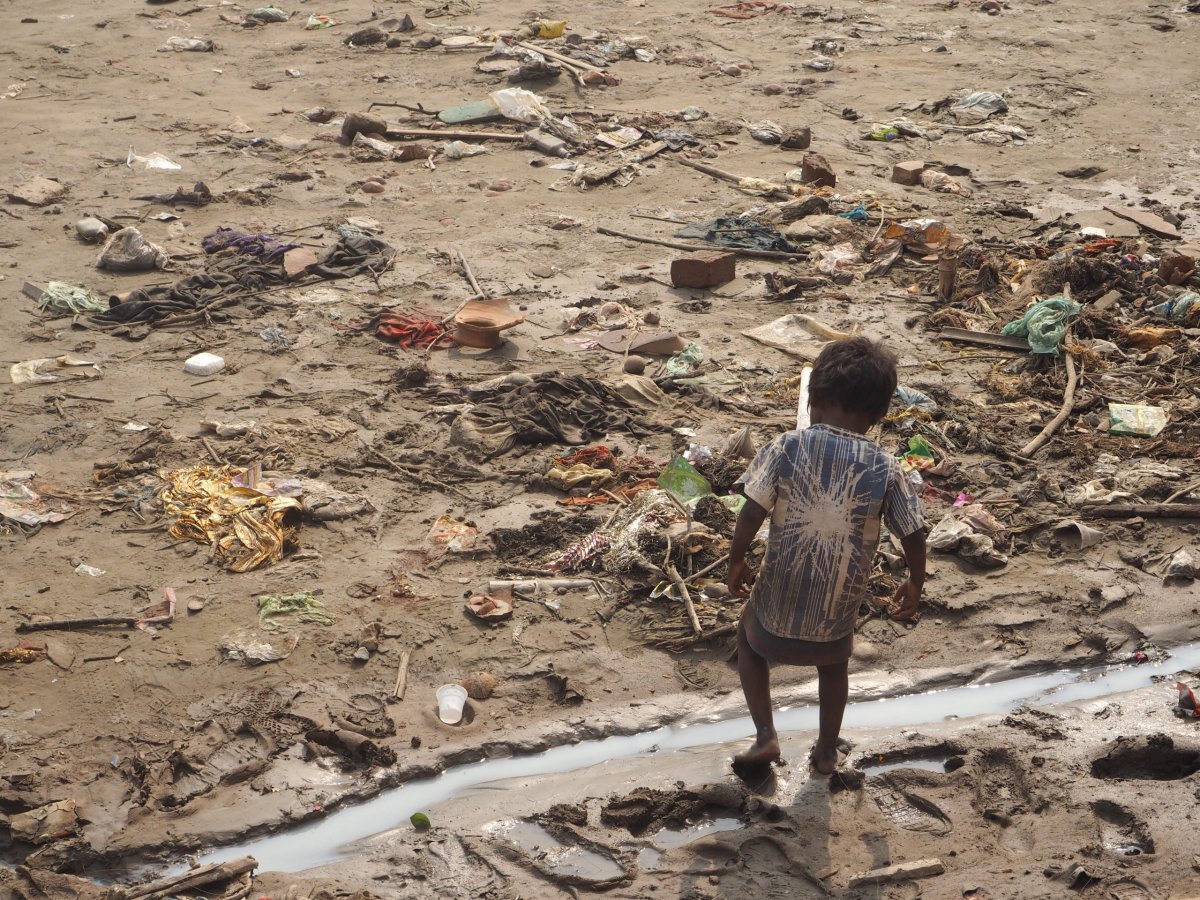 Prý je tu ještě jeden spalovací ghat. Je menší, ale dá se tam dojít pěšky a jít blíž. Na místě nám říkají, kam si máme sednout, abychom viděli a nerušili. No, není to hezká podívaná. Vidíme ohořelé hlavy a upadlé nohy, které nikdo na ohniště nevrátí. Kolem jen nepořádek a špína, zase ten štiplavý a nasládlý nepříjemný kouř. Spalování mrtvol v Indii je práce nedotknutelných (nejnižší kasta). Ti jsou ale líní sypat popel do Gangy, takže je tu zase jedna veliká hromada spálených lidí, prý tisíce. Až přijde velká voda, hromadu popela vezme s sebou.