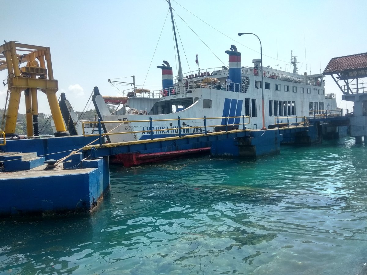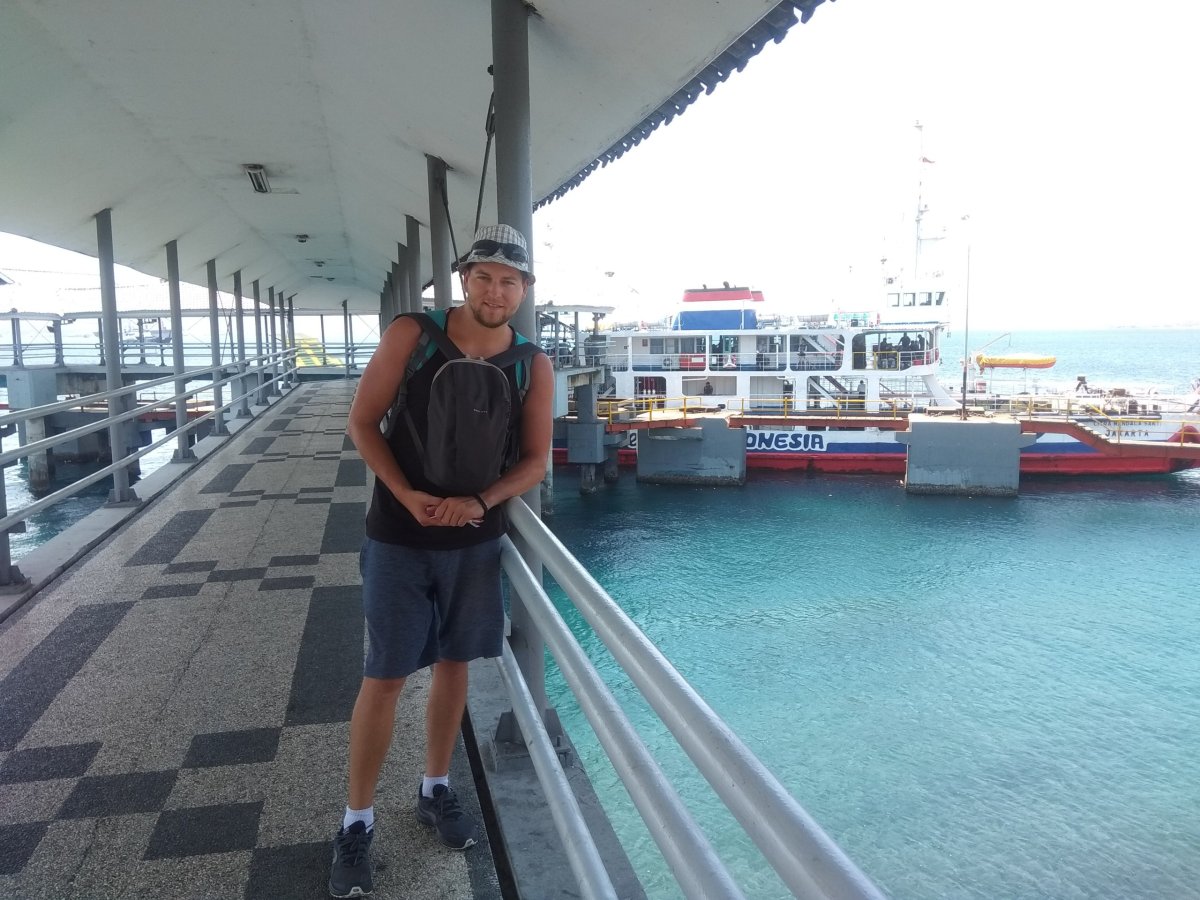 Dáváme tedy snídaní a po půl 10 jedeme do přístavu koupit lístky. V přístavu je poměrně snadná orientace, u okýnka kupujeme lístky pro dvě osoby a jeden skútr za 120 000IDR a jdeme čekat do fronty na nalodění. Doklady od skútru po nás nikdo nechce. 11:00 pryč, trajekt stále nikde, 13:00 pryč, trajekt stále nepřijel. Společně s ostatními stále čekáme. Když probíhá hlášení, tak pouze v indonéštině. V 15:00 je tu konečně trajekt, po 4 hodinách zpoždění :D No co už, naloďujeme se i s naším skútrem, na lodi je poměrně dost turistů.