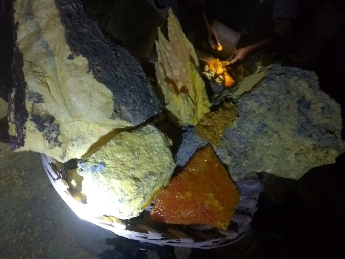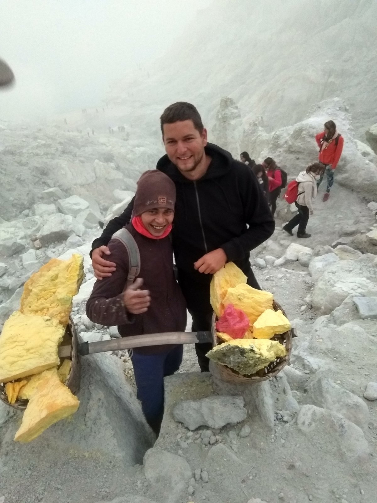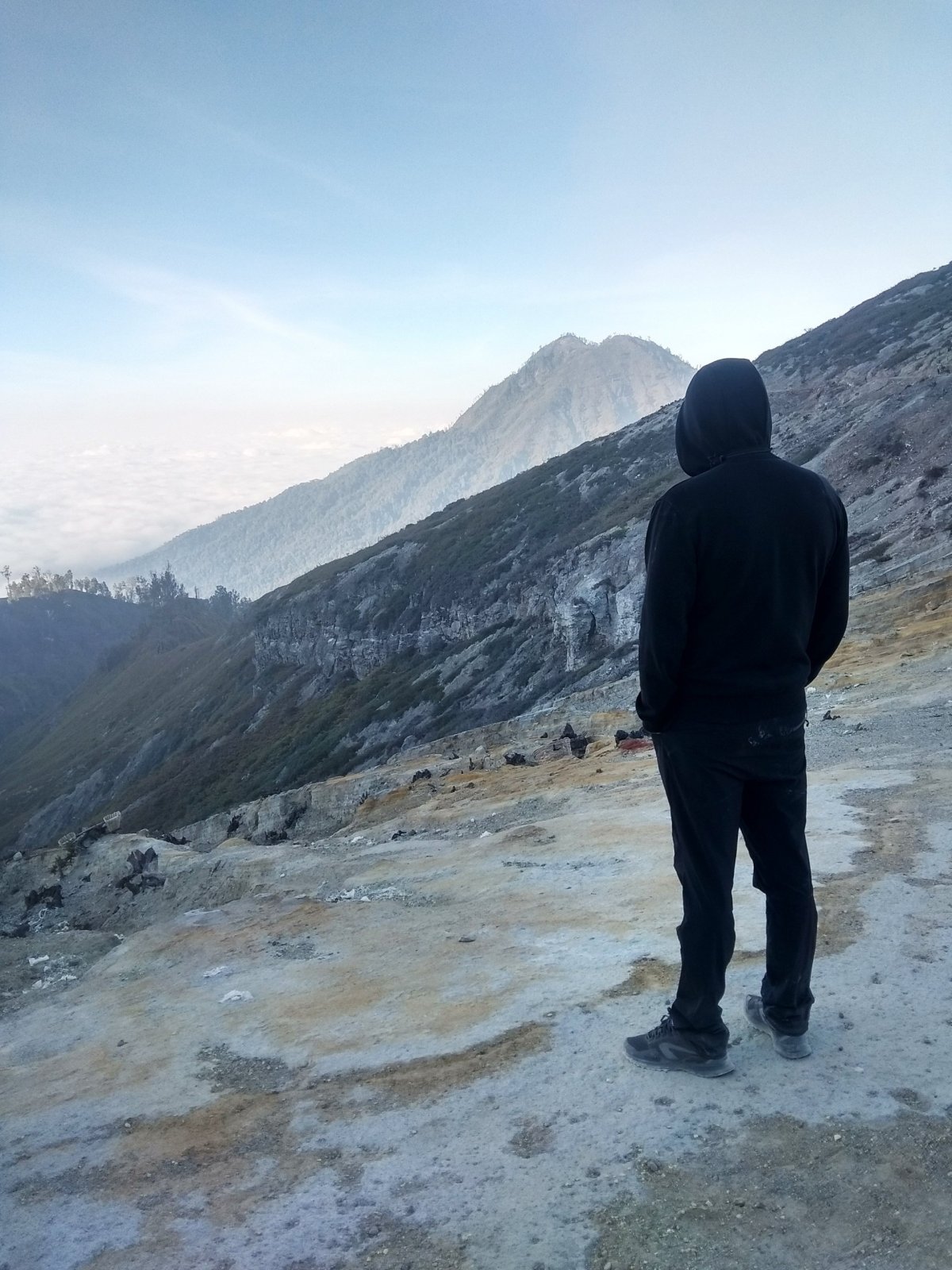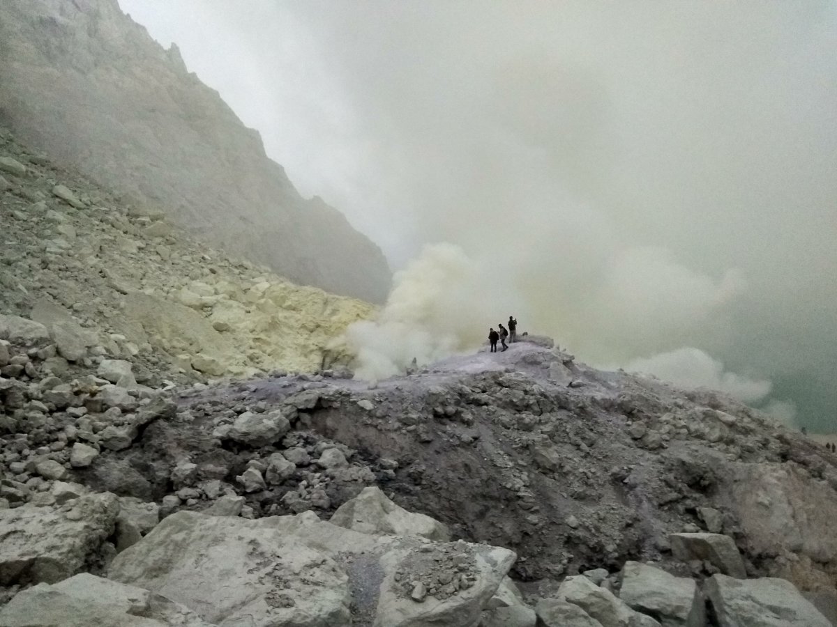Řidič nás veze na parkoviště, kde se balíme do bund, jelikož teplota okolního vzduchu nepřesahuje 10 stupňů. Je nutné se tedy pořádně obléknout, další nutností je pevná obuv, dostatek vody, nějaká malá svačinka a rozhodně i čelovka a plynová maska, kterou nám zapůjčuje průvodce. Cesta se zdá být zpočátku poměrně přívětivá, což se ale po pár metrech mění. Jdeme prašnou cestou s někdy až extrémním úhlem stoupání. Co je horší než stoupání, je všudypřítomný prach z cesty, který se víří všude ve vzduchu. Po asi hodině cesty stojíme nahoře nad kráterem a čeká nás sestup dolů, přímo do kráteru sopky a k sirnému jezeru. Klesání je mírně náročné, avšak průvodce nás neustále hlídá, abychom nespadli. Sice neumí ani slovo anglicky, ale posunky nám ukazuje, kudy jít a kam stoupat. Dole jsme poměrně rychle, asi za 20 minut. Oblaka síry jsou úplně všude a rozhodně není nic příjemného, když se do takového obláčku síry zrovna dostanete. Průvodce křičí nepanikařit, avšak náš rozum říká „vezmi nohy na ramena“. Štiplavý zápach a pocit dušení nastává téměř okamžitě. Veškeré negativní pocity ale mizí, když vidíme první modré plameny. Je jich kolem nás spousta a my si užíváme tento ojedinělý zážitek, i když jsme vděční za plynové masky na obličeji. V kráteru je možné vidět způsob těžby síry a nosiče, kteří nakládají své košíky. V kráteru trávíme čas pozorováním a procházením se, smočíme prst v kyselém jezeru, abychom vyzkoušeli, že nám neupadne a poté nás čeká cesta zpět na vrchol sopky. Slunce začíná pomalu vycházet a my se těšíme na pohled shora. Počasí nám ale zrovna moc nepřeje a silný vítr v kombinaci s hustými sirnými oblaky nám neumožňuje vidět na celý kráter, ukrývající to pověstně známé tyrkysové jezero. Chvíli se ještě procházíme po okraji kráteru a vyčkáváme, zda se počasí neumoudří a sopka neukáže alespoň kousek ze své krásy. Po hodině to ale vzdáváme a vymrzlí a hladoví se vydáváme na cestu zpět k parkovišti. S průvodcem se u auta loučíme a řidič nás veze zpět do ubytování. Součástí výletu měla být i návštěva vodopádu, kterou už ale nezvládáme a těšíme se do postele.