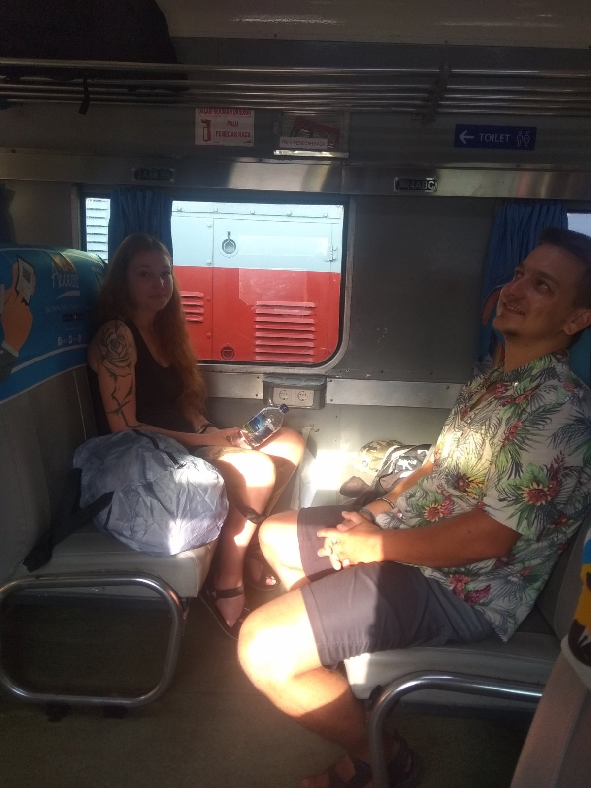 Vstáváme opět brzy ráno, balíme a pěšky jdeme na vlakovou stanici Banyuwangi Baru. Z ubytování to máme asi 5 minut chůze. Lístky na vlak do Probolingga jsme si dopředu koupili přes stránky tiket.com, kde najdete i časy odjezdů, teď už nás čeká jen jejich vytisknutí na automatu přímo na vlakovém nádraží. Nástup do vlaku probíhá rychle, stačí ukázat jízdenku a pas a už běžíme najít naše místa. Vlaky jsou poměrně moderní, mají klimatizaci, jen sedačky by mohly být větší. Příjemným překvapením jsou ale všudypřítomné zásuvky a místní, prodávající ve vlaku kávu a nějaké svačinky.