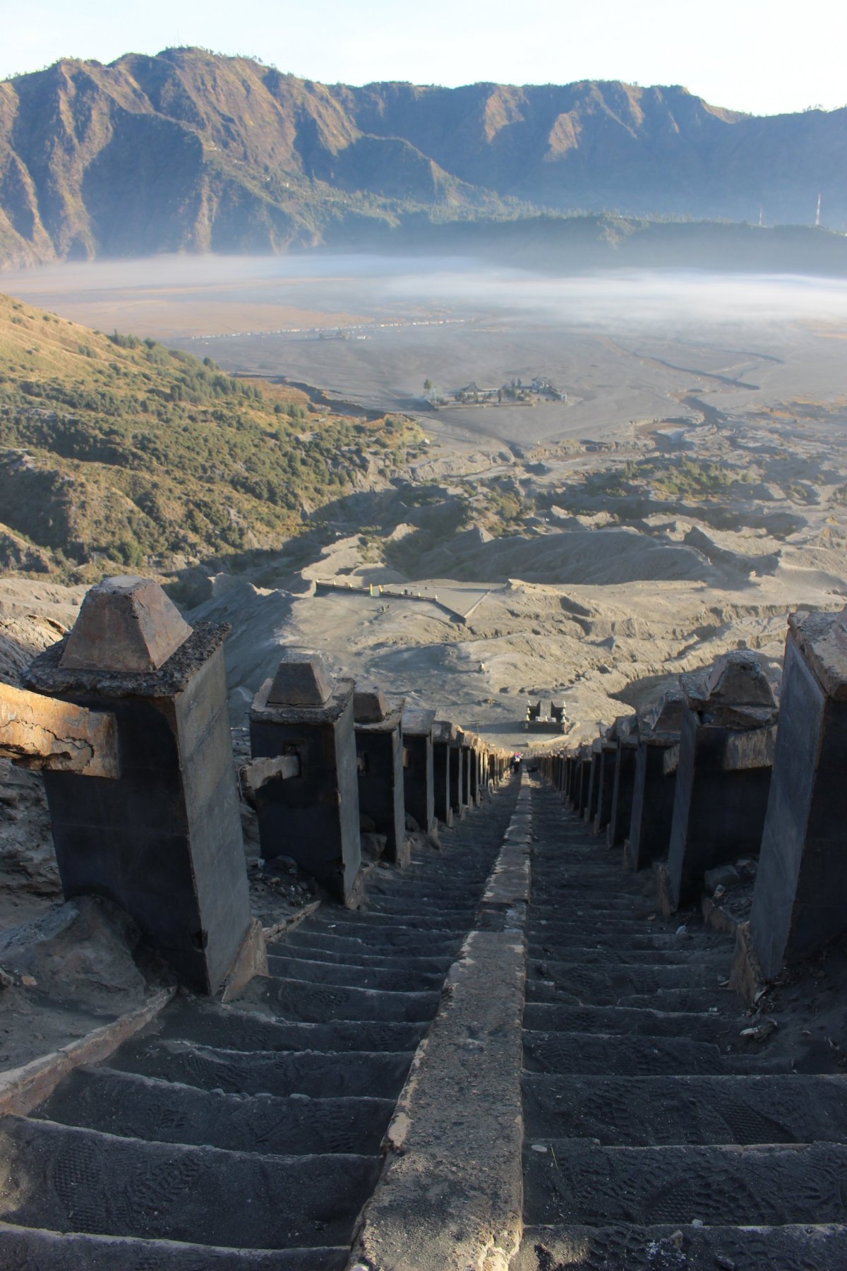 Když scházíme schody dolů, je tu už pěkný houf turistů a místní s koňmi, kteří nabízí turistům odvoz pod sopku. Pohled na koníky, kterým se podlamují kolena pod zavalitými turisty, není moc fajn a my jen nevěřícně kroutíme hlavami. Celý výstup na sopku Bromo nebyl nikterak fyzicky náročný a opravdu doporučuji užít si východ slunce přímo na sopce, než se mačkat s houfem neohleduplných asijských turistů na vyhlídce.