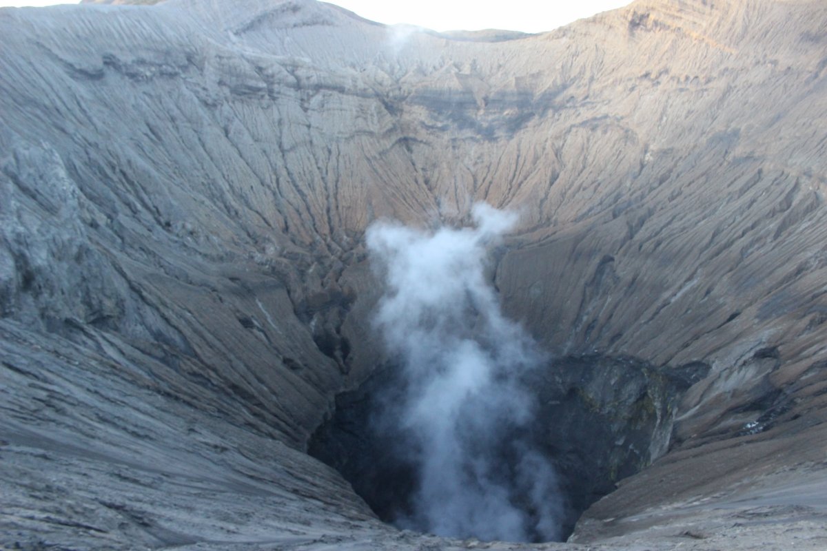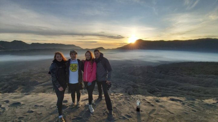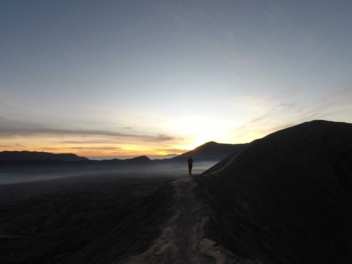 Jelikož nejsme zrovna zastánci těchto organizovaných výletů, rozhodli jsme se cestu absolvovat sami. Cesta z vesničky Cemoro Lawang přímo k sopce Mount Bromo trvá něco kolem 45 minut – 1 hodiny pěší chůze a už samotná cesta je zážitek. 3:30hod. tedy vyrážíme z našeho ubytování, vybaveni čelovkami, teplým oblečením a dostatečným množstvím vody. Pokud se vydáte po cestičce za hotelem Cemara Indah, vyhnete se platbě vysokého vstupného a cesta je i o něco kratší. Jsme rádi za čelovku, jelikož je pořádná tma, cesta je plná černého prachu a na některých místech poměrně prudká. Za pár minut jsme dole v tzv. „moři písku“. Připadáme si jako na jiné planetě. K sopce už to není daleko, a jelikož všichni turisté jezdí na východ slunce na vyhlídku, jsme tu úplně sami. Na vrchol sopky vede sposta schodů, které jsou opět pokryty všudypřítomných prachem. Okolní krajina je pokryta hustou mlhou a my si užíváme každé chvíli. Na vrcholu jsme první, po nás ještě přichází asi další 3 turisté. Pohled do nitra sopky, pak na ohromující východ slunce a okolní krajinu zahalenou hustou mlhou je opravdový zážitek. Spokojeně se procházíme po okraji sopky a nasáváme tajuplnou atmosféru. Brzy je světlo a naštěstí se začíná i oteplovat. Fotíme, kocháme se a pomalu se začínají objevovat první turisté.