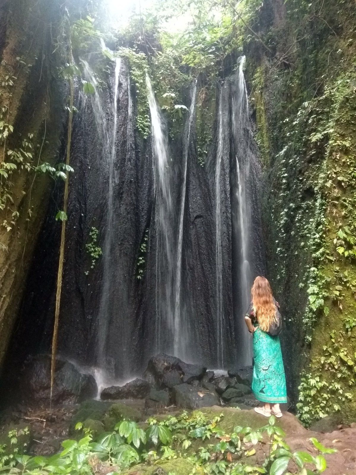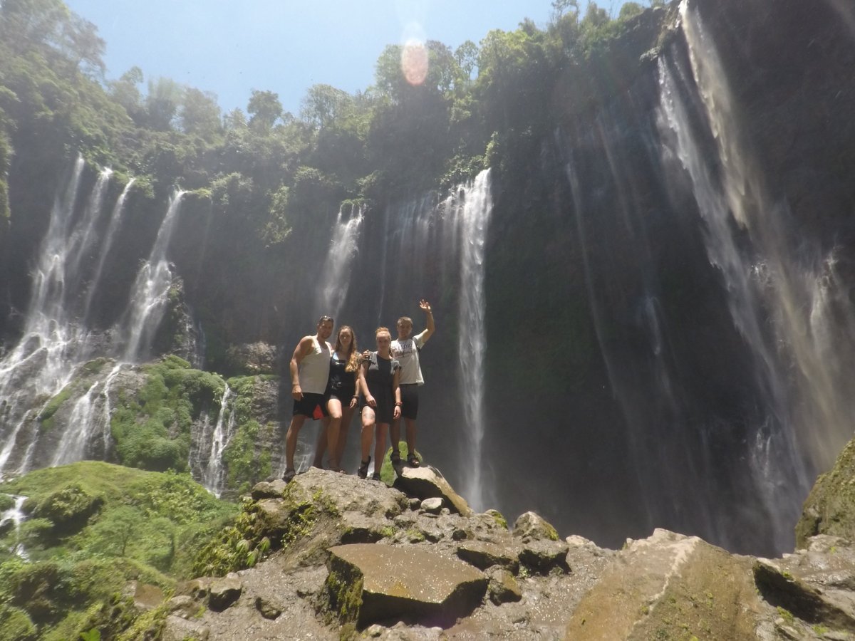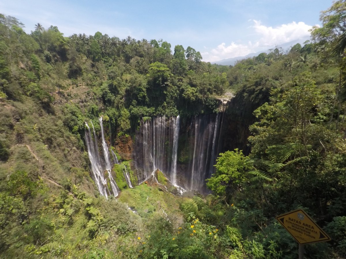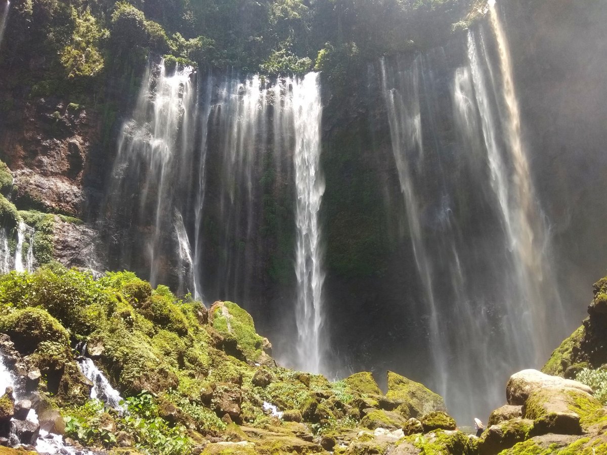 Vodopády Tumpak Sewu, známé taky jako Coban Sewu se nacházejí v oblasti Lumajang, zhruba 4 hodiny jízdy z Probolingga. Řidič nás vyzvedává v 7:00, původně jsme chtěli vyrazit dříve, ale řidič odmítl jet tak brzy, jelikož cesta je dlouhá a místy jsou nebezpečné úseky. V 11:00 jsme na místě, platíme parkovné a 20 000IDR/os. za vstup. Průvodce není třeba, cesta je hezky značená. Nejprve pokračujme na vyhlídku, která je opravdu úchvatná a určitě stojí za to. Dále pokrčujeme sestupem po bambusových žebřících dolů do kaňonu k vodopádům. Téměř po celé cestě je bambusové zábradlí, cesta je dosti kluzká kvůli bahnu a všudypřítomné vodě. Při sestupu je nutné projít přes malé vodopády, proto je vhodná pevná obuv, ale je nutné počítat s promočením. Jelikož je sobota, potkáváme několik skupinek turistů, kteří míří do kaňonu s námi. Jakmile se dostaneme dolů do kaňonu, dostáváme se k řece, pokračujeme vpravo podél řeky. U řeky stojí stánek, kde je nutné zaplatit dalších 10 000IDR/os. Po chvíli se nám rozprostírá nádherný výhled na vodopády. Všude je mokro, voda z vodopádů se tříští o stěny. Místo je to opravdu magické, procházíme se kolem vodopádů a užíváme si kouzelnou atmosféru. Trávíme tu asi hodinu a pokračujeme zpět podél řeky ke Goa Tetes. Pozor na vodu, je nutné chránit veškerou elektroniku.