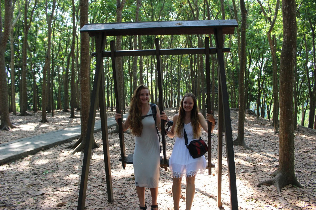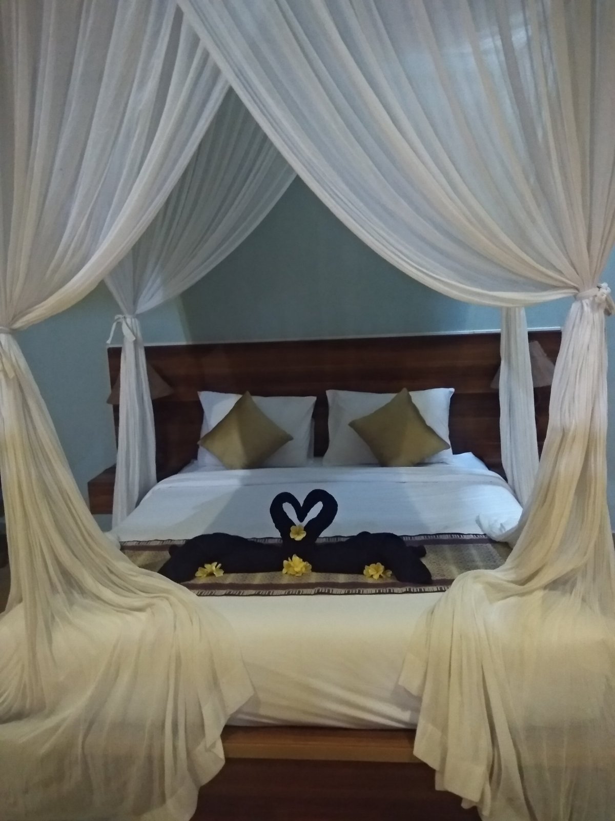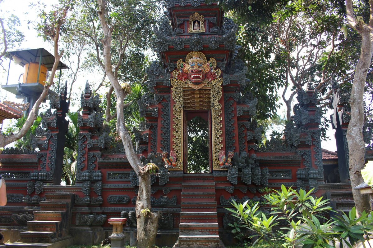 Ubytování máme zamluvené ve Villa D’Carik, podle map se ubytování nachází mezi rýžovými poli. Taxikář neví kam jet, proto ho podle mapy navigujeme. Najednou se ocitáme na konci polní cesty u rýžových polí, taxikář už se nechce znovu otáčet a hledat cestu a my jsme přesvědčeni, že už jsme velmi blízko, proto vystupujeme s tím, že ten kousek dojdeme pěšky. Bereme batohy na záda a vydáváme se malou cestičkou do rýžových polí. Po pár krocích cestička končí a všude kolem jen rýžová pole, ještě že si můžeme posvítit mobilem :D Po chvíli brouzdání se v polích narážíme na budhistický chrám, za kterým by se mělo nacházet naše ubytování, ovšem cestu nevidíme žádnou. Proto se vydáváme do chrámu. Všude zlaté sochy, krásné vytesané brány a ornamenty a mírně strašidelná hudba, vycházejícího z malého chrámu na pravé straně. Nepropadáme ale panice a po chvíli narážíme na pána, který nás posílá dál. Ano, naše ubytování se nachází hned za chrámem, v podstatě je totiž součástí chrámu :D