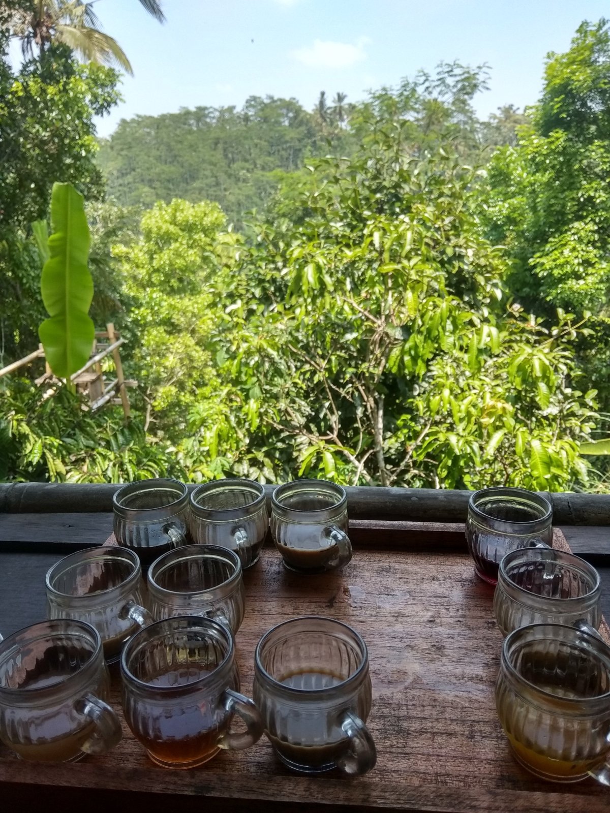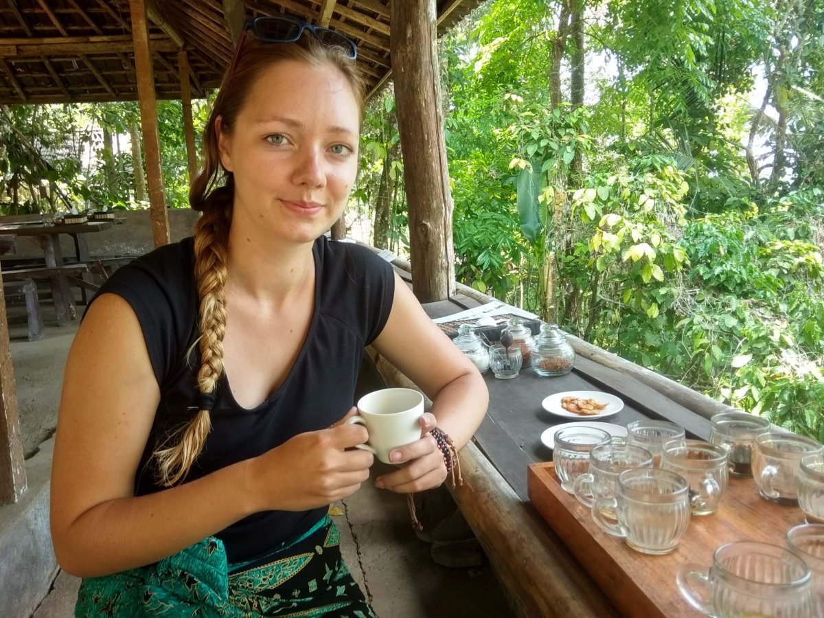 Po návštěvě vodního chrámu jsme dostali chuť na dobrou kávu, proto neváháme a po cestě zpět do Ubudu zastavujeme u místní kávové plantáže na ochutnávku káv a čajů. Ihned se nás ujímá majitel a vysvětluje pěstování kávových bobů a přípravu kávy. Následuje ochutnávka různých druhů káv a čajů, která je zdarma, avšak očekává se, že si něco zakoupíte. Objednáváme si tedy šálek známé Kopi Luwak, která se vyrábí z kávových bobů, které prošli trávícím ústrojím Cibetky. Káva je dobrá, avšak nijak zvlášť nás neuchvátila. Poté navštěvujeme malý obchůdek, kde si můžete koupit všechny druhy kávy a čajů, které jste ochutnali.