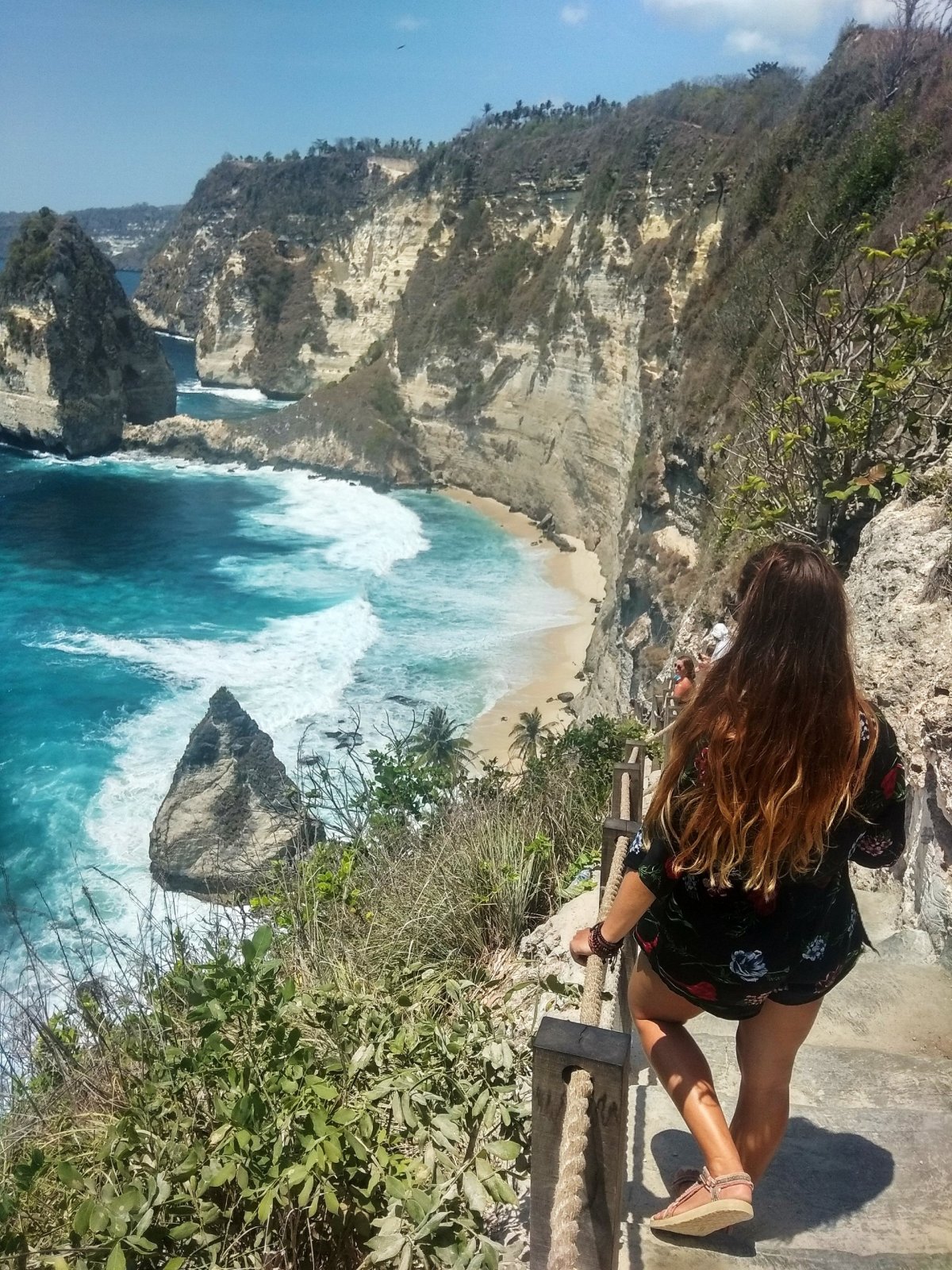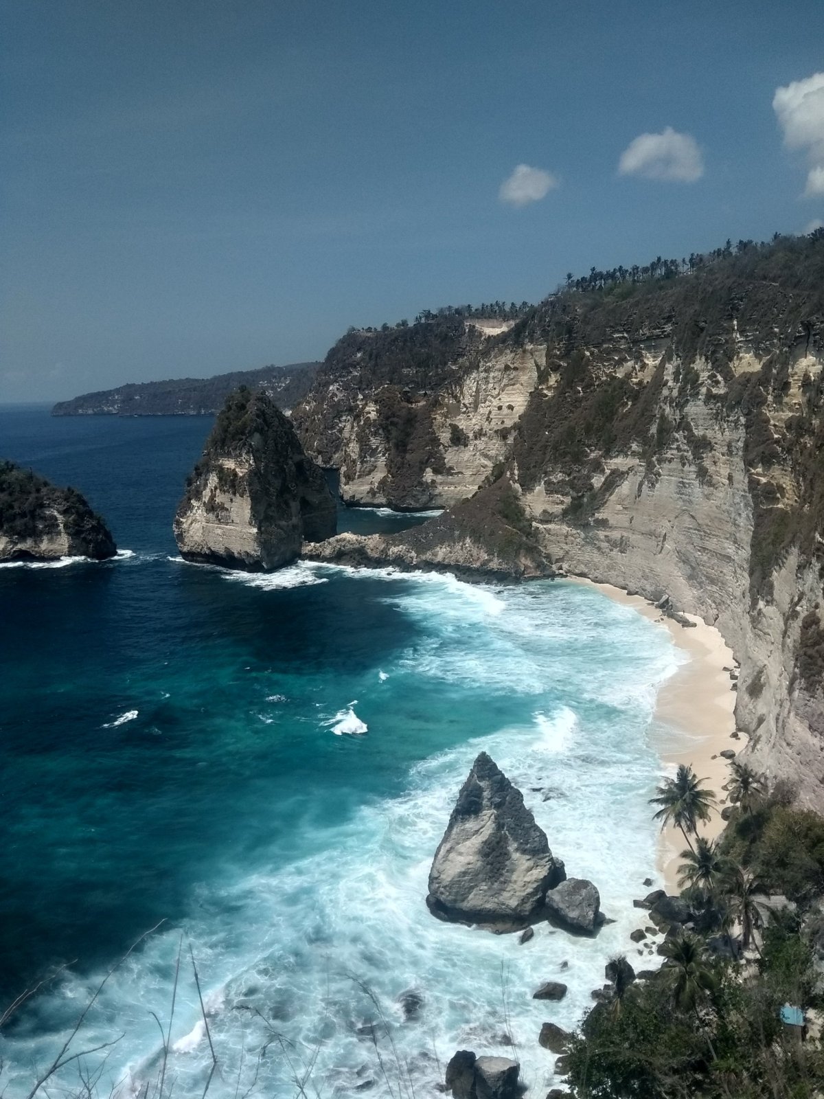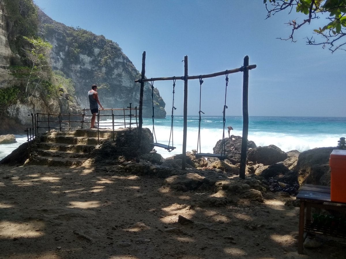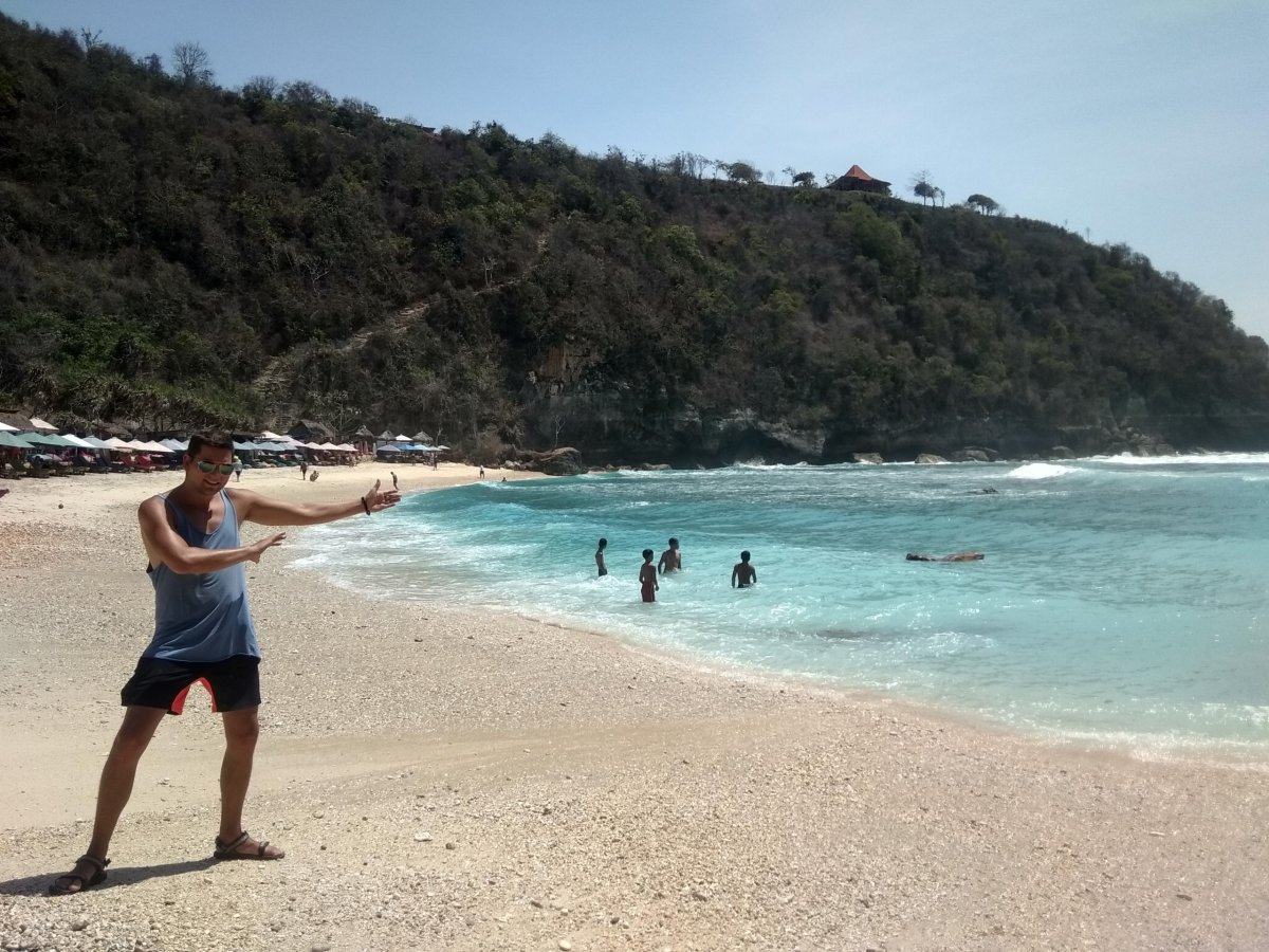 Ráno se probouzíme jako v ráji, paní domácí už nám chystá snídani. Majitelé ubytování jsou velmi příjemní a ochotní. Sedáme na skútr a jedeme vstříc krásným plážím. Jako první volíme Atuh beach, mapa nás ale vede špatně. Potkáváme malou holčičku, která nám ukazuje cestu. Parkujeme skútr, za což si u holčičky musíme koupit něco na pití a ona nám ukazuje strmou cestu po útesu k pláži. Je pravdu horko, tudíž se snažíme jít co nejrychleji. Po 40 minutách se ocitáme u pláže.
