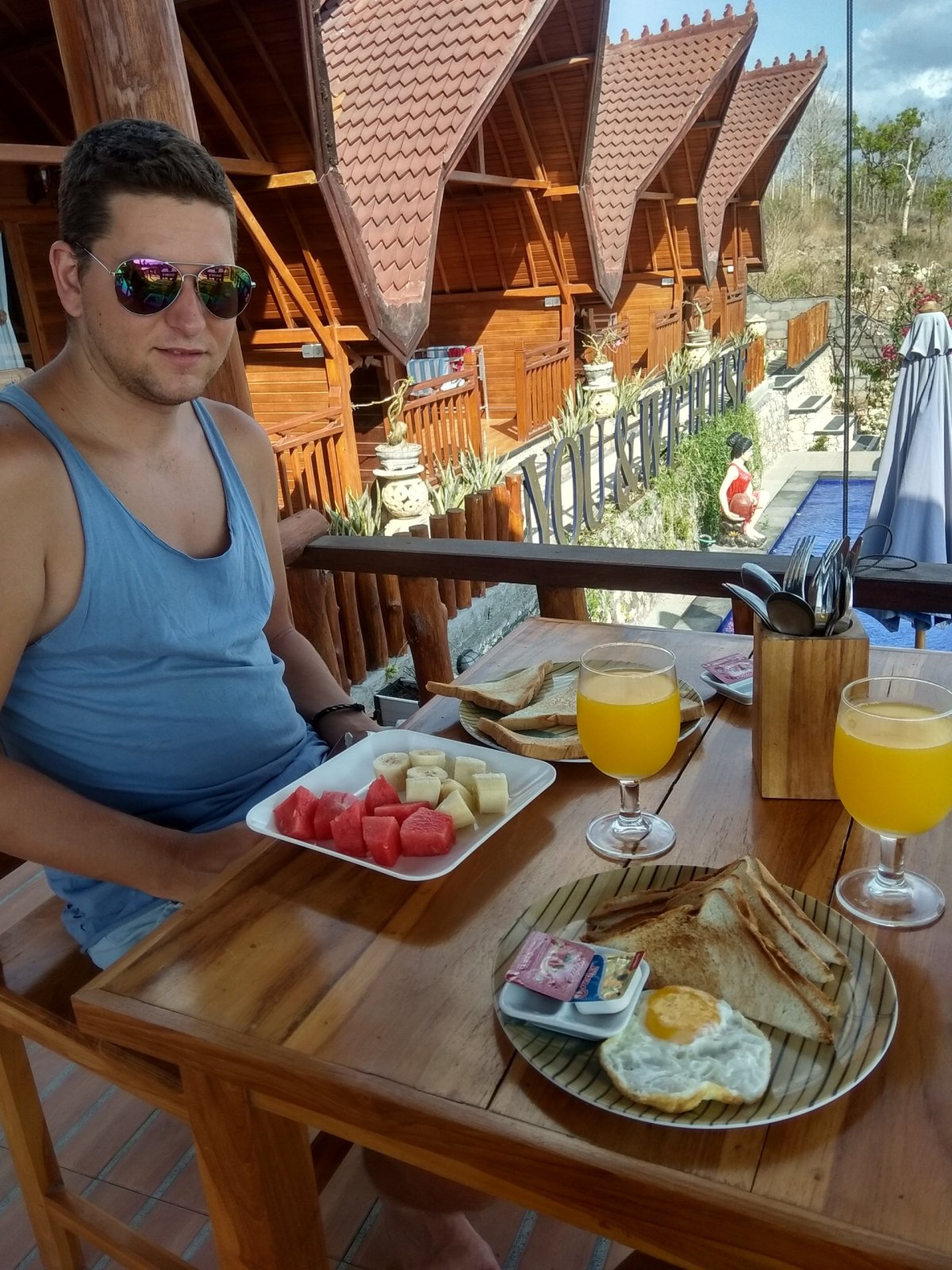 Ráno se probouzíme poměrně nevyspalí. V noci do resortu přijeli další turisté, kteří si zřejmě spletli Nusa Penidu s Bali a udělali si párty u bazénu až do ranních hodin. Zpívali, popíjeli a skákali do bazénu, čímž budili všechny v okolí. Ráno jdeme na snídani, majitelka se nám za turisty moc omlouvá, ale ona za to samozřejmě nemůže. Jsme rádi, že jsme si toto místo užili v poklidu sami a nyní už odjíždíme. Čeká nás přesun do přístavu Sampalan, odkud byl měl odjíždět trajekt. Lístky kupujeme za 120 000 IDR (skútr + 2 osoby). Trajekt v 11:00 odjíždí a ve 12:00 už vystupujeme v Padangbai na Bali. V plánu je nyní Lombok, ale protože jsme nevěděli, v kolik se vrátíme z Nusa Penidy, rezervovali jsme si jednu noc v Padangbai a na Lombok se vydáme až zítra.
