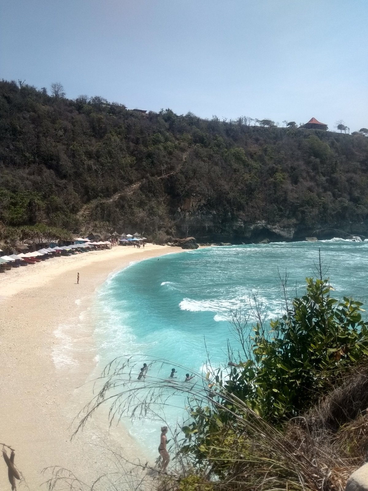 Atuh beach je krásná pláž s bílým pískem a krásnou průzračnou vodou. Téměř nikdo tu není, až na dělníky, kteří tu staví u pláže velký resort. Procházíme se po pláži, ale jelikož jsou poměrně velké vlny, čachtáme si pouze nožky. Po pravé i levé straně pláže jsou schody. Až teď nám dochází, že jsme šli nejspíš úplně špatně a měli jsme jít po těchto schodech. Nahoru se tedy vydáváme po pravém schodišti, kde se nám ukazuje krásný výhled na Diamond beach. Je zrovna příliv a tak je Diamond beach téměř celá zatopená. Proto na pláž nejdeme a pokračujeme pro náš skútr.