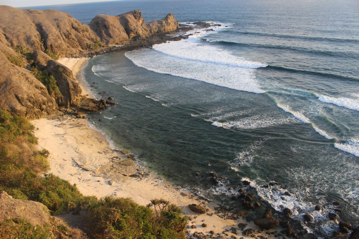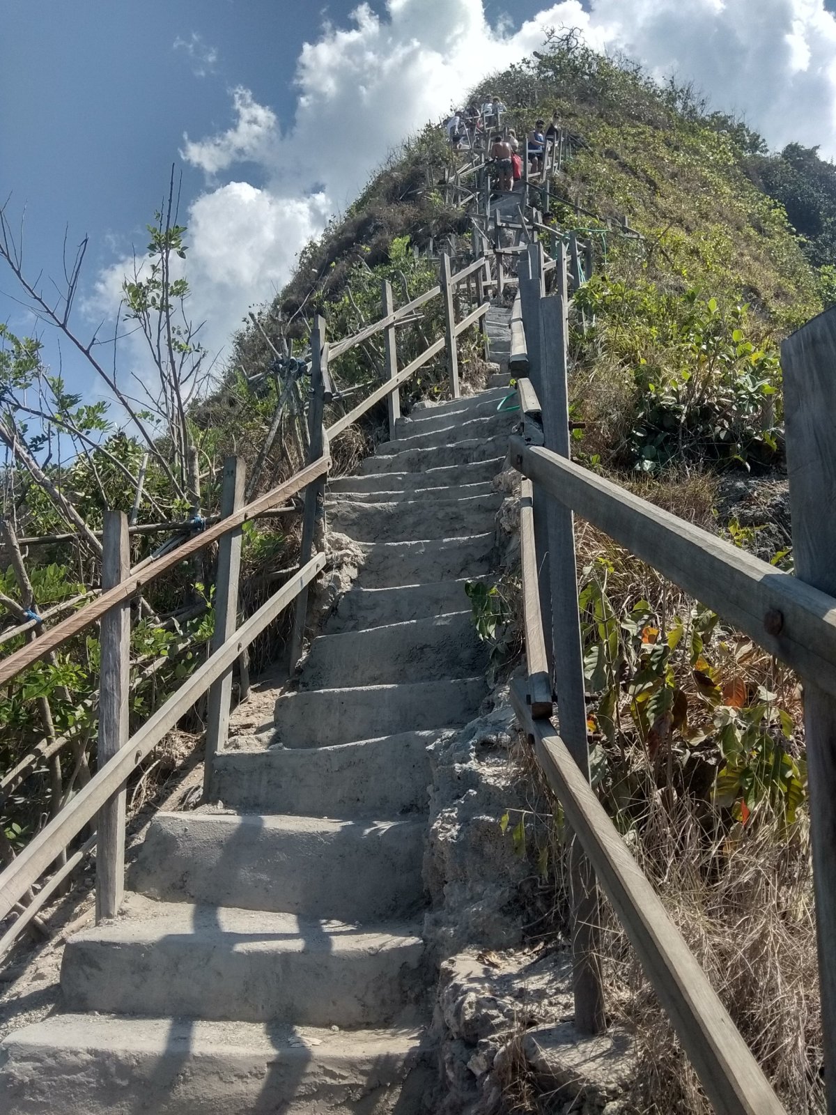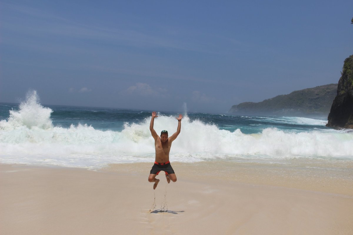 Na pláž vede dosti strmá cesta a pokud se rozhodnete jít až dolů na pláž, je dobré vzít si opět dostatek vody a pevné boty. V současné době je po celé cestě postaveno bambusové zábradlí, i tak je ale cesta strmá a poměrně nebezpečná. Na vyhlídce nad pláží byla v době naší návštěvy spousta asijských turistů, mačkajících se kvůli té nejlepší fotce. Proto jsme se vydali rovnou dolů na pláž. Výhled je z vyhlídky i po cestě opravdu krásný. Na pláži je pouze pár lidí. Koupat se na pláži nedá, jelikož jsou tu opravdu velké vlny a silný proud. I tak je pláž krásná, fotíme vlny a relaxujeme.