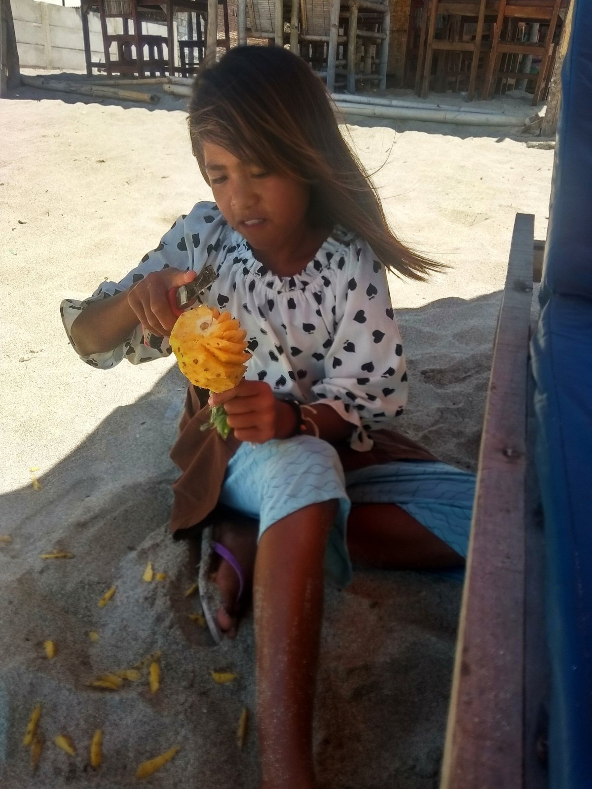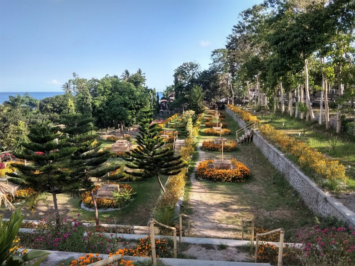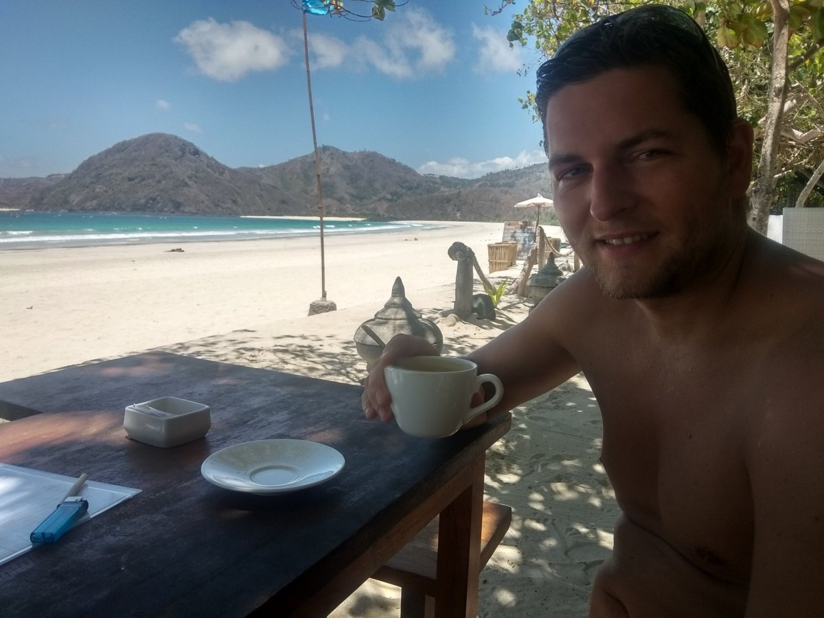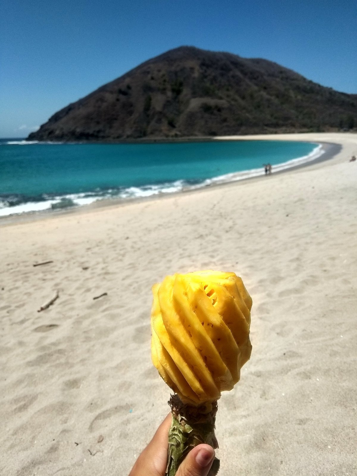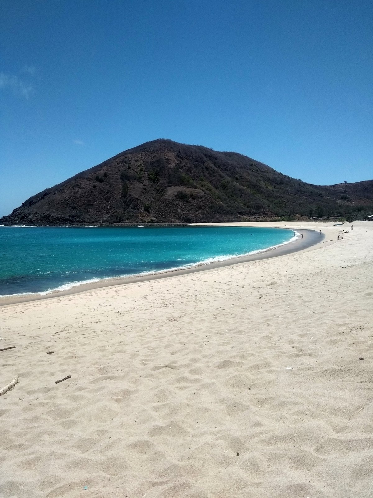 Na pláž dorážíme kolem půl 10 a kromě místních prodavačů jsme tu sami. Před vstupem na pláž platíme malý poplatek, parkujeme skútr, a protože je písek poměrně rozpálený, bereme slunečník s lehátky za 20 000IDR. Pláž je poměrně rozlehlá, voda má krásnou barvu a výhledy z pláže jsou úchvatné. Kupujeme ovocný koktejl a ananas a relaxujeme na pláži. Kolem 11 hodiny začínají přijíždět turisté a místní děti, prodávající náramky. Trávíme tu několik hodin koupáním a povídáním si s místními dětmi. Děti se s námi také koupají, hlavně na nás skáčou a přidržují se, když jde nějaká malá vlnka. Po pár hodinách u vody dostáváme hlad, takže se vracíme zpět do města na oběd a k večeru vyrážíme na Bukit Merese hill.