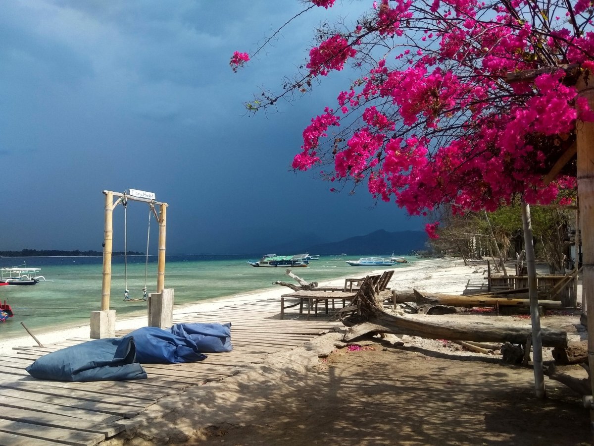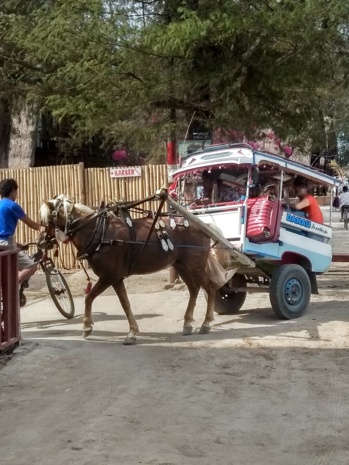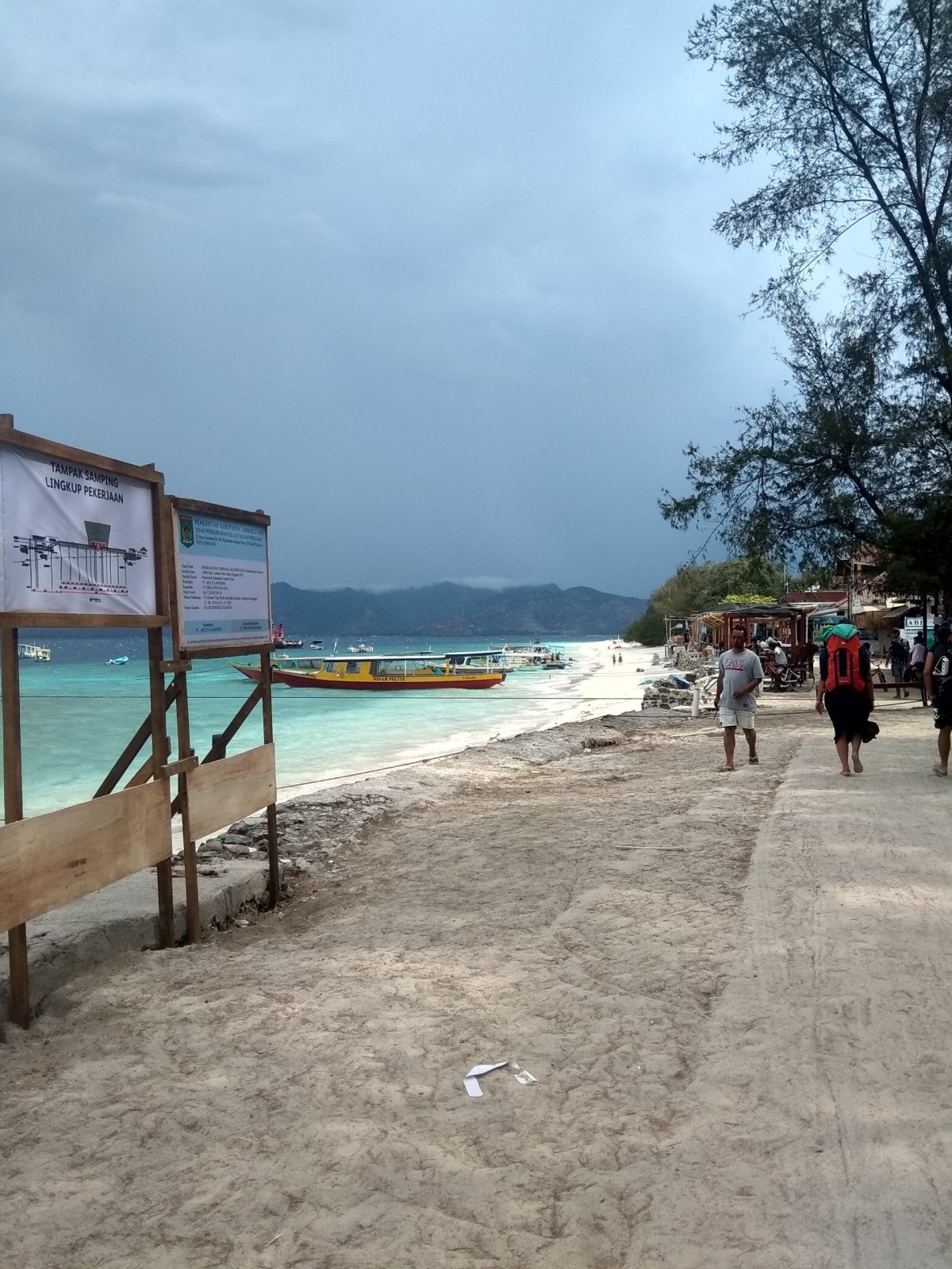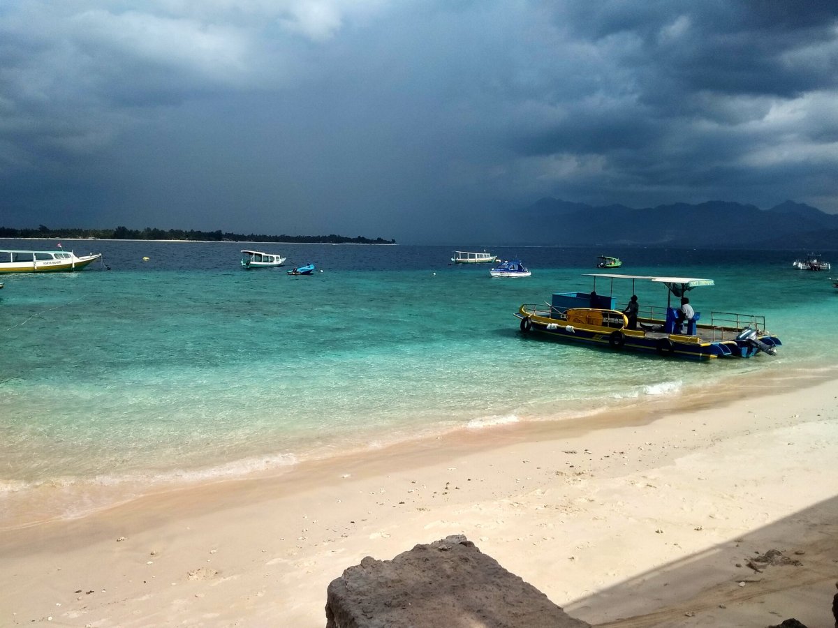Ráno nám v ubytování chystají královskou snídani. Hojně posilnění se vydáváme opět na cestu. Míříme do přístavu Bangsal, odkud odjíždí lodě na malý ostrůvek Gili Meno. Výhledy na pláže a krajinu po cestě do přístavu jsou opravdu úžasné, často zastavujeme a fotíme. V 9:30 se dostáváme do přístavu, kde na soukromém parkovišti necháváme náš skútr. U okýnka, kde se prodávají lístky na veřejnou loď na Gili Meno nám ale paní sděluje, že loď před chvílí vyplula a jelikož už není hlavní sezóna, na Gili Meno moc turistů nemíří a proto už asi žádná veřejná loď nepojede, jelikož by se nezaplnila. Tomu se nám nechce věřit a tak se rozhodujeme, že máme čas, proto chvíli počkáme a uvidíme. Moc turistů mířících na Gili Meno se opravdu neobjevilo, proto se nakonec rozhodujeme využít rychlou loď, která se kupuje také u okýnka. Platíme 85 000IDR/os. a 10:20 přesně podle jízdního řádu odplouváme. Nejprve zastavujeme na Gili Air, poté následuje Gili Meno. Celá plavba trvá jen krátce, kolem 20 – 30 minut.