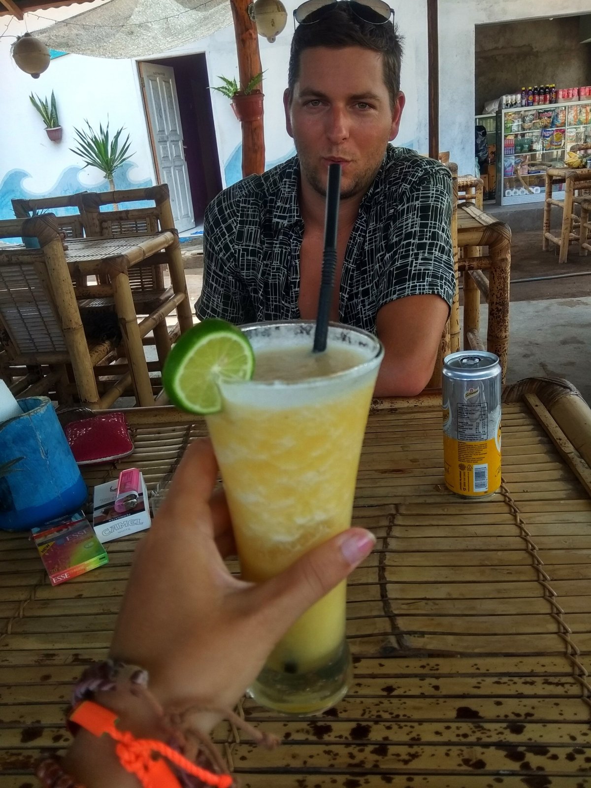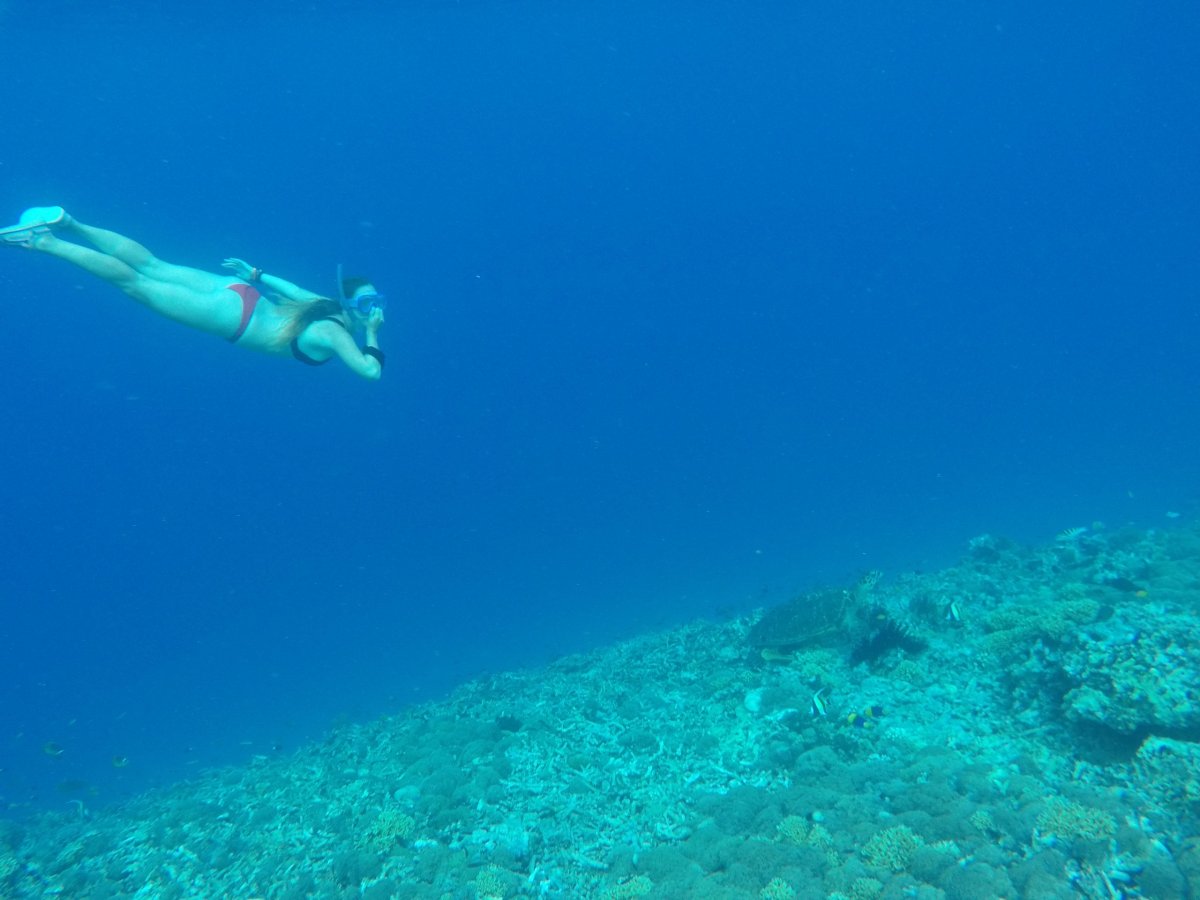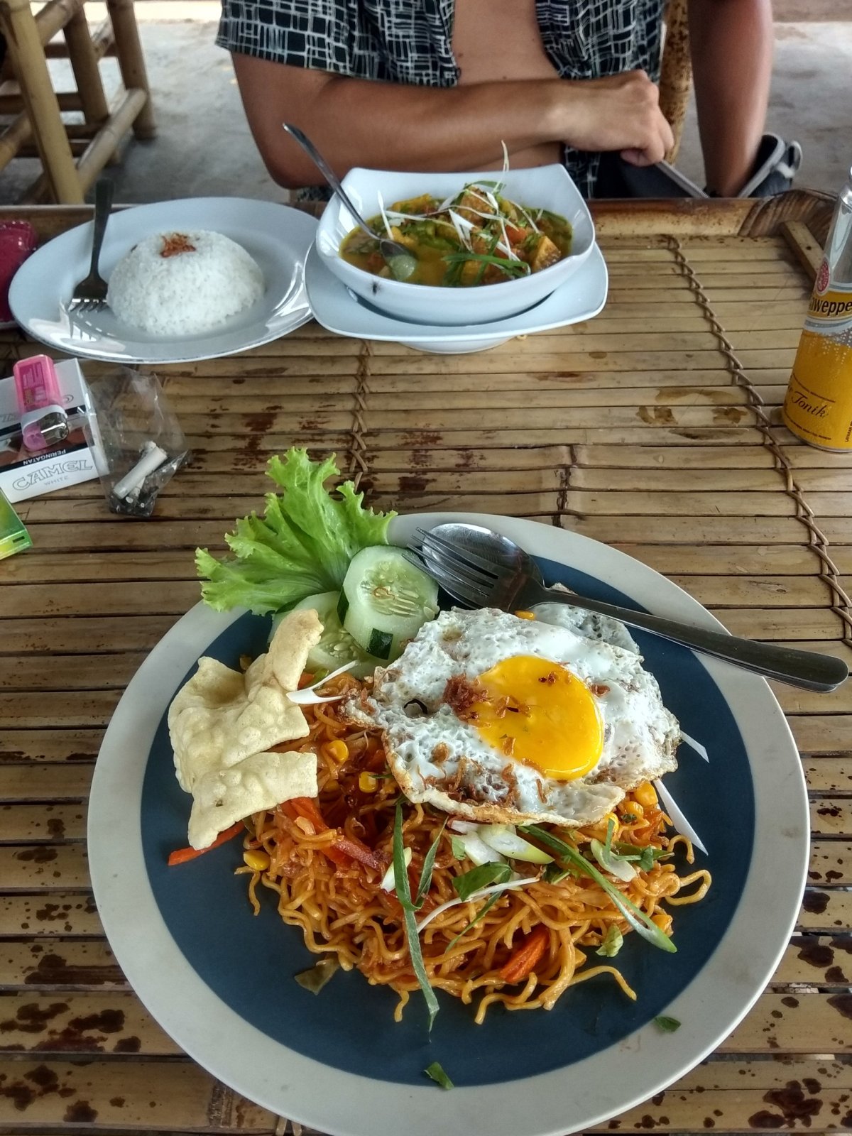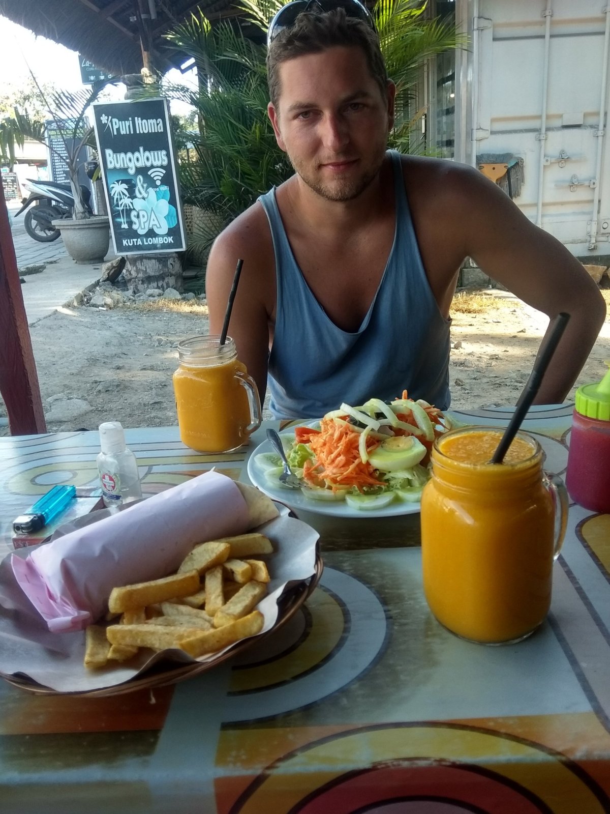 Už jsme celý nedočkaví na pořádné koupání, proto bereme plavky, šnorchly a vyrážíme na druhý konec ostrova, kde by měli být vidět želvy. Zrovna je odliv, ale to nás nezastaví. Jdeme opatrně dál, až dokud není možné plavat. Šnorchlujeme, sledujeme rybičky a vidíme i želvu. Na oběd jdeme do Jizzy Warungu, kde opravdu výborně vaří a ovocné shaky jsou nezapomenutelné. Pokud budete na Gili Menu, vřele doporučujeme, ceny jsou nízké a jídlo vynikající.