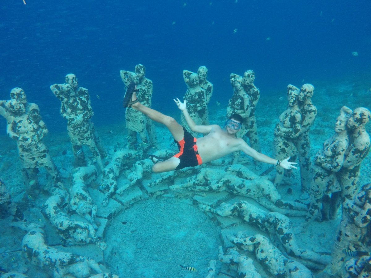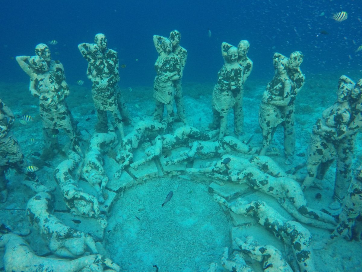 Ráno vstáváme brzy, bereme šnorchly a míříme k podvodním sochám. Cesta nám z ubytování trvá asi 30 – 40 minut. U soch jsme kole 8:15, ovšem zjišťujeme, že jsme zapomněli Go Pro.Nu což, jdeme do vody a kocháme se krásnými podvodními sochami. Je poměrně odliv, nejsou vlny, voda je krásně čistá a hlavě tu zatím nikdo není. Situace se ovšem rychle mění a to když vidíme asi 10 lodí, které sochy berou útokem. Po chvilce je okolí soch zaplněno asi milionem mačkajících se turistů v oranžových vestách. To nás rychle odradí, a proto relaxujeme na pláži. Pokud chcete tedy sochy navštívit a být tu sami, vyrazte co nejdříve. Ideálně být tu před 8 hodinou ranní. Budete mít sochy jen pro sebe a bude krásná viditelnost.