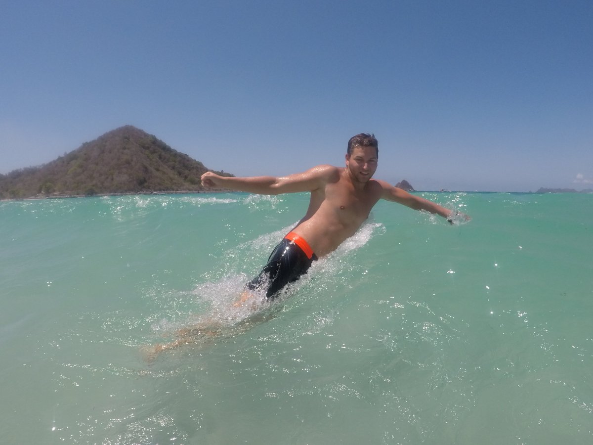 Pláž, kde nejsou tak velké vlny a proto se tu dá koupat i šnorchlovat. Parkujeme na parkovišti, na pláži je spousta turistů. Výhled z pláže je opět krásný. Vlny tu byly pouze malé, proto se konečně koupeme. Už se ale blíží západ slunce, proto na pláži chvíli relaxujeme a poté se vydáváme zpět do ubytování. Po cestě se zastavujeme na večeři, pak opět bazén a spát.
