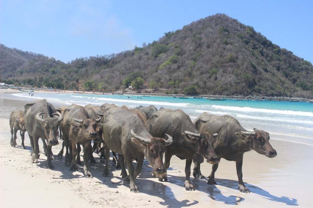 Pláž je opravdu rozlehlá, parkujeme na parkovišti, kde platíme 10 000IDR/2 osoby. Překvapuje nás spousta restaurací, stánků a také lidí. Naštěstí je pláž velká a tak se množství lidí na pláži poměrně rozprostře. Paní nám nabízí slunečníky za asi 5x vyšší cenu než na Mawun beach a dolů nejde ani o píď. Ručník dáváme na písek a jdeme do vody, která je opravdu krásná. Jsou tu i vlny, ale nijak obrovské, takže blbneme. Sem tam i nějací surfaři. Po pláži také prochází místní se stádem vodních bůvolů, což je parádní podívaná. Dáváme nějaké koktejly a potkáváme i pár Čechů. Pláž je sice krásná, ale tak nějak jsme ji čekali méně turistickou, proto brzy zvedáme kotvy a míříme dál k vodopádu Pantai nambung.