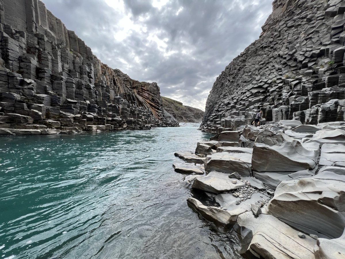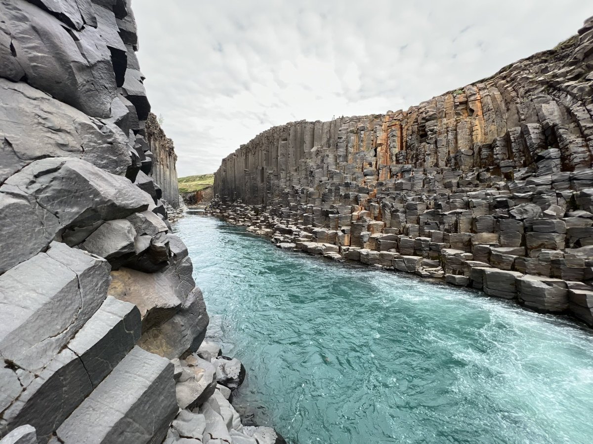 Následne nás čakala cesta na najkrajšie miesto dnešného dňa a to kaňon Stuðlagil. Ku kaňonu vedú dve cesty. Jedna začína od menšieho vodopádu, kde je aj parkovisko, od ktorého už musíte kráčať. Touto trasou sa dostanete až dolu k rieke. Druhá cesta vedie taktiež najprv na parkovisko, na ktorom je aj bufet, ale z tohto miesta uvidíte kaňon iba z rozhľadne a nedostanete sa dolu k vode.
