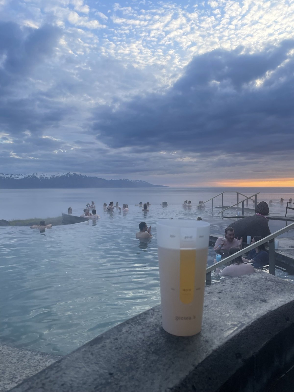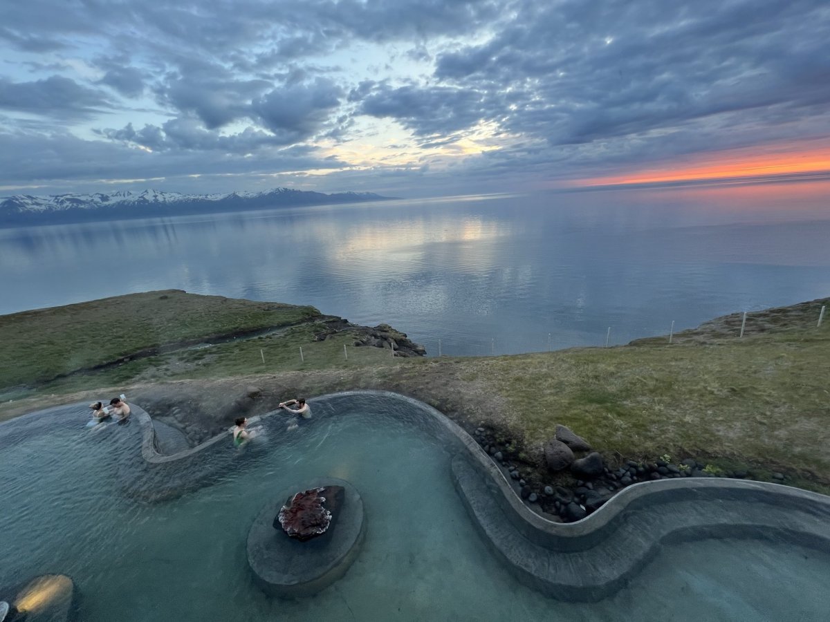 Na záver dňa sme mali výbornú večeru, asi najlepšiu na Islande, v reštaurácii Salka Restaurant. Potom sme si kúpili raňajky na ďalší deň vo vedľajšom obchode a popozerali mesto Húsavik. Večer sme strávili v termálnych jazierkach Geosea, z ktorých bol jeden z najkrajších výhľadov. Západ slnka, more, hory, teplá voda a bar. Vstup bol na osobu 5990 ISK.