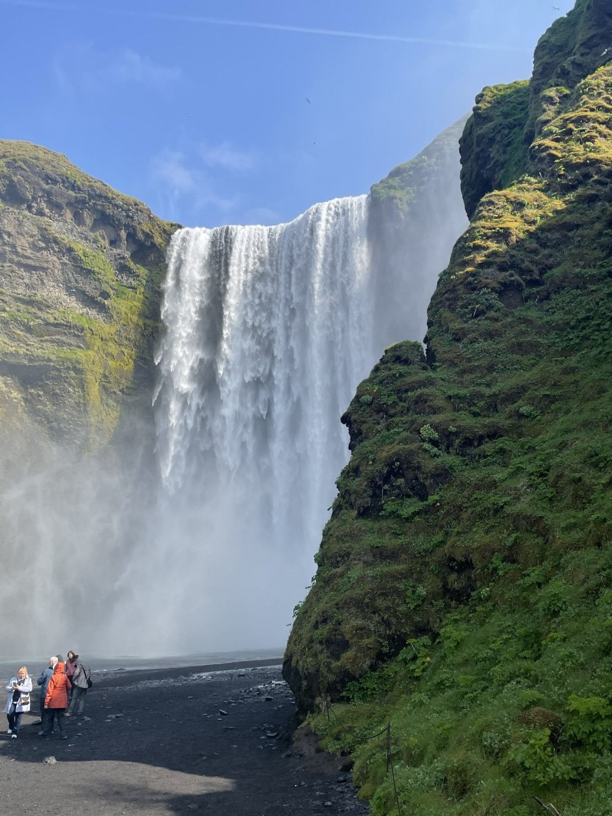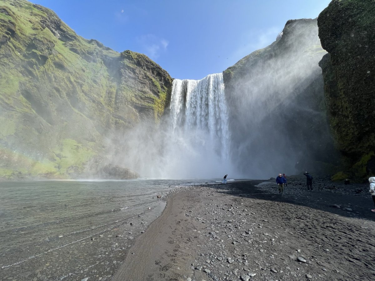 Ďalej po ceste nás do tretice čakal vodopád Skogafoss. Bolo tu veľmi veľa turistov, tak sme sa rozhodli vybehnúť na vyhliadku, ktorá je priamo nad ním.