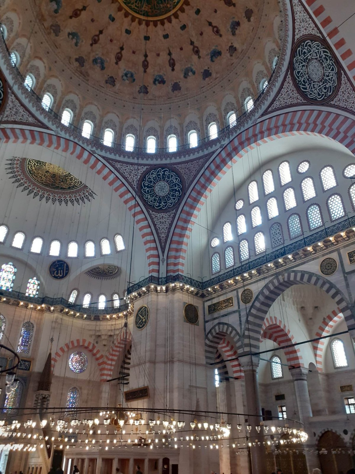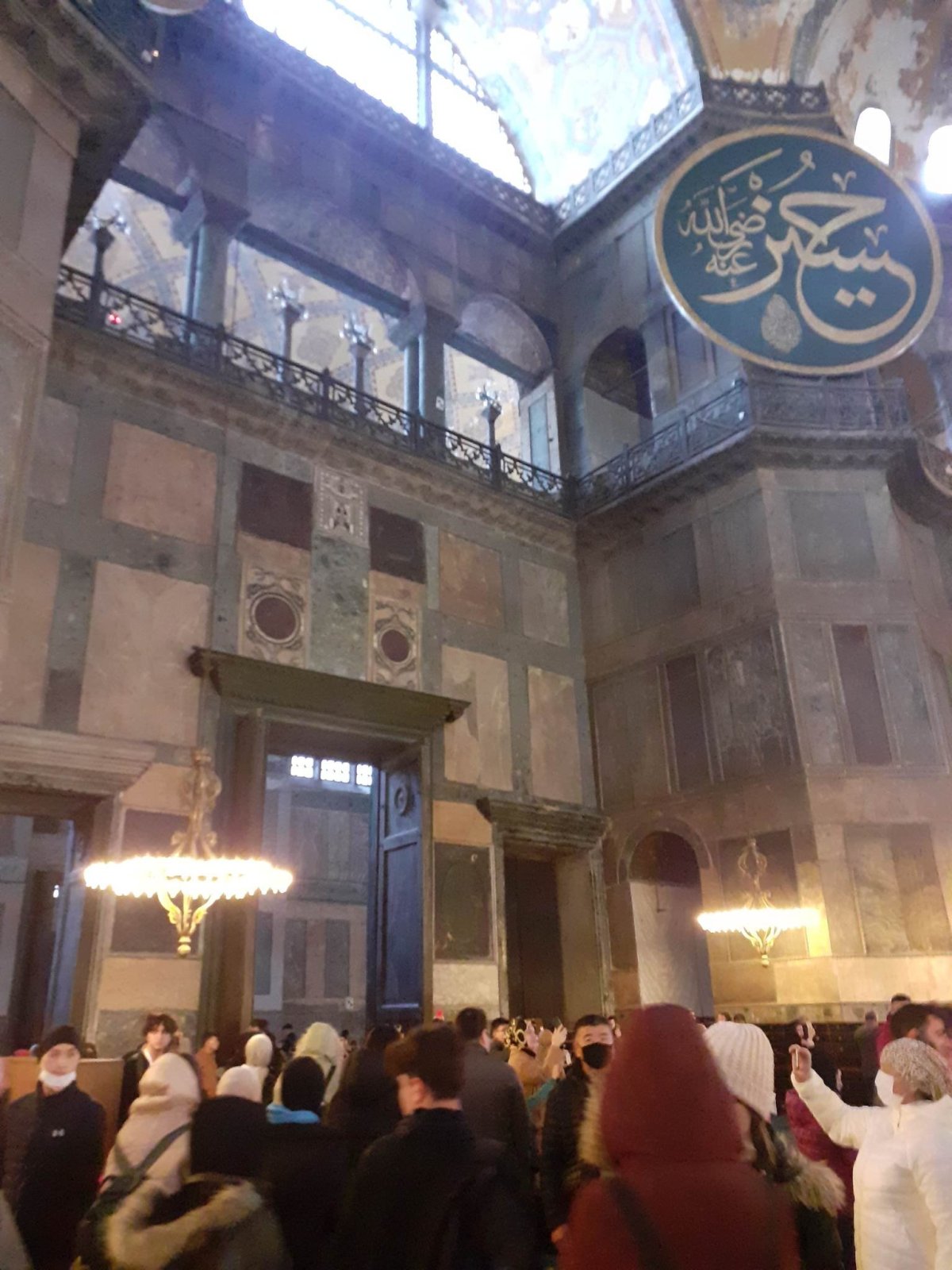 Hagia Sofia – pro mě trochu zklamání, ale když už tam jste. Je extra dlouhá fronta, ale nenechte se odradit, nakonec jsem tam stála cca jen půl hodinky. Dovnitř musíte projít přes detektor kovu, a není povoleno vnášet žádné nápoje ani jídlo. Uvnitř jako v každé mešitě je povinnost se zout a ženy musí mít zahaleny vlasy (na většině míst vám šátek případně půjčí). Jedna velká místnost se zeleným kobercem má impozantní strop a je osvětlena několika lampami a svíčkami. Přezdívaný je též jako chrám Svaté Moudrosti a byl postaven mezi roky 532 a 537.