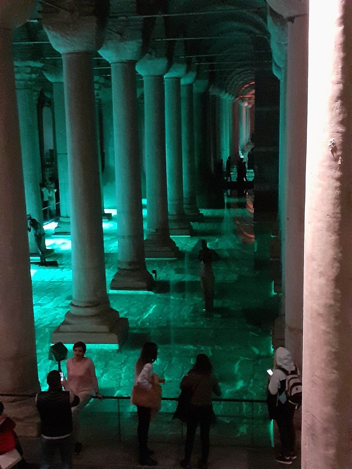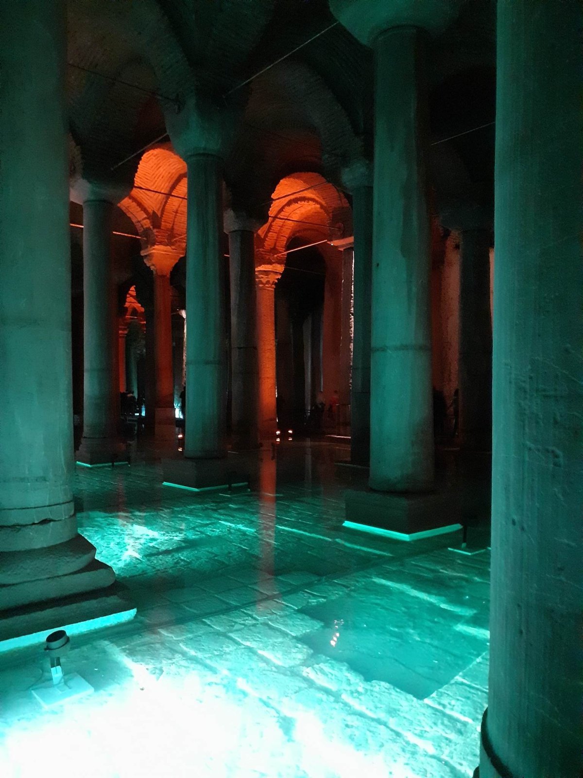 Podzemní cisterna – Bazilika Cisterna – je největší z několika starověkých cisteren. Byla postavena v 6. stolení za vlády císaře Justiniána. Jedná se o obrovské podzemí podepřené 336 mramorovými sloupy. Prostor působí impozantně, střídají se studené a teplé barvy, chodíte po lávce a pod vámi je průzračná voda. Ano, točila se zde závěrečná scéna filmu Inferno (ve filmu plavali, ve skutečnosti by vám voda byla sotva po kolena). V minulosti sloužila jako zásobárna vody pro město.