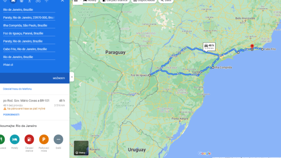 Náš okruh zahrnuje cestu z Ria na jih podél pobřeží, kde si chceme užít moře, poté plánujeme prohlídku vodopádů Iguazu falls na hranicích s Argentinou, dále máme v plánu vidět hydroelektrárnu Itaipu na řece Paraná mezi Brazílií a Paraguay. Pokud to půjde, rádi bychom překročili hranice do Argentiny a Paraguy, už jen kvůli razítku do pasu. Pak chceme pár dní strávit na brazilských plážích a nakonec na nás čeká prohlídka hlavních atrakcí v Rio de Janeiru. Po cestě chceme vychutnávat a ochutnávat vše co půjde a nemáme příliš času nazbyt. Na náš našlapaný itinerář máme jen 16 dní a to i s cestou, a trasa má podle plánovače přes 3.500 km, to je více než dva dny nonstop jízdy.