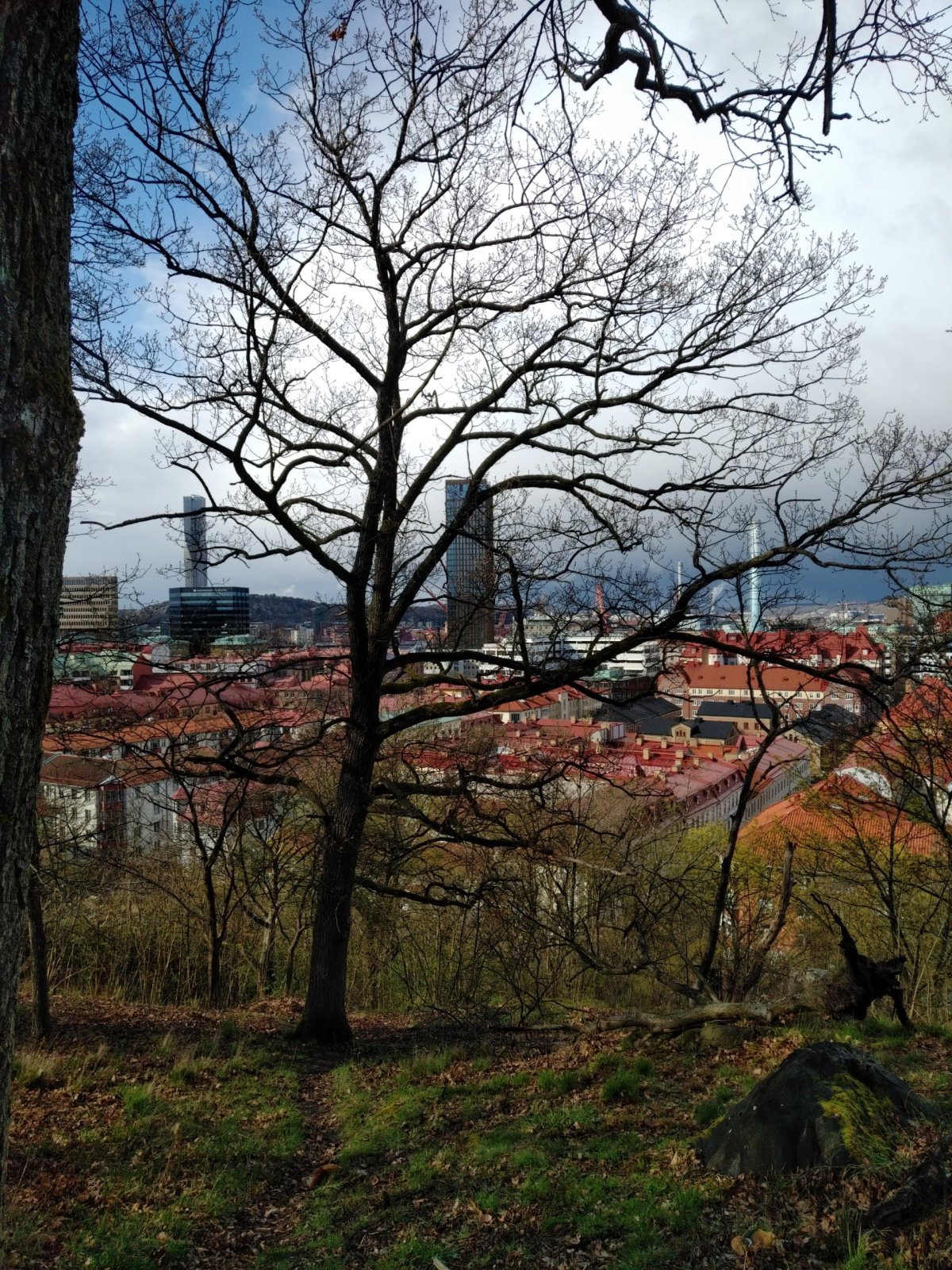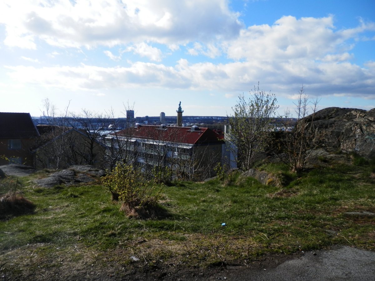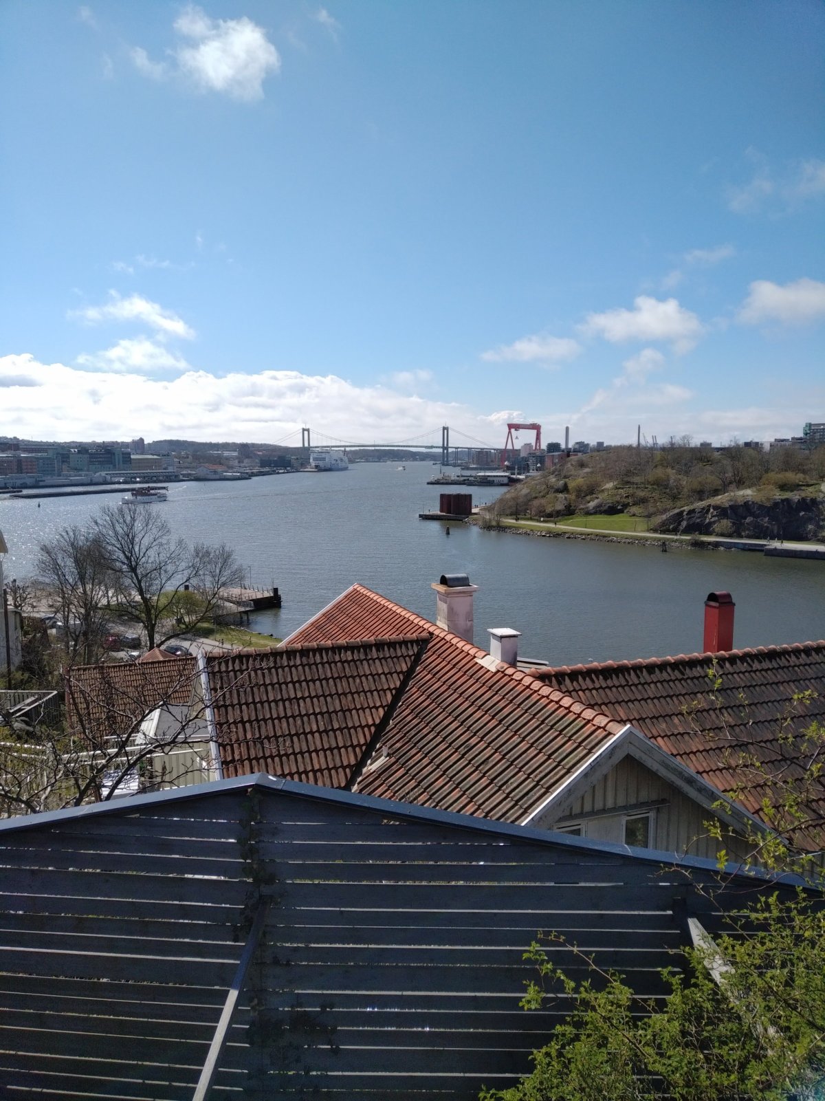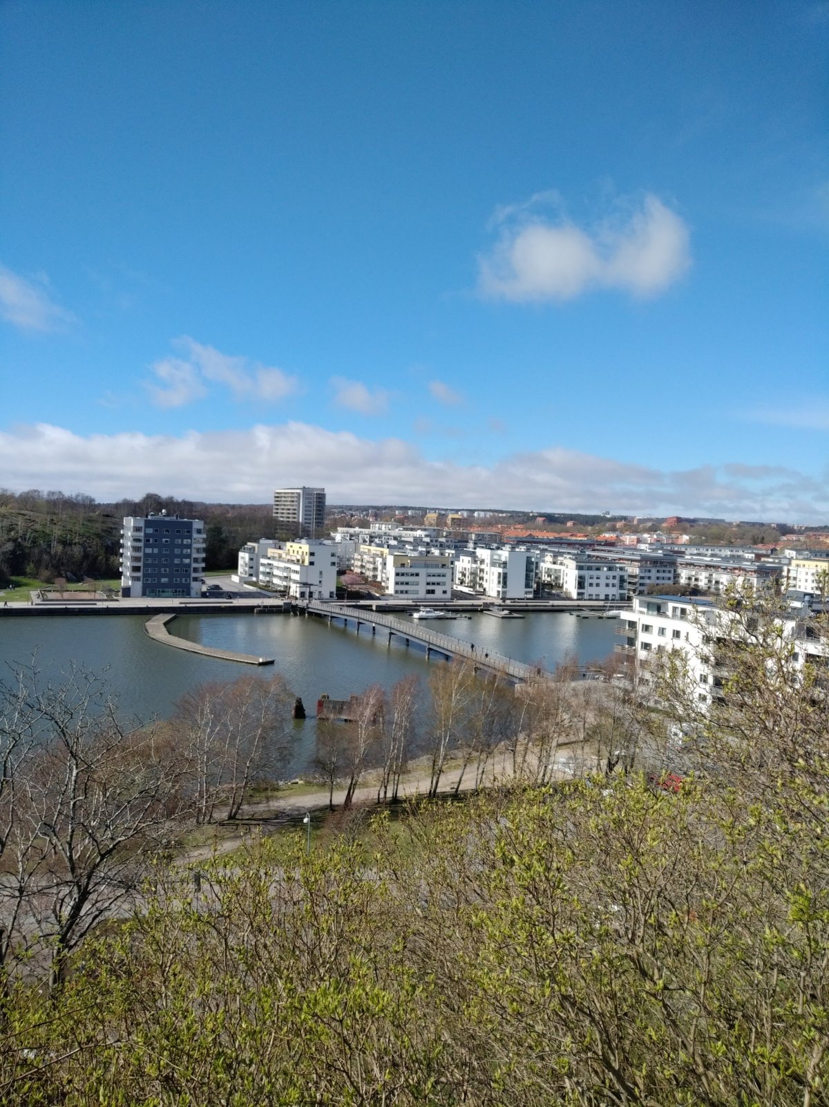 Autobus nás vyhodí kousek od nádraží. Po nezbytné prohlídce nádraží (syn je milovníkem železnice) nasedáme do autobusu a jedeme k našemu ubytování. Vyhledávání dopravy nechávám na Adamovi – aplikace a podobné vymoženosti nejsou zrovna můj šálek čaje. Pokoj pro nás ještě nemají, ale můžeme si tam nechat věci. Trochu odlehčeni vyrážíme na prohlídku města. Náš hotel stojí na břehu řeky Göta älv a hned u něj je zastávka lodi, která patří do systému hromadné dopravy. Takže jako první se jdeme projet lodí. Nejprve tak trochu omylem zamíříme z centra ven – loď dojede až k mostu Västerleden a tam končí, za 10 minut však jede zpět, takže s ní směřujeme k centru města. Míjíme Eriksberg místo bývalé loděnice nyní přestavěné na moderní čtvrť – zůstal jen jeřáb jako ikonický znak této části města. Vystoupíme na zastávce Slottsberget a vylezeme na kopeček s vyhlídkou na řeku a město – dřevěné domečky vytvářejí krásná zákoutí. Příroda je zde tak o měsíc pozadu – lístky na stromech sotva vyrážejí a kvetou narcisy. Počasí je krásně jarní, svítí sluníčko, ale od moře fouká dost studený vítr, jsem ráda, že jsem si vzala péřovku.