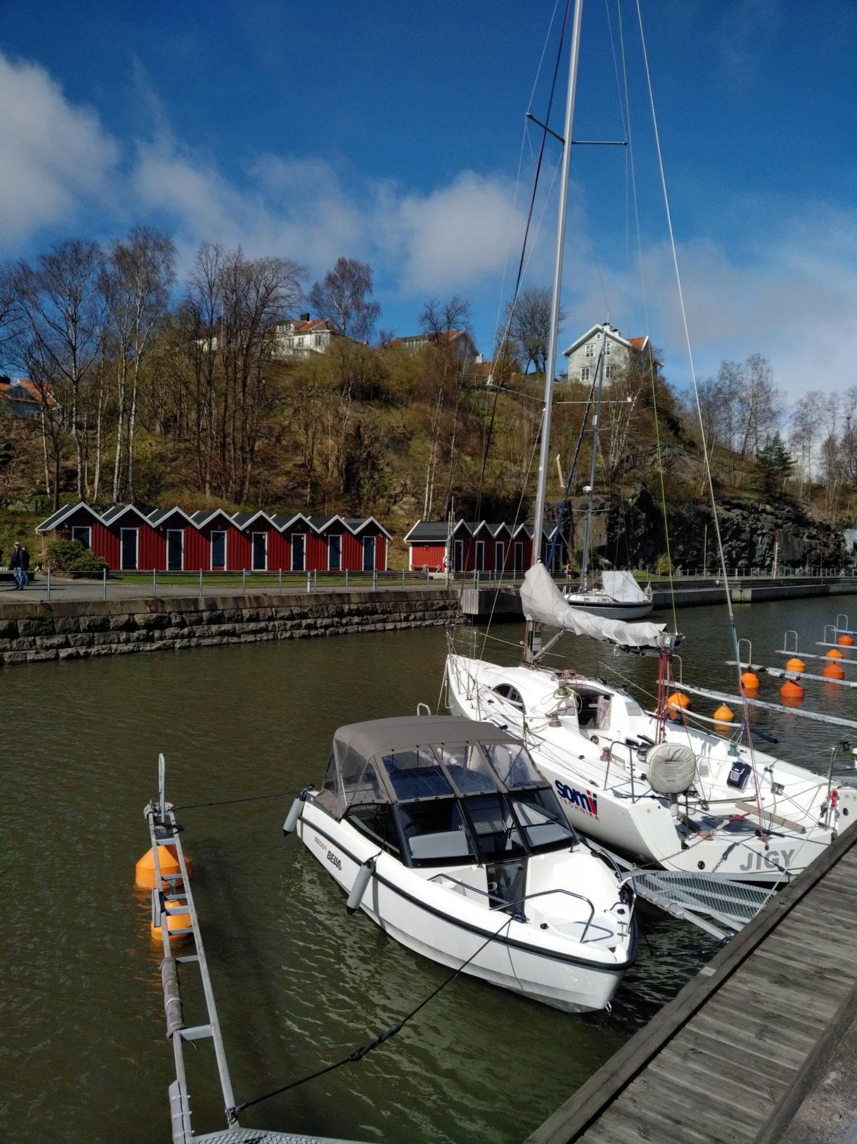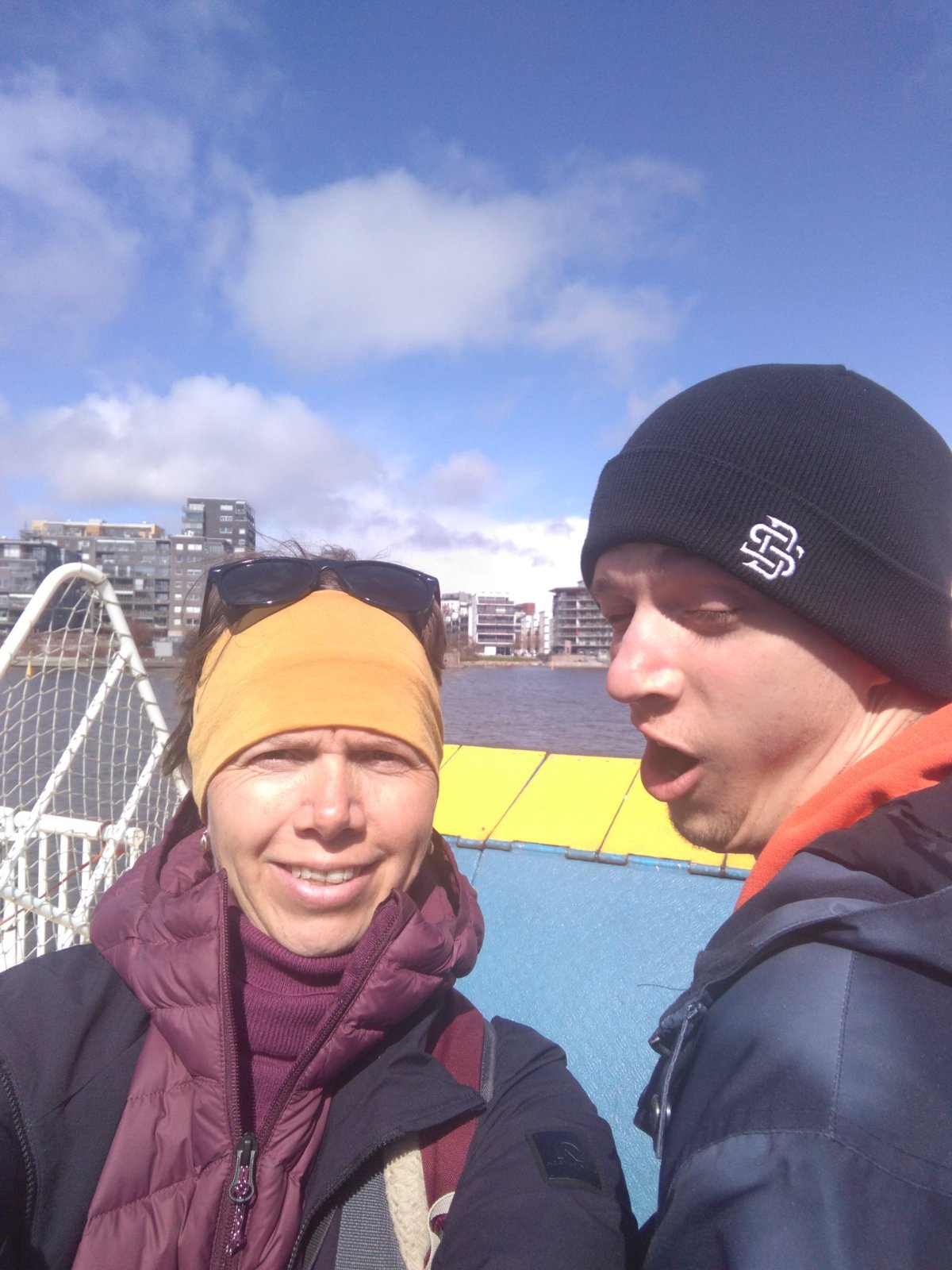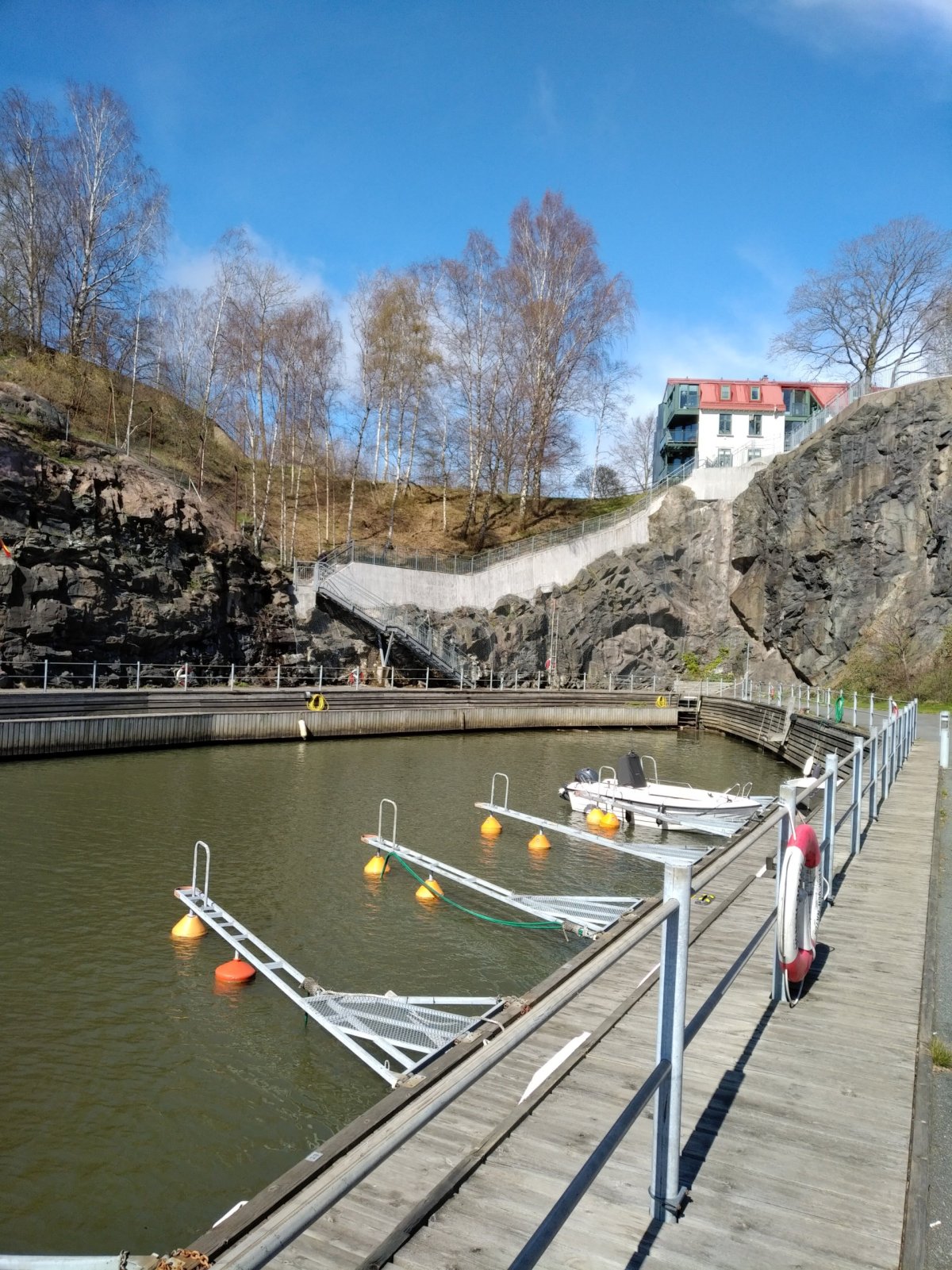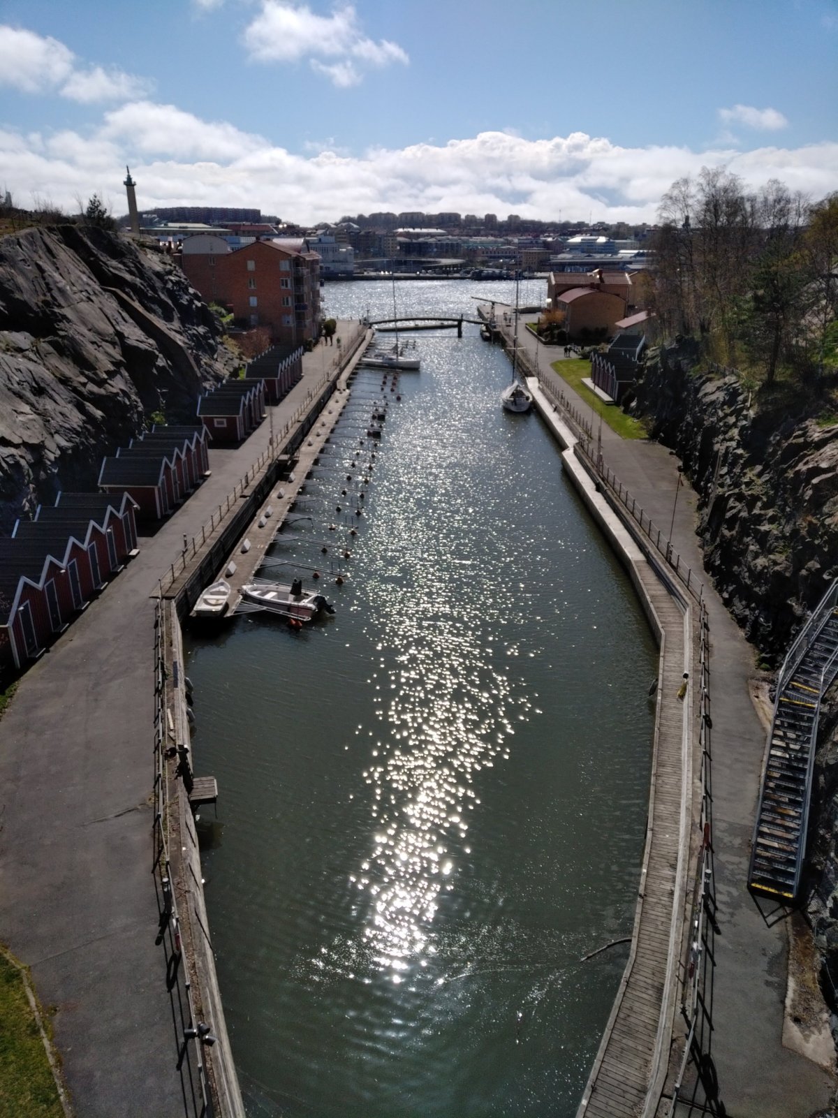 Autobus nás vyhodí kousek od nádraží. Po nezbytné prohlídce nádraží (syn je milovníkem železnice) nasedáme do autobusu a jedeme k našemu ubytování. Vyhledávání dopravy nechávám na Adamovi – aplikace a podobné vymoženosti nejsou zrovna můj šálek čaje. Pokoj pro nás ještě nemají, ale můžeme si tam nechat věci. Trochu odlehčeni vyrážíme na prohlídku města. Náš hotel stojí na břehu řeky Göta älv a hned u něj je zastávka lodi, která patří do systému hromadné dopravy. Takže jako první se jdeme projet lodí. Nejprve tak trochu omylem zamíříme z centra ven – loď dojede až k mostu Västerleden a tam končí, za 10 minut však jede zpět, takže s ní směřujeme k centru města. Míjíme Eriksberg místo bývalé loděnice nyní přestavěné na moderní čtvrť – zůstal jen jeřáb jako ikonický znak této části města. Vystoupíme na zastávce Slottsberget a vylezeme na kopeček s vyhlídkou na řeku a město – dřevěné domečky vytvářejí krásná zákoutí. Příroda je zde tak o měsíc pozadu – lístky na stromech sotva vyrážejí a kvetou narcisy. Počasí je krásně jarní, svítí sluníčko, ale od moře fouká dost studený vítr, jsem ráda, že jsem si vzala péřovku.