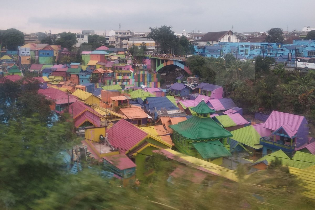 Vlaková souprava je překvapivě moderní a na nejnižší třídu i celkem pohodlná. Sice chybí klimatizace, ale na kvalitě vzduchu se to projevuje až ke konci cesty! Projíždíme kolem sopek, džunglemi i pustými poli a po sedmi hodinách cesty už se nám ty výhledy začínají pomalu zajídat. Při vjezdu do Malangu ale opět třeštíme oči na čtvrť domečků vybarvených ve všech barvách duhy. A na druhé straně mostu jsou pro změnu vidět výhradně azurově modré fasády. Překvapení nekončí, neboť na nádraží na nás čeká řidič s cedulí s našimi jmény, no prostě jako ve filmu :-) Je to tatínek naší hostitelky a mluví perfektně anglicky, protože pracuje pro firmu zabývající se zaoceánskými turistickými plavbami. Hned se ptáme na barevné domečky - prý to bývala nejhorší čtvrť, ale pak někoho napadlo to takhle nabarvit a udělat z toho turistickou atrakci. A minimálně na oko to pomohlo.
