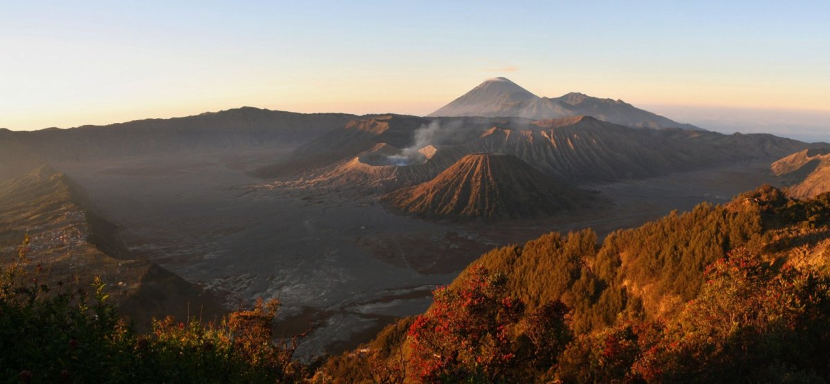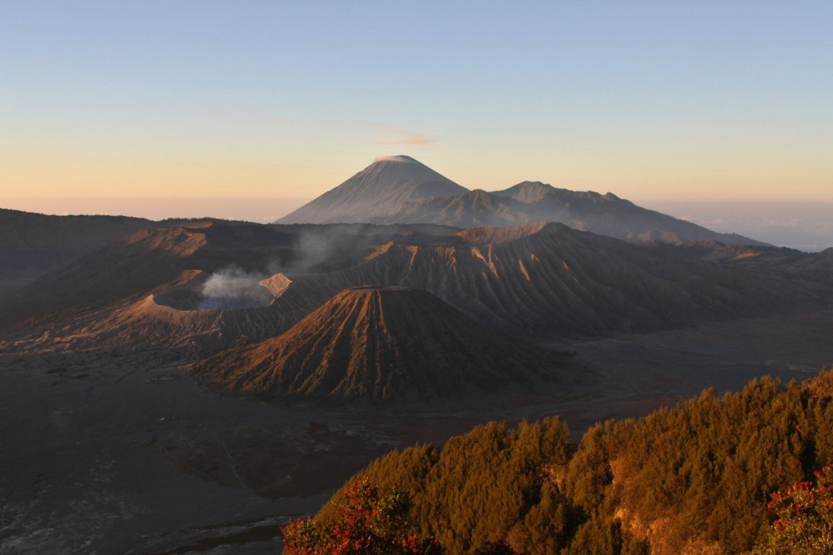 Pomalu přibývají další lidé a kolem půl páté se na obzoru začíná pozvolna rozednívat. Obloha z černé přechází do oranžové a nám se začíná odhalovat jedno z nejtypičtějších panoramat Jávy - sopky Bromo a Batok rozkládající se uvnitř rozhlehlé kaldery Tengger. V popředí stojící a dávno vyhaslá Batok kontrastuje s vedlejším vrcholem Bromo, z jehož odhalených útrob se zlověstně kouří. V dálce za nimi se jako na stráži tyčí majestátní masiv sopky Semeru. Se svými 3676m je nejvyšším vrcholem Jávy a zároveň aktivní sopkou, o čemž svědčí obláček kouře, který si každých 20 minut odfrkne (jako důsledek malinké erupce). Na Semeru se dá za 2-3 dny vylézt, ale něco si musíme nechat na jindy.
