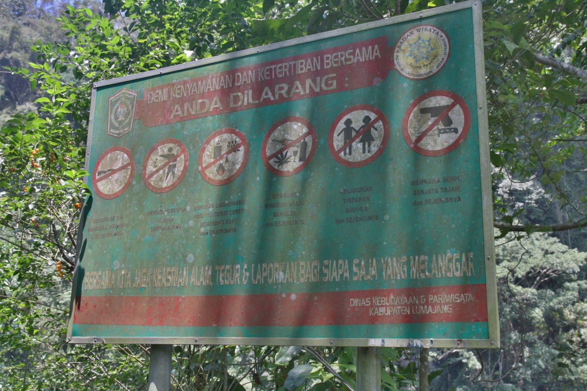 Rychle klesáme po kamenité cestě zajištěné zábradlím (nejprve kovovým, poté už “budget variantou” bambusovým). Po dešti by ta pešina byla o dost zajímavější, ale od posledních srážek už uplynul nějaký pátek. Míjíme velkou zelenou ceduli s vyjmenovanými zákazy. Kromě jasných věcí jako zahazování odpadků a rozdělávání ohně se máme vyvarovat také “páchání nemravných činů.” Tento popisek je doplněn obrázkem panáčka a panenky držících se za ruce. Tak zase nic nebude… :-) Nejen s nemravy to ale místní myslí vážně - každých pár desítek metrů míjíme odpadkový koš. Přemítáme, kdo to odsud do toho kopce vynáší.