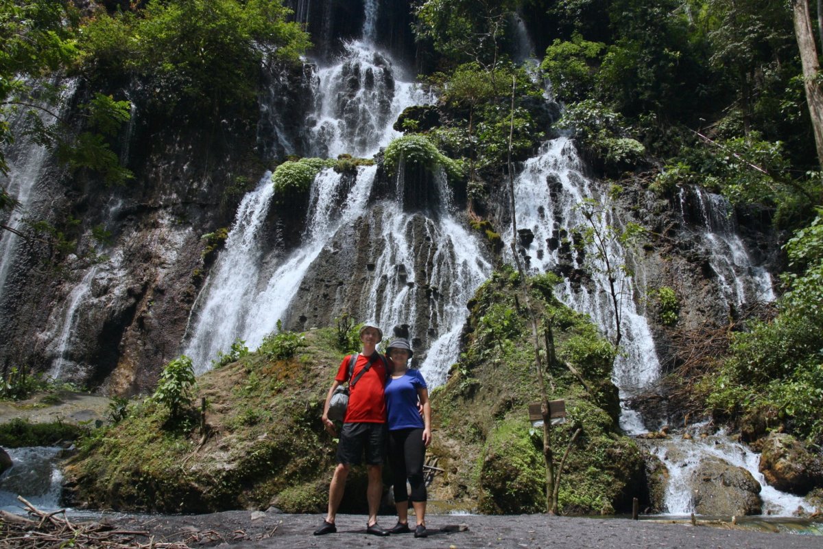 Docházíme k prvnímu vodopádu s mnoha menšími kaskádami, kde se cesta rozdvojuje. My nasazujeme gumové boty do vody, které nám půjčili naši skvělí hostitelé, zajišťujeme batohy proti namočení, a vyrážíme za tatínkem Irene vzhůru přímo proudem vodopádu! Boty nám nejspíš zachránili život, protože na žabky by to fakt nebylo. Trochu nám to sice občas sklouzne, ale za chvíli už máme krok jistější. Pod nohama nám zurčí průzračný potok a ze skal kolem nás stékají proudy vody a prší kapky. Zastavujeme v mělkém rybníčku pod jedním z útesů, na jehož vrcholu se nachází Goa Tetes, doslova přeloženo “jeskyně kapek”. S tátou Irene si tam jdeme vylézt, zatímco holky nám budou dole hlídat záda. Stoupání sedmimetrovou vápencovou stěnou proti valící se vodě je naprostá lezecká lahůdka! I když není extra strmá a chytů je dost, tak každý krok do tekoucí vody je zážitek. Nahoře nás za odměnu čeká jeskyně s křišťálově čistým jezírkem po pás a nekonečným deštěm. Polední sluníčko atmosféru dotváří duhovými efekty. Fantazie.