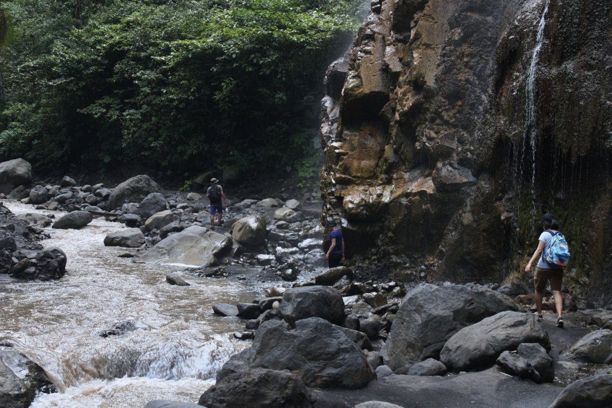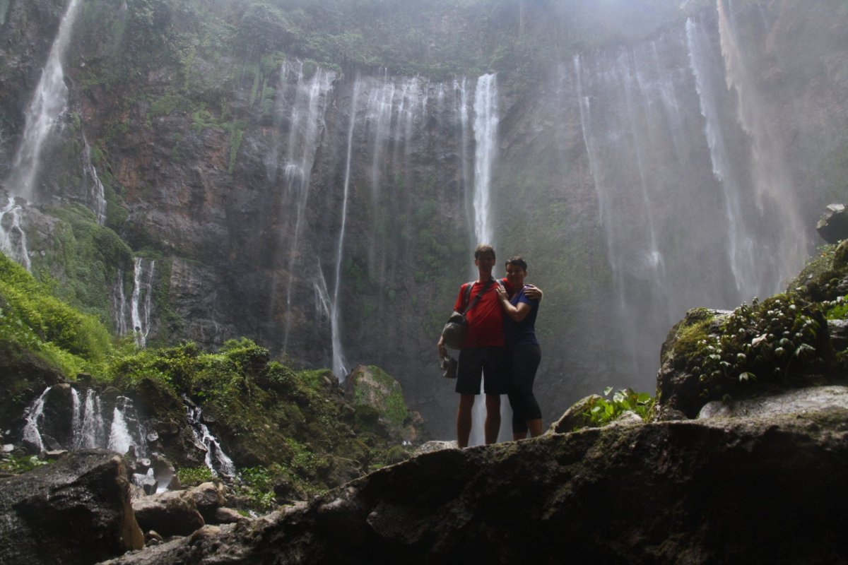 Po improvizovaném mostku překračujeme řeku a o pár kroků dále se nám za velkým balvanem naskytne opravdu neskutečný pohled. Před námi je kruhovité údolíčku, do kterého po celém jeho obvodu spadají stodvacetimetrové vodopády. Se spadlými čelistmi nevěřícně zíráme a vůbec nevnímáme, že jsme skrz naskrz promočení vodní tříští, která se proti nám válí jako nikdy nekončící liják. Po vstřebání se bez věcí jdeme podívat ještě blíž a po přebrodění řeky se ocitáme přímo pod útesem. Neodoláváme a na chvíli si stoupáme přímo do proudu nejkrásnějšího vodopádu na Jávě, který máme jen a jen pro sebe!