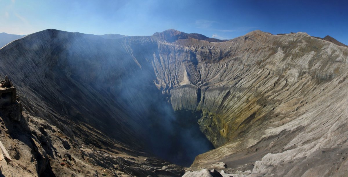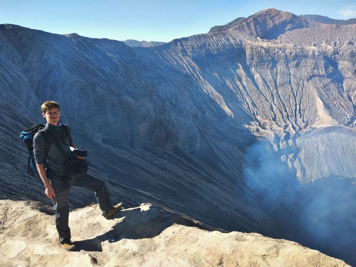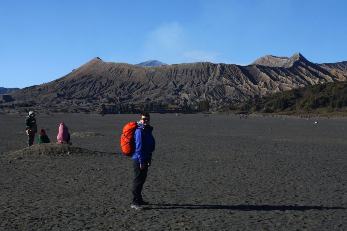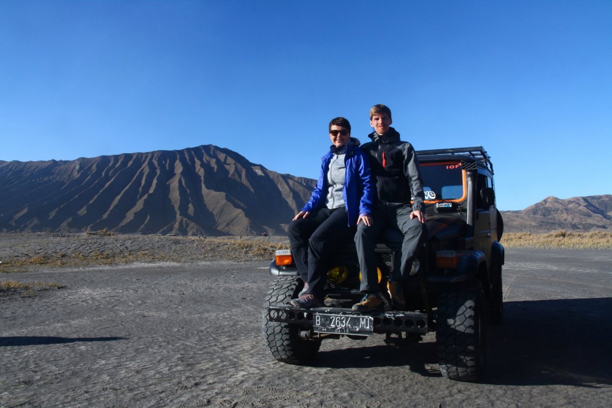 Rozednívá se a my si užíváme nádherné výhledy a možná ještě víc hřejivé sluneční paprsky. Na šestou se vracíme k džípu a sjíždíme do kaldery, kde absolvujeme povinný fotoshoot na kapotě. Poté písečným terénem vyrážíme k nedaleké sopce Bromo. Cestou míjíme spousty lidí, chrám a také poníky, kterých zde můžete využít jako přibližováku. Výstup rozhodně není žádný velký výkon, neboť na samý okraj kráteru dokonce vedou schody. Místo je sice turisticky neskutečně profláklé, nicméně návštěvy rozhodně nelitujeme. Nahoře s respektem hledíme do útrob aktivní sopky a pomalu nám dochází, kde že to vlastně stojíme! Osmělujeme se a po úzké pěšince popocházíme kousek dál podél okraje sopky, kde už žádní lidé nejsou a můžeme tu nerušeně vzdychat nadšením, fotit a natáčet. Kromě pohledu do nitra sopky nelze zapomenout ani na fantastické panorama kaldery Tengger, které se odsud rozkládá.