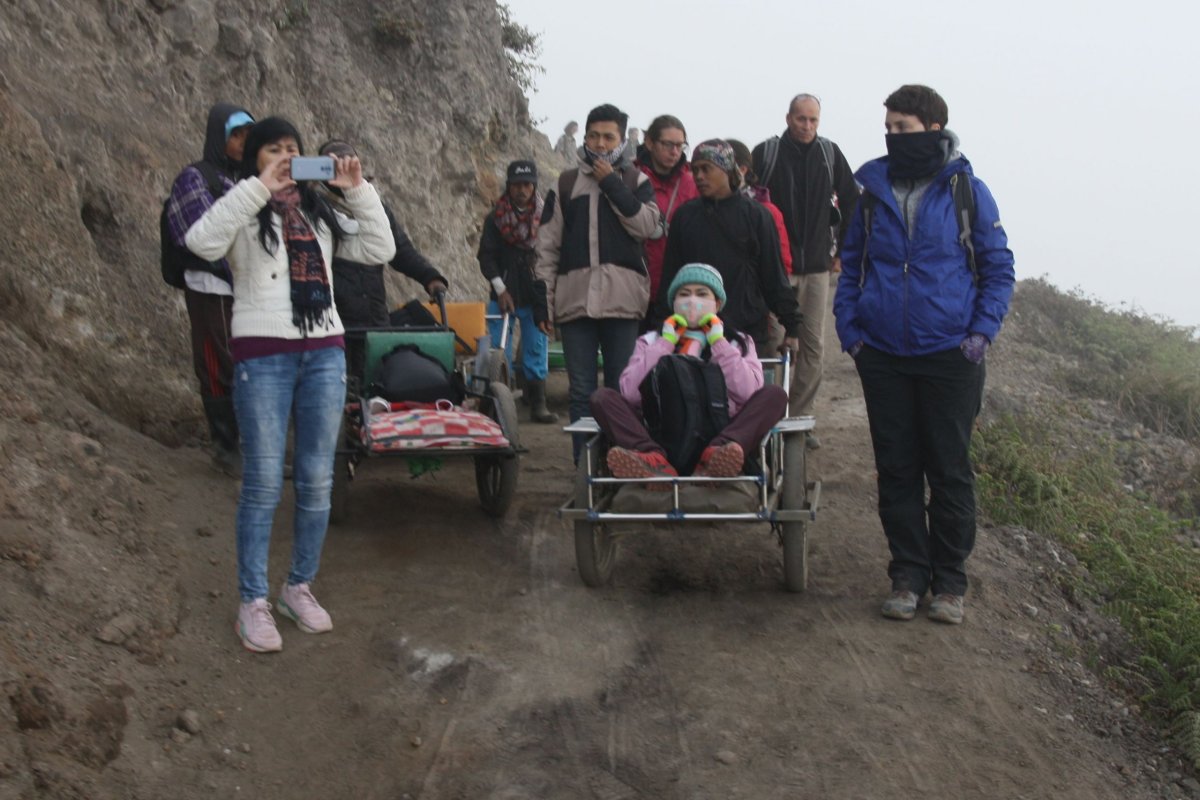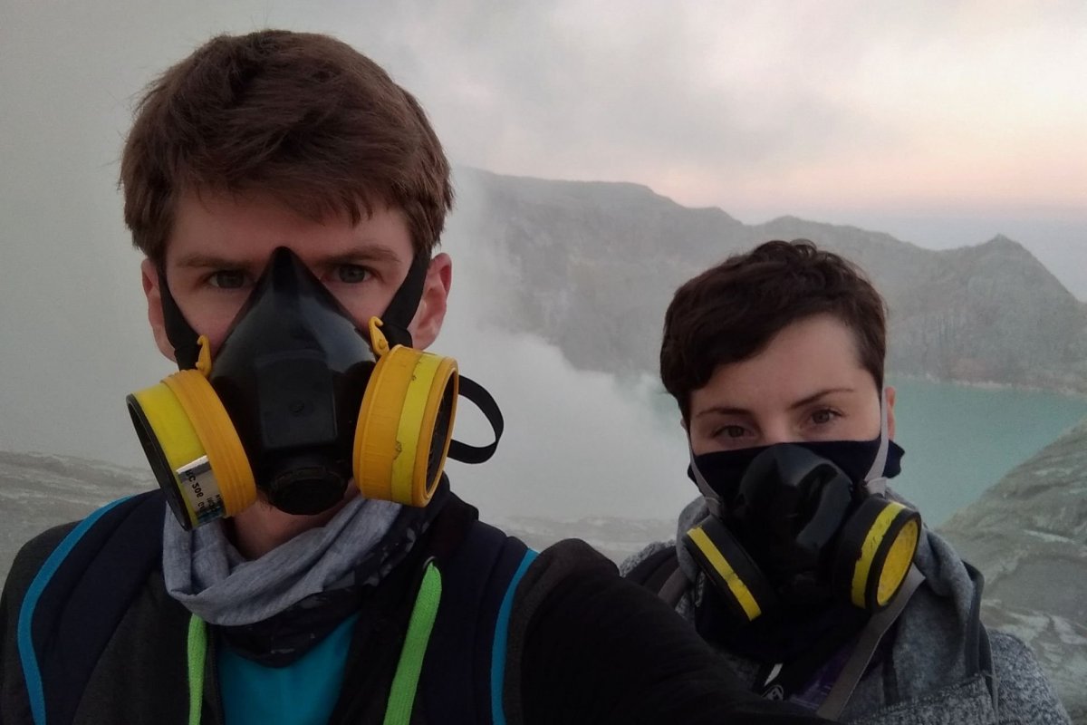 Podruhé za sebou vstáváme uprostřed noci, navlékáme na sebe vše co máme a napůl v kómatu nasedáme do auta. Na shromaždišti u úpatí sopky Kawah Ijen dostáváme dýchací masky a svižným tempem vyrážíme po strmé cestě. Výstup je dost jednotvárný a jediné zpestření představují místní taxikáři, kteří nabízejí vývoz nahoru na trakaři. Skupinka mladých Němců tuto službu zakupuje pro svou silnější kamarádku a tři Indonésani mají co dělat, aby ji do kopce vytlačili. Po cestě si taky můžeme něco koupit ve stánku, ale pití i svačinku jsme si přibalili s sebou.