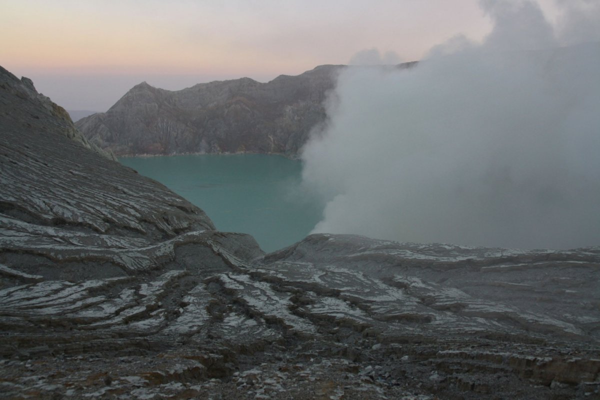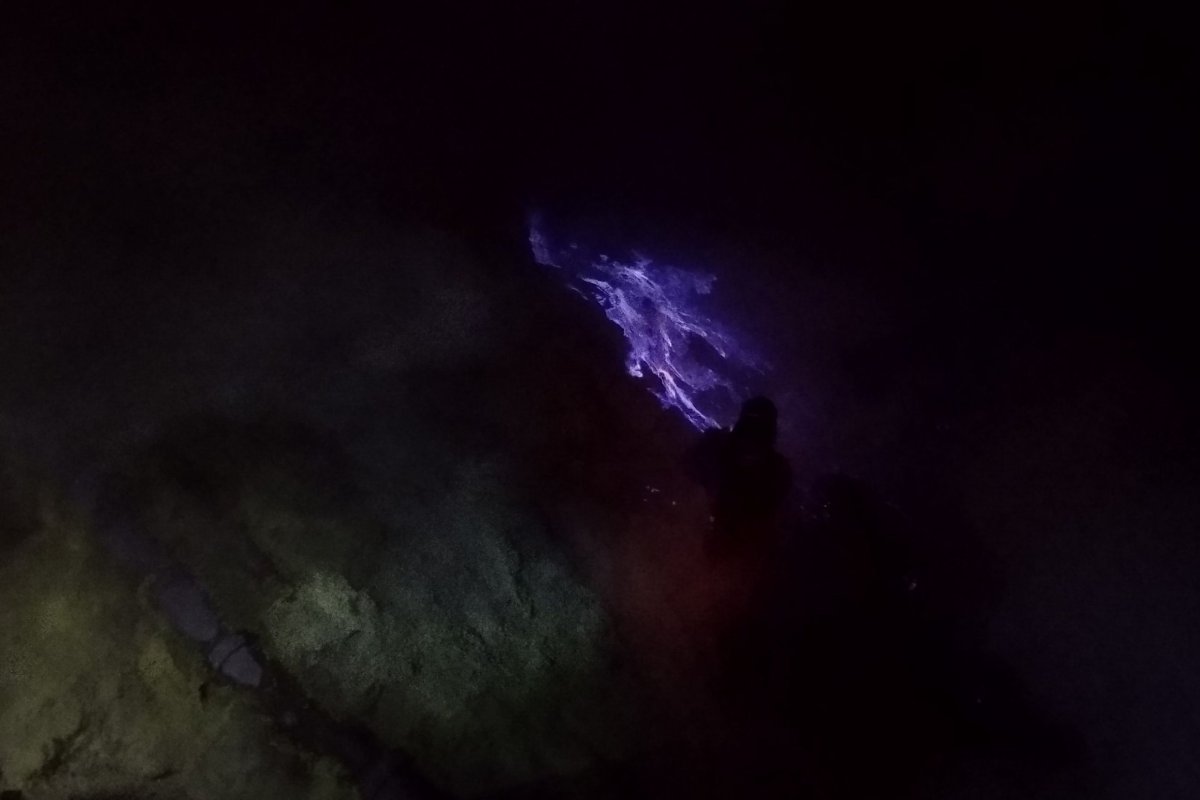Po dvou hodinách se ocitáme na okraji širokého kráteru a do nosů nás naplno zasahuje charakteristický sirný odér. Nasazujeme masky a teď vzhůru dolů do temné hloubky, kde se mihotají světla baterek. Cesta po kamenech je snadno schůdná, ale v postupu nás zpomalují haldy ostatních návštěvníků. Těch 200 výškových metrů na dno kráteru se tak zdá být nekonečných. Neustále pokukujeme po slavných modrých plamenech - jedinečnému jevu, ke kterému zde dochází v důsledku vyvěrání sirných výparů. Štěstí máme až na jednom místě téměř u dna. Chvíli co chvíli se bílé výpary rozestoupí a odhalí koberce modro-fialových plamenů oblizujících skály. To se každý den nevidí!