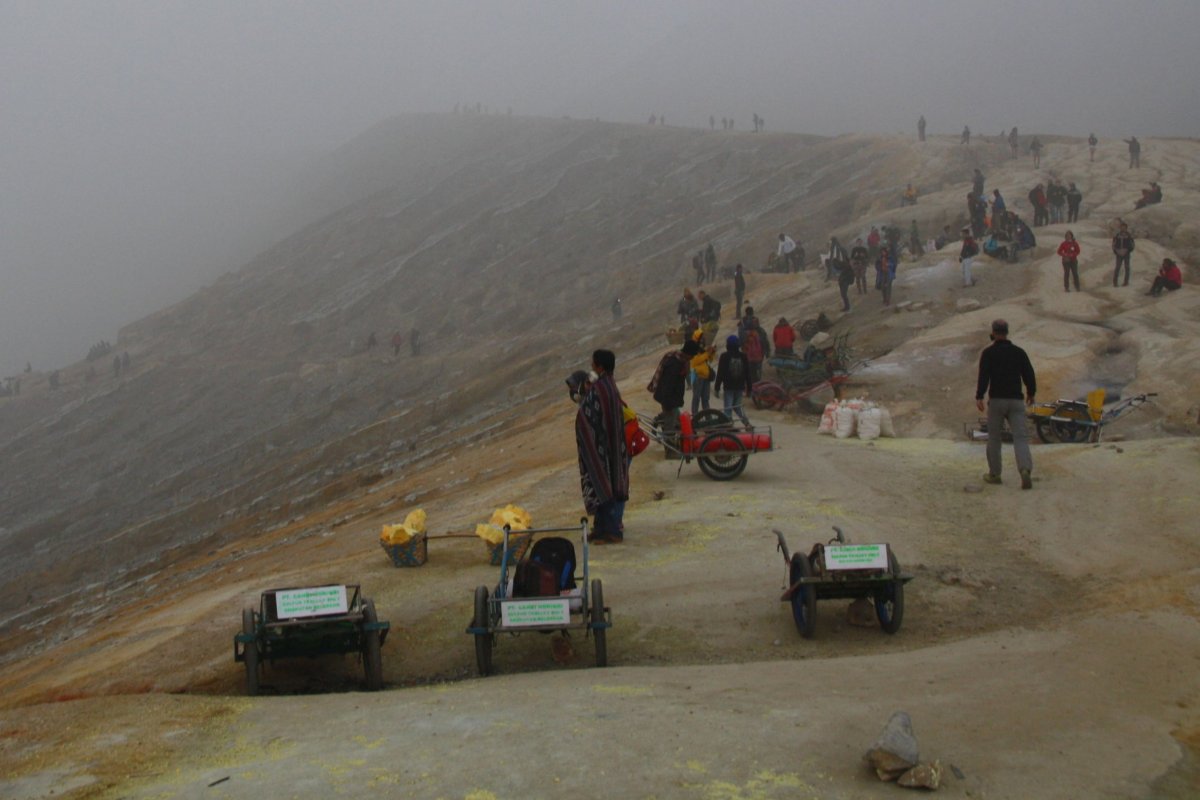 Stejnou cestou se škrábeme nahoru a potkáváme několik místních, kteří na ramenou ve dvou koších vynášejí kusy surové žluté síry. Po vynesení z kráteru s ní prý pokračují ještě 3km dále a tuto cestu absolvují dvakrát za den. Přemýšlíme, proč si tady nepostaví nějaký kladkostroj (ať už manuální nebo dokonce elektrický), neboť terén nám nepřijde nějak extrémně náročný. Ale zase by to nejspíš zaměstnalo mnohem méně lidí, v čemž bude zřejmě zakopaný pes.