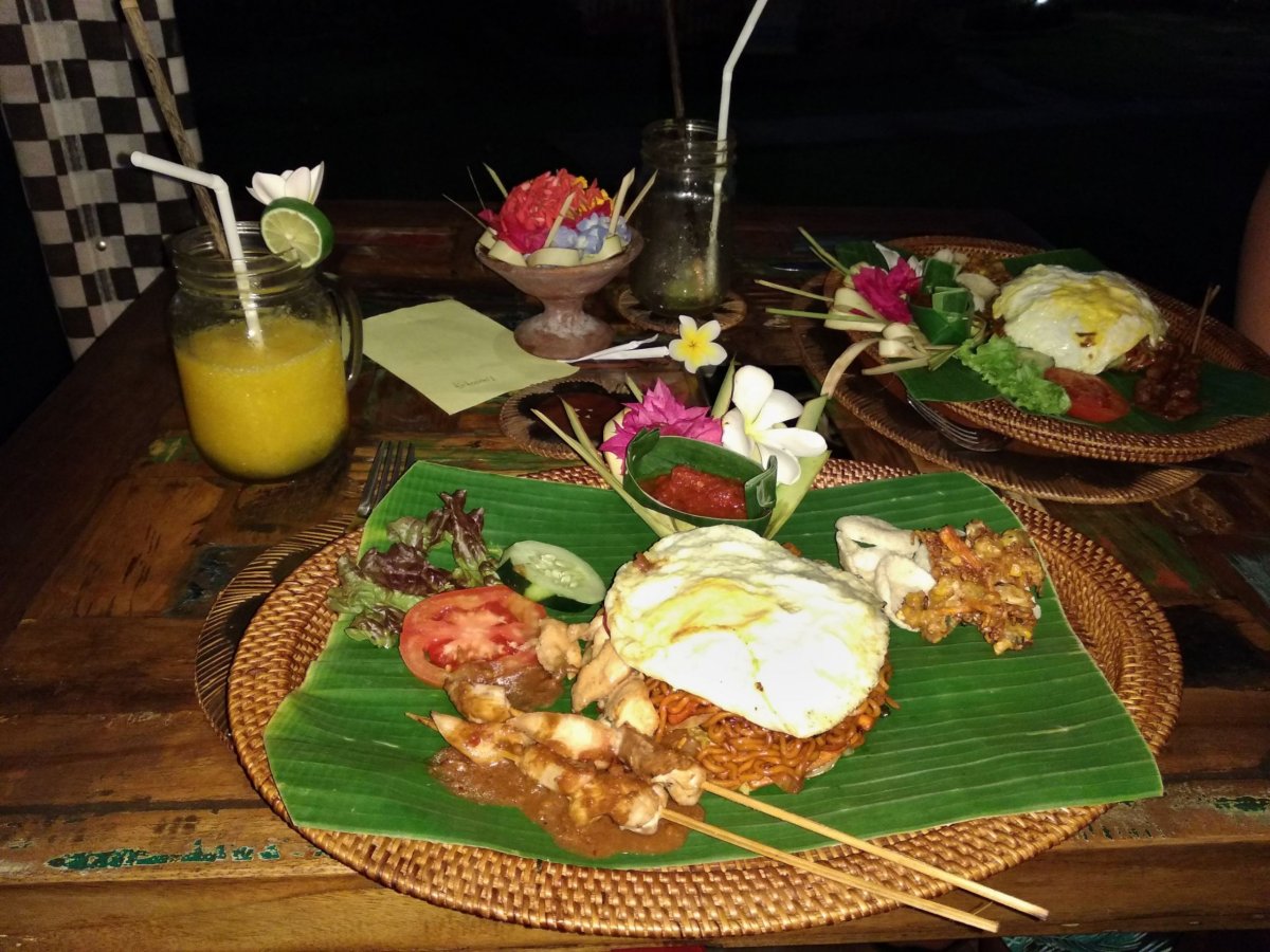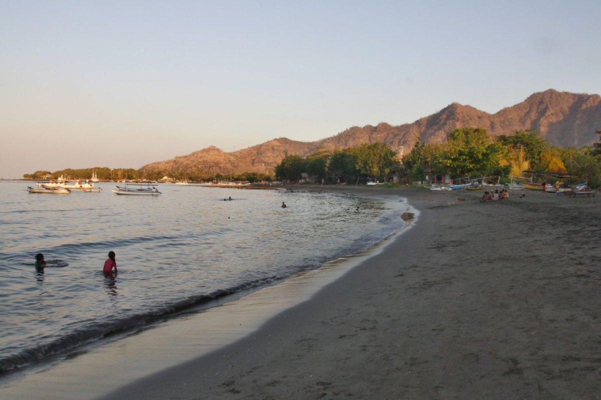 Za půl hodiny vyskakujeme v ospalé vesničce Pemuteran jen pár kroků od našeho guesthousu (PUTU Guest House). Na recepci se na televizi dívá čtyřletá dívenka, jinak nikdo není v dohledu. Na naše volání “hello” ale záhy odpovídá usměvavý mladík Putu, který to tu se svou ženou Komang vede. Uvádí nás do domečku skrytého mezi bujnou zelení, který disponuje i příjemnou teráskou s posezením. Ze všeho nejdříve odevzdáváme téměř všechno oblečení k vyprání, protože na ten sirný zápach by přemáchnutí v umyvadle nestačilo. A pak už vyrážíme k nedalekému moři, kde se procházíme po pláži s černým sopečným pískem, který je pro severní pobřeží typický. Po procházce se jdeme ještě smočit do bazénu, nad kterým je přidělený basketbalový koš. To je něco pro mě! Na večeři pak zkoušíme lepší restauraci a musím říct, že minimálně po stránce aranžmá to patřilo k nejlepším jídlům.